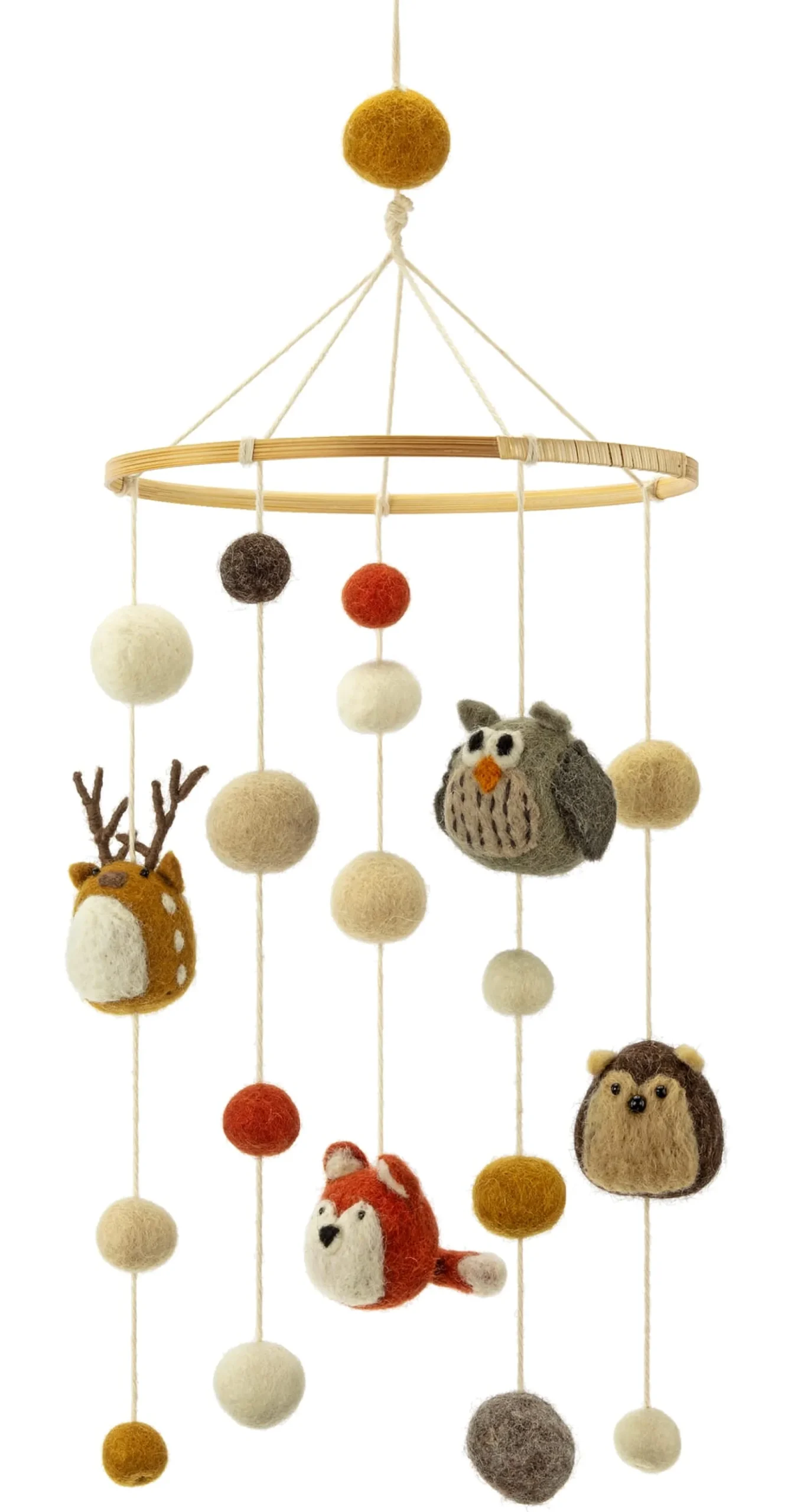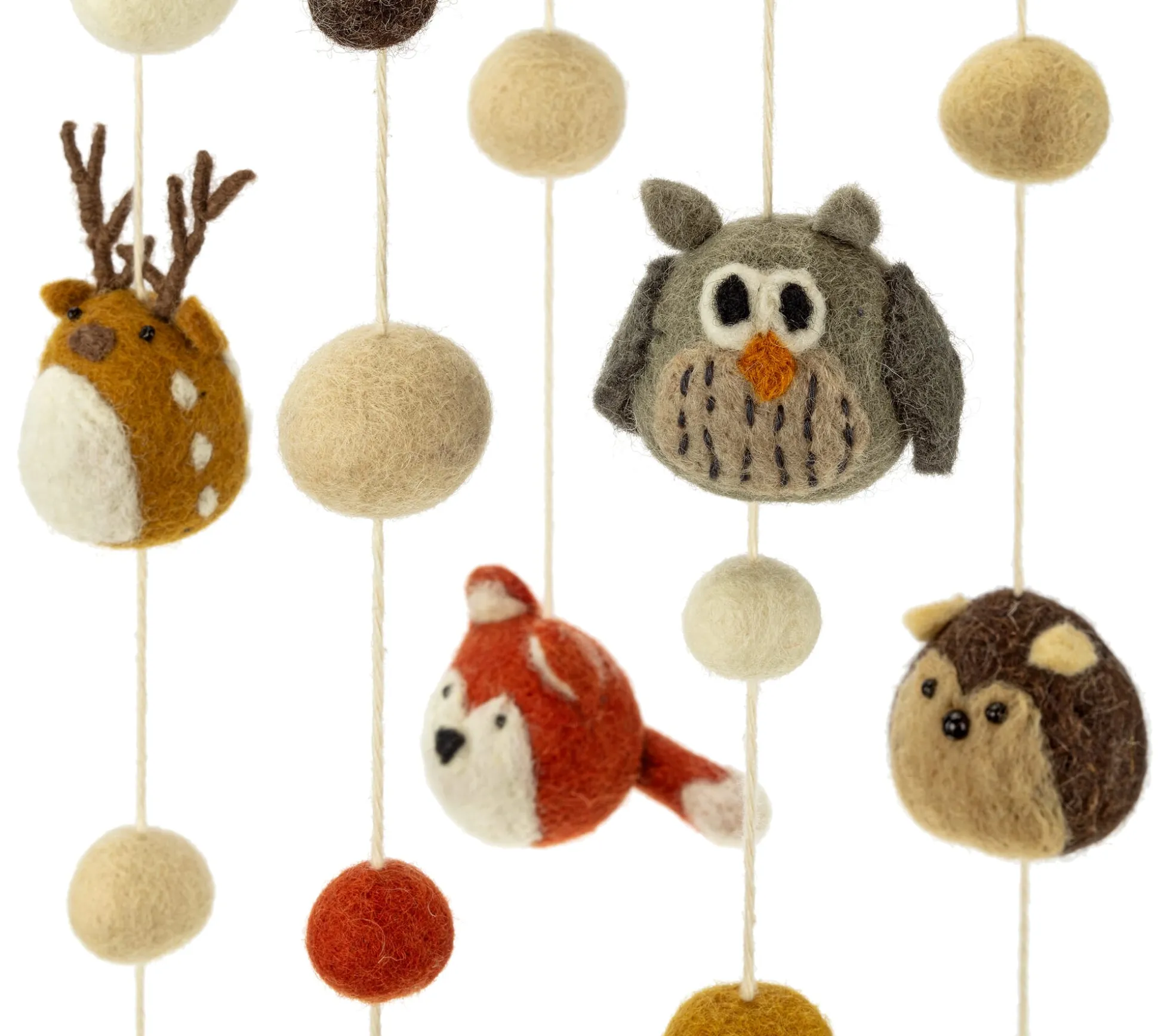 Filzkugeln (Ø 2–3 cm) in verschiedenen Farben und 4 Waldtiere (Höhe 5–8,5 cm), aufgehängt an 5 Baumwollfäden. Gesamthöhe 50 cm.