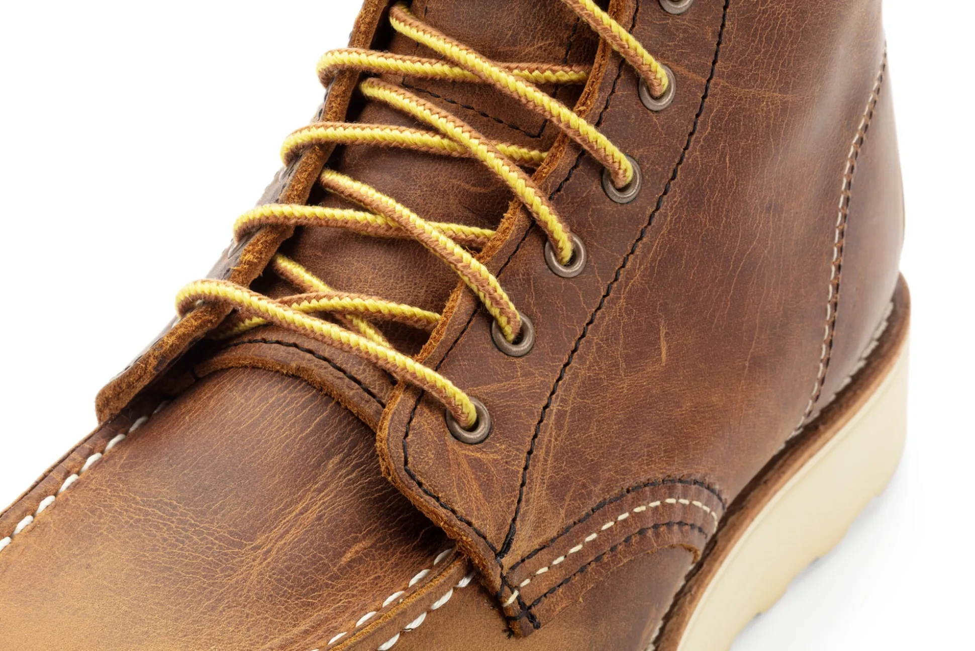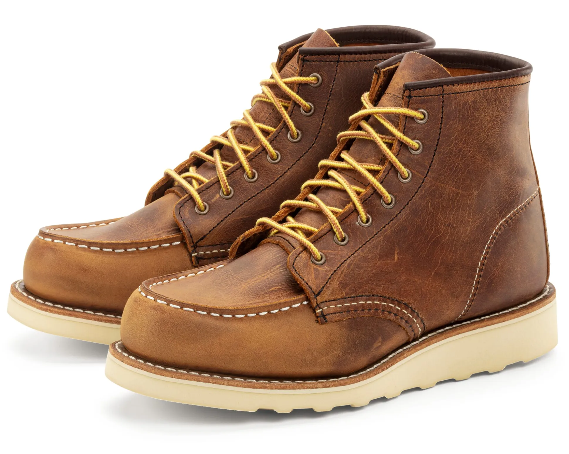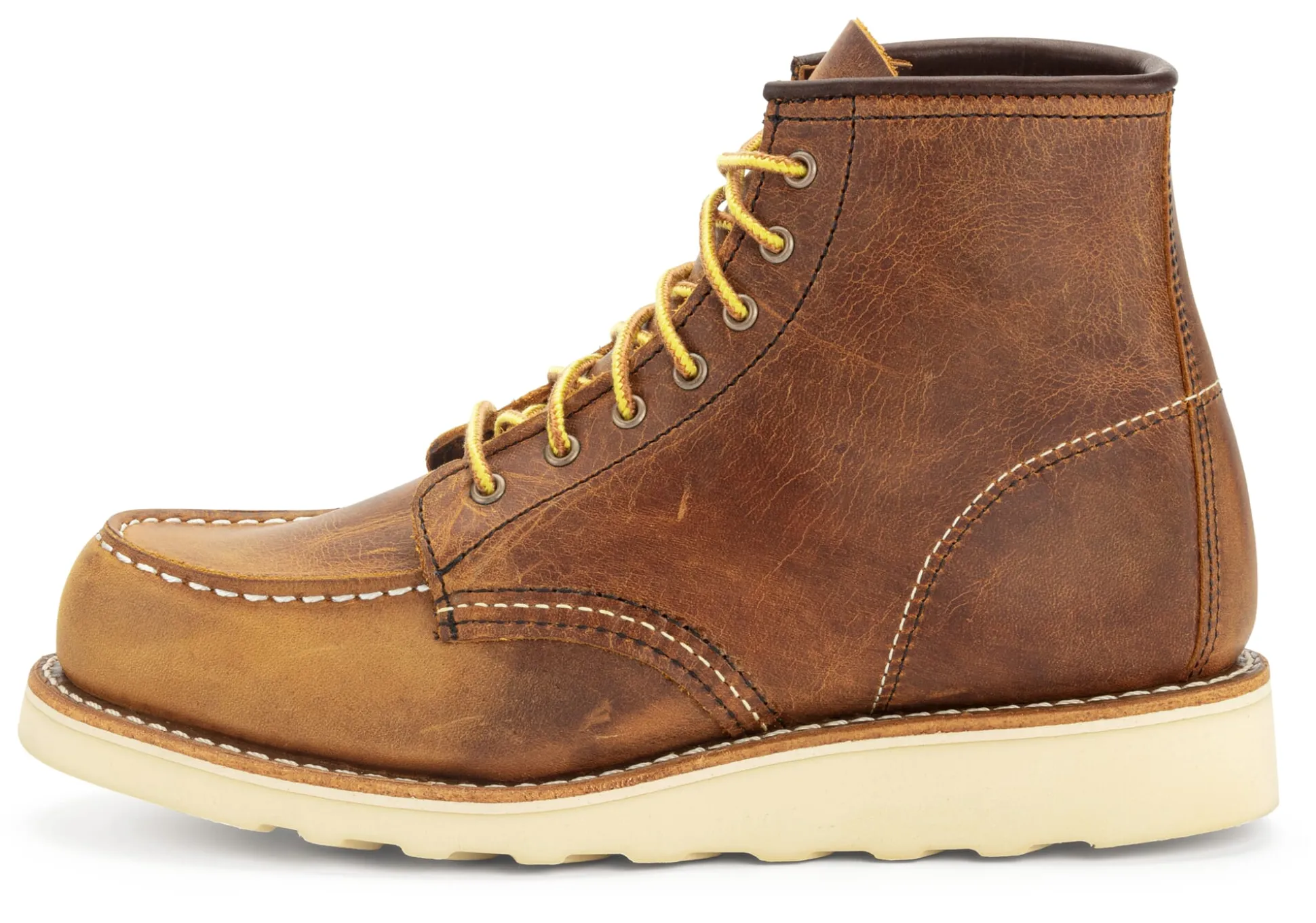 Dieser knöchelhohe Schnürboot mit geräumiger, an einen Mokassin erinnernden Spitze ist ein klassischer Arbeitsschuh der 1950er Jahre und das Flaggschiff des amerikanischen Schuhherstellers. Bezeichnend ist die markante Kreppsohle mit kälteisolierenden Eigenschaften. Das kräftige, mineralölgegerbte Rindleder entwickelt mit der Zeit eine schöne Patina. Die Kontrastnähte in Schwarz und Cremeweiß sind Red-Wing-typisch sorgfältig gearbeitet und damit auf eine lange Nutzungsdauer ausgelegt. Zum Moc Boot gehören klassisch gelbrote Schnürsenkel, eingezogen in sieben Metallösenpaare. Neben dem Herrenmodell stellt Red Wing den Schuh nun auch explizit als Damenmodell her – er wird dafür auf einem schmaleren Leisten produziert.