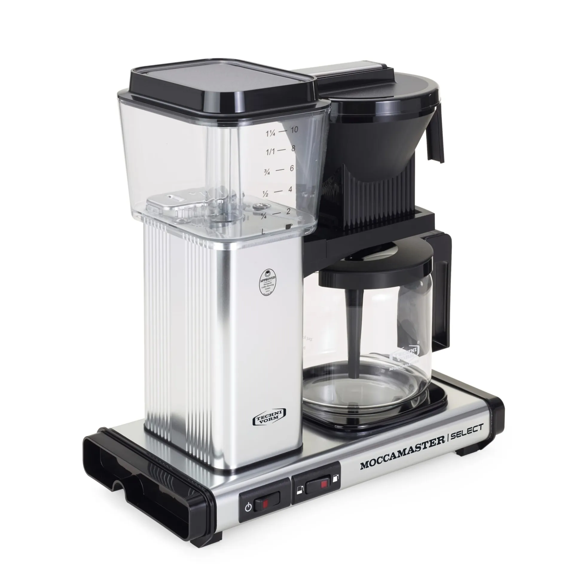 Mit automatischer Abschaltfunktion nach 40 Minuten. Gehäuse Aluminium. Glaskanne mit 1,25 l Volumen (10 Tassen). Wasserbehälter aus transparentem, Kannendeckel aus schwarzem Kunststoff. Filterhalter Größe 4. Leistungsaufnahme 1.350–1.520 W.