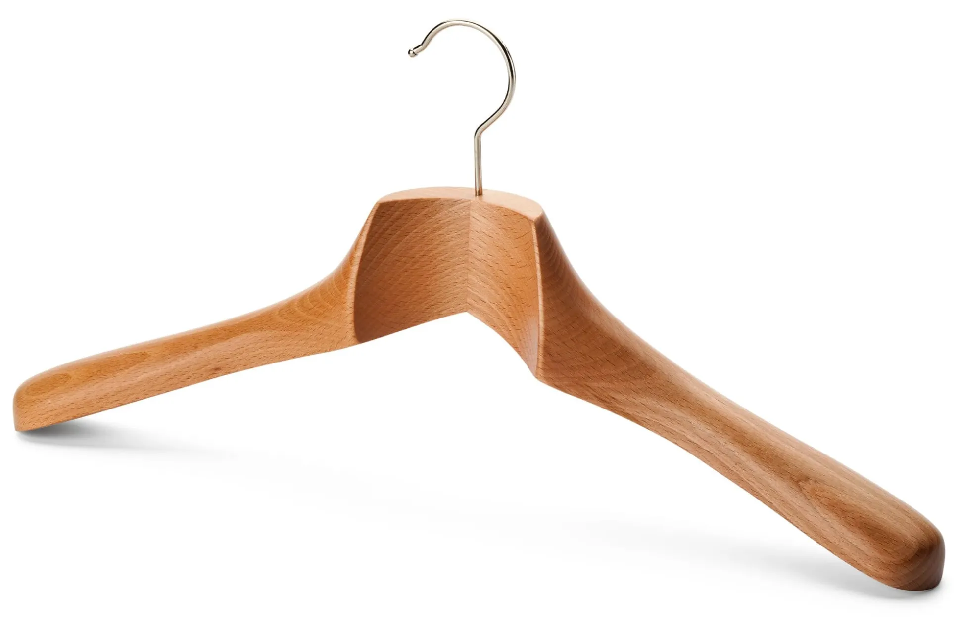 Ein gut ausgebildeter und durchaus schwerer, dabei körpergeformter Massivholzbügel, bei dem die Kragenform und die Schulterenden besonders stark ausgearbeitet sind.