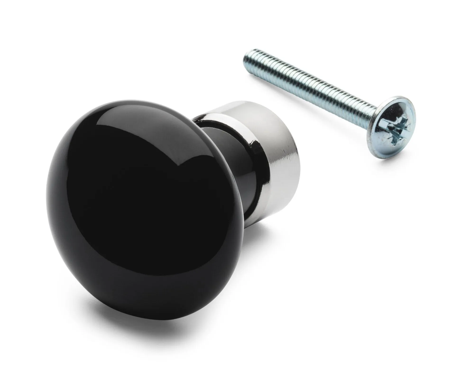 Rund gearbeiteter Knopf aus glasiertem Hartporzellan, je nach Ausführung in Weiß oder Schwarz. Sockel Messing, je nach Ausführung blank oder vernickelt. Knopf Ø 3 cm, Länge 3 cm. Gewicht 35 g. Eine passende Schraube (Länge 2,5 cm) zur einfachen Befestigung am Möbel liegt jeweils bei.