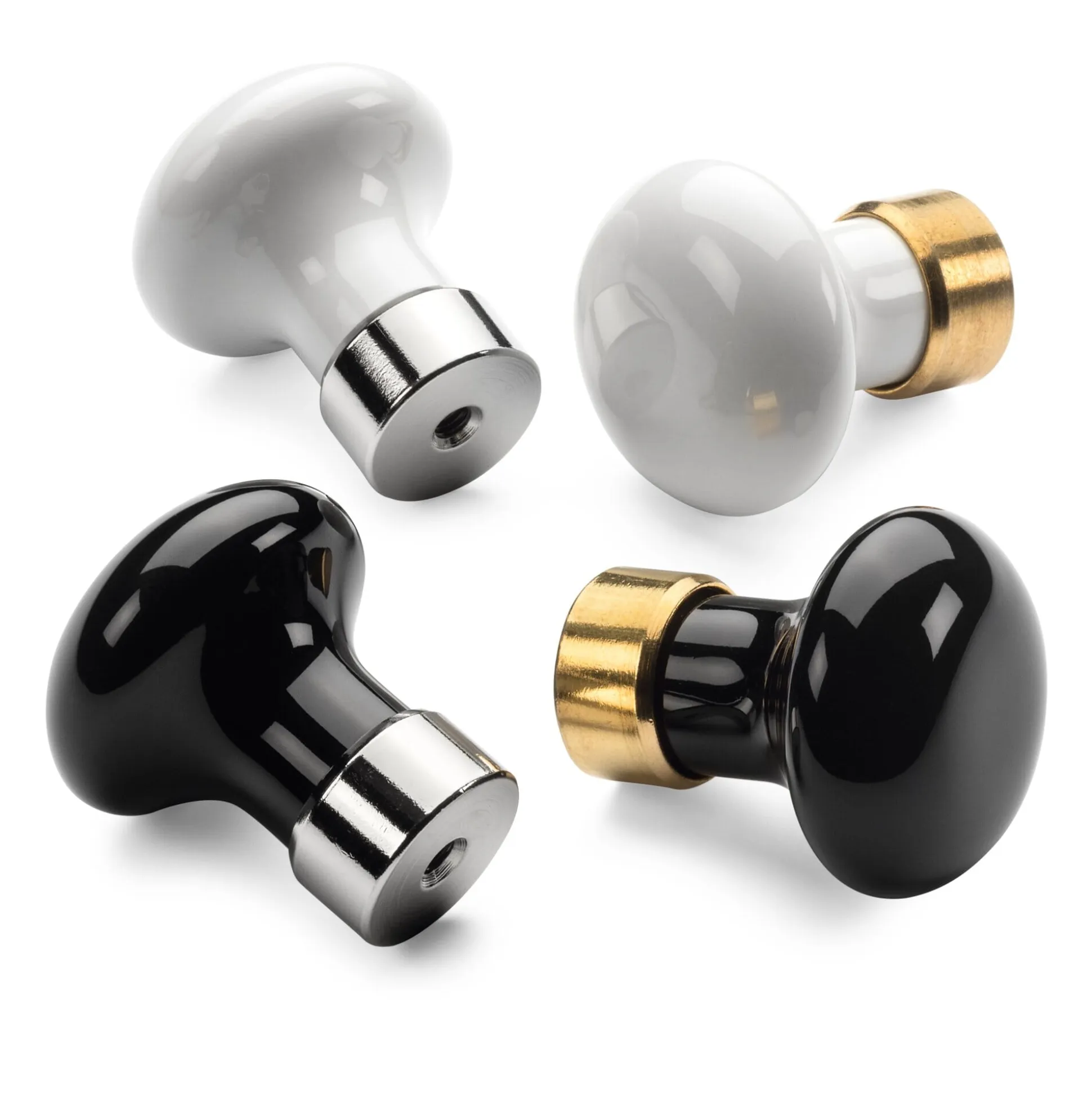 Die Stadt Limoges ist seit Jahrhunderten ein wichtiger Standort der Porzellanherstellung in Europa. An dieser langen Zeitspanne gemessen ist das dort ansässige Familienunternehmen Mérigous noch nicht sehr alt. Gegründet im Jahr 1954, hat sich der Betrieb allerdings von Beginn an auf die Fertigung von Möbelbeschlägen sowie Tür- und Fenstergriffen aus Porzellan spezialisiert. Die hier angebotenen Möbelknöpfe zählen zu den Klassikern des Sortimentes. Sie werden in Metallformen gegossen, bei Temperaturen um 1.400 °C im Ofen glattgebrannt und glasiert. Die jeweiligen Sockel werden passend dazu aus Messing gefertigt.