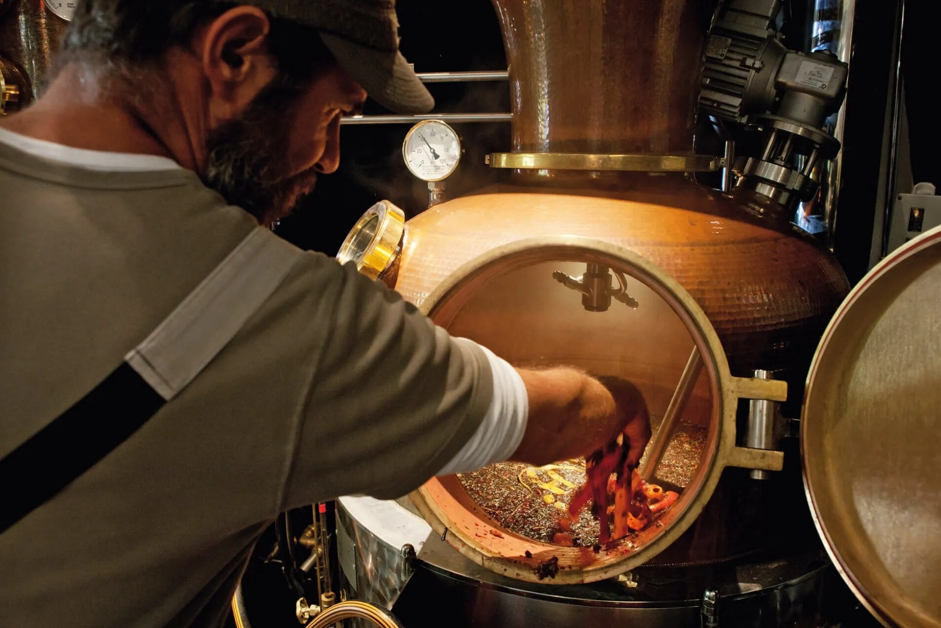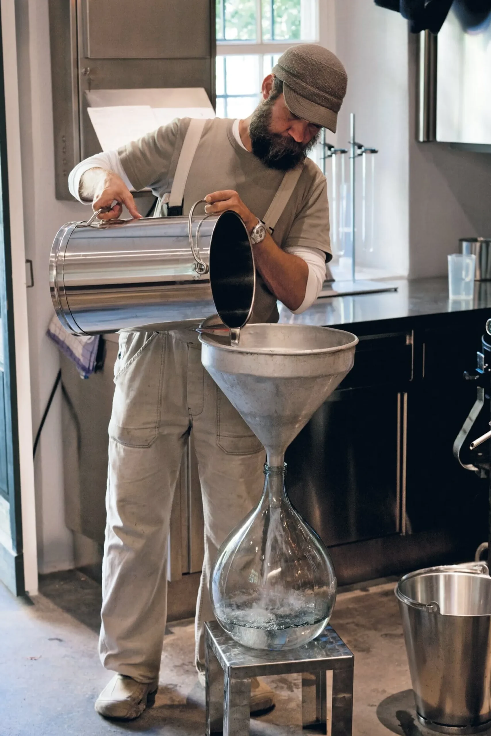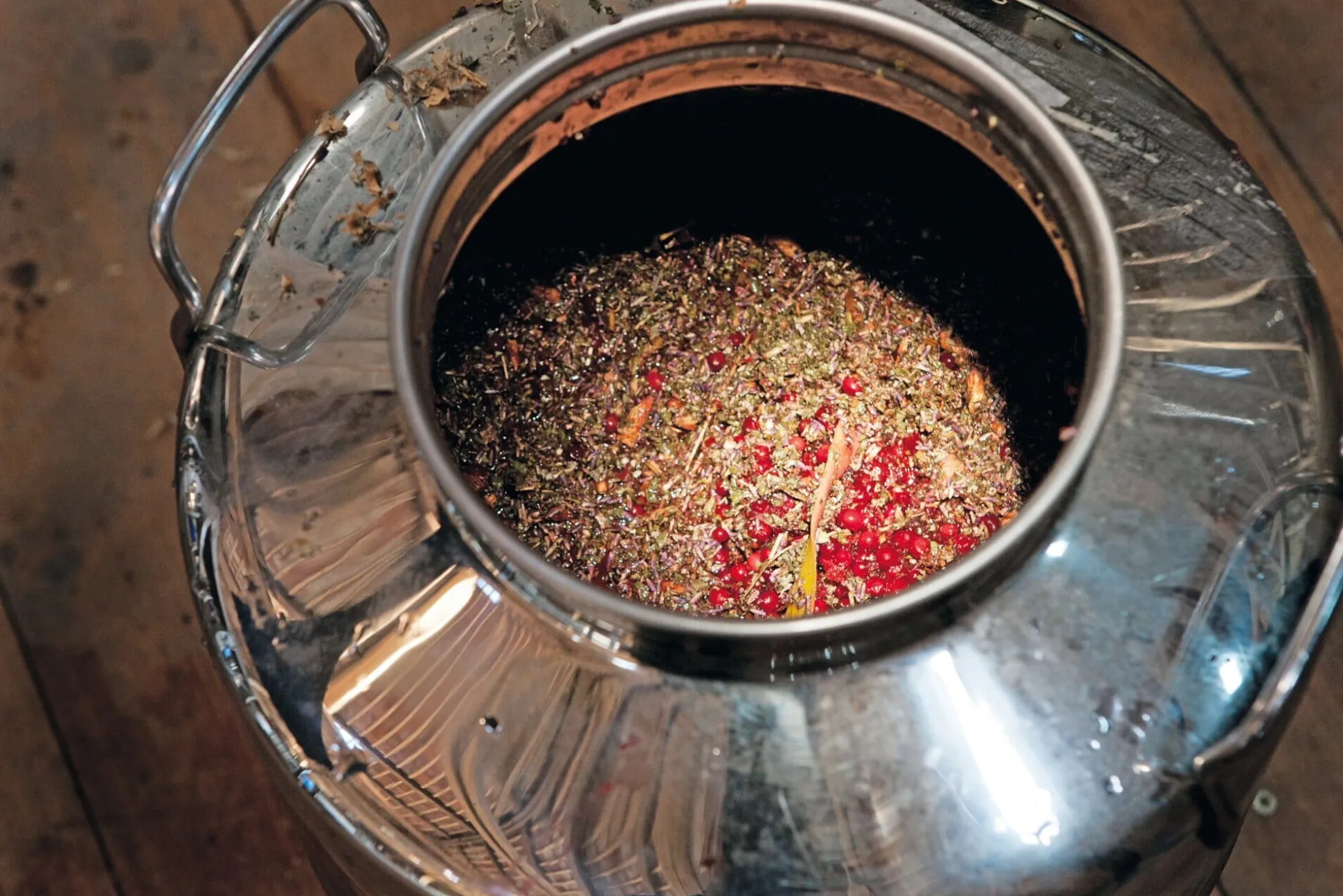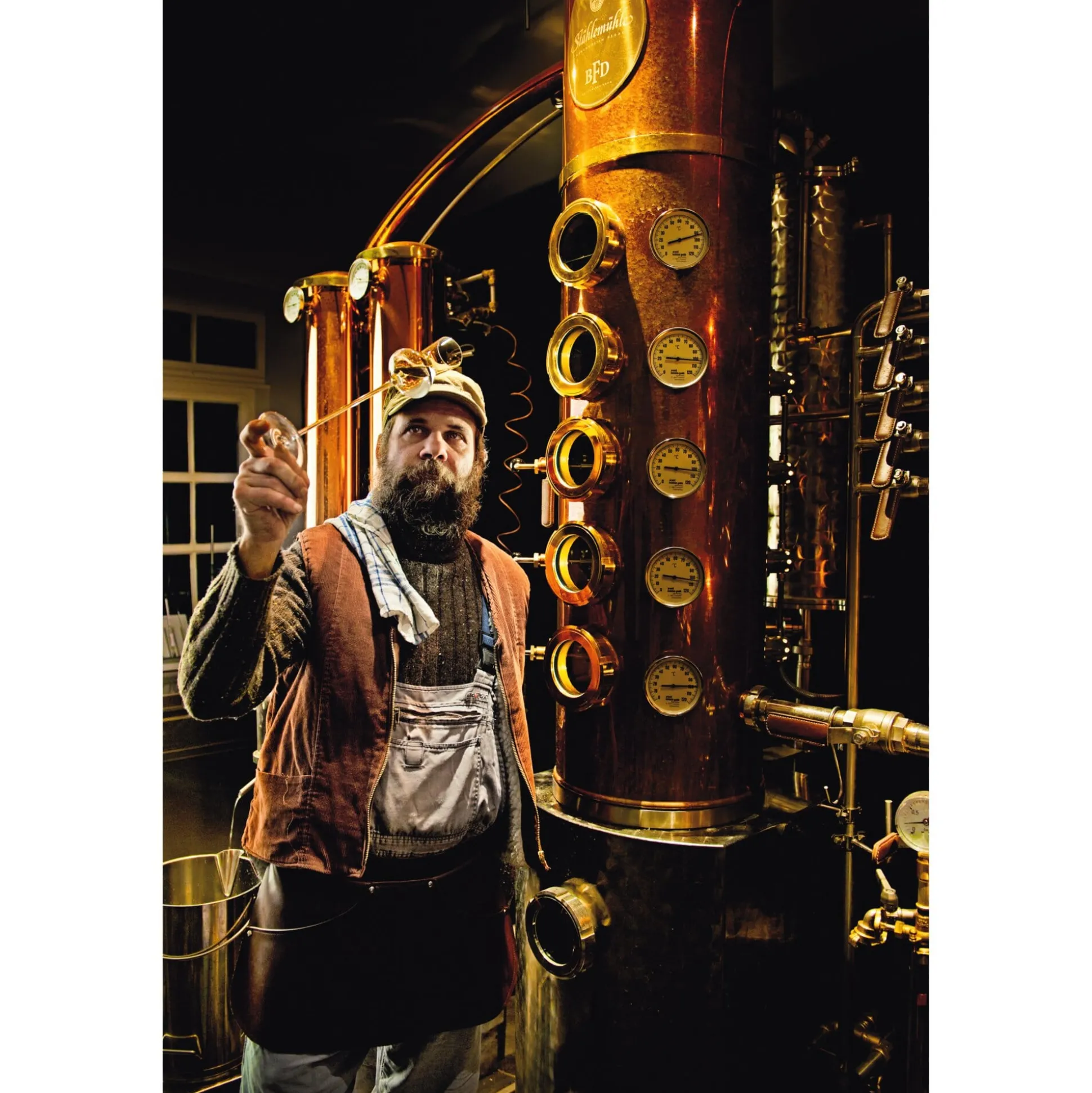 Rund 40 Jahre später kommen Alexander Stein und Christoph Keller ins Spiel. Stein, Sproß einer traditionsreichen Baden-Württemberger Brennerfamilie, und Keller, einer der renommiertesten Destillateure Europas, belebten 2008 die zufällig wiederentdeckte Rezeptur neu und verfeinerten sie in einem langen Auswahlprozess. An dessen Ende steht ein Destillat aus 47 Zutaten, angesetzt mit weichem Wasser aus hauseigener Quelle. Gut ein Drittel der Ingredienzien – darunter Fichtensprossen, Preiselbeeren, Hagebuttenschalen, Holunderblüten, Schlehen, Brombeerblätter und Goldmelisse – kommt aus dem Schwarzwald. Das Destillat reift drei Monate lang in Steingutgefäßen, wobei es durch die Sauerstoffeinwirkung ausgewogener wird. Danach wird es – wieder mit dem eigenen Quellwasser – auf Trinkstärke herabgesetzt.