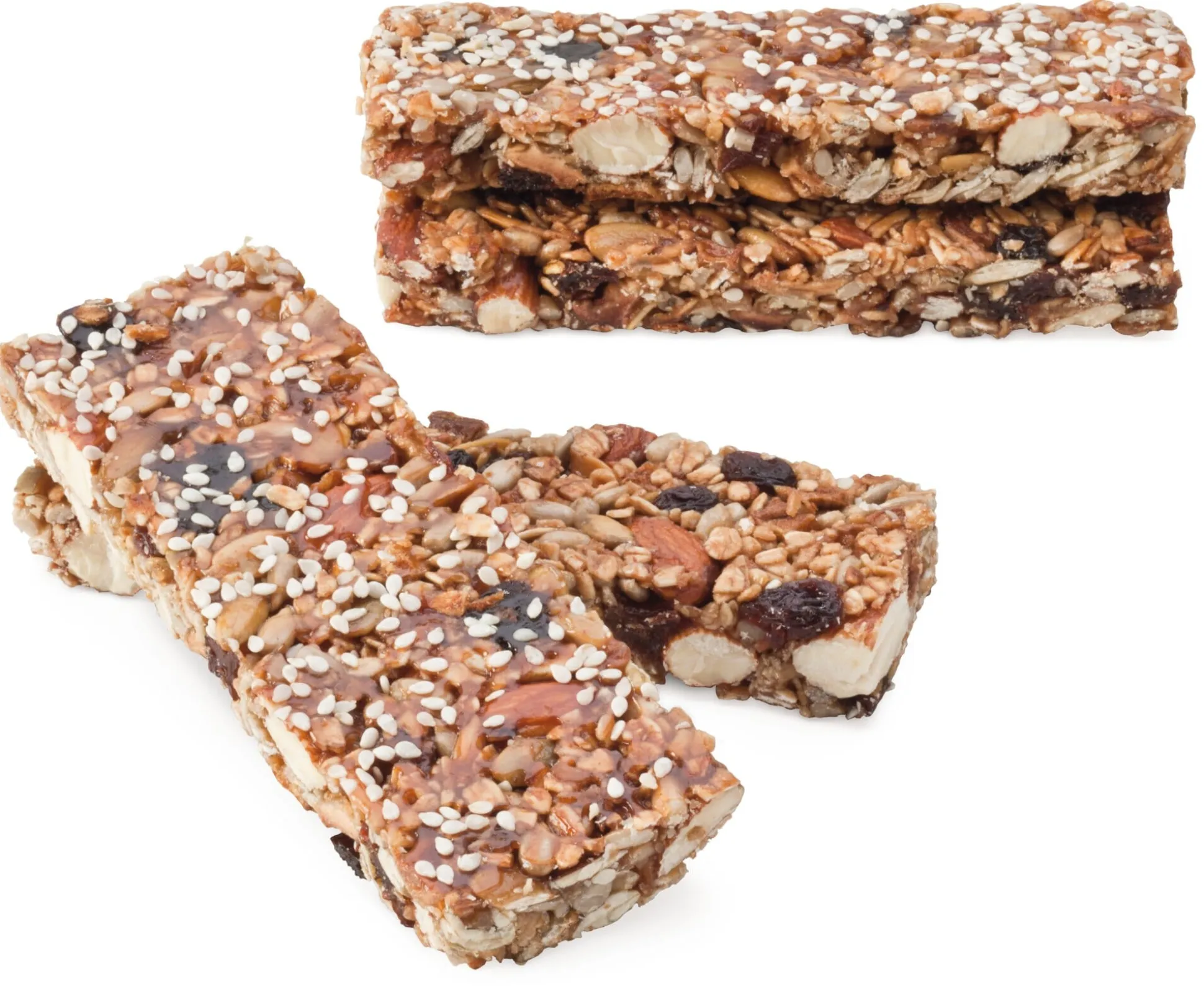 Durch eine kräftige Portion Honig und die Zugabe von Sahne wird dieser Müsliriegel besonders aromatisch, vor allem ist er saftig und knackig durch Haferflocken, Mandeln, Rosinen, Sesam, Kürbiskerne und getrocknete Äpfel.