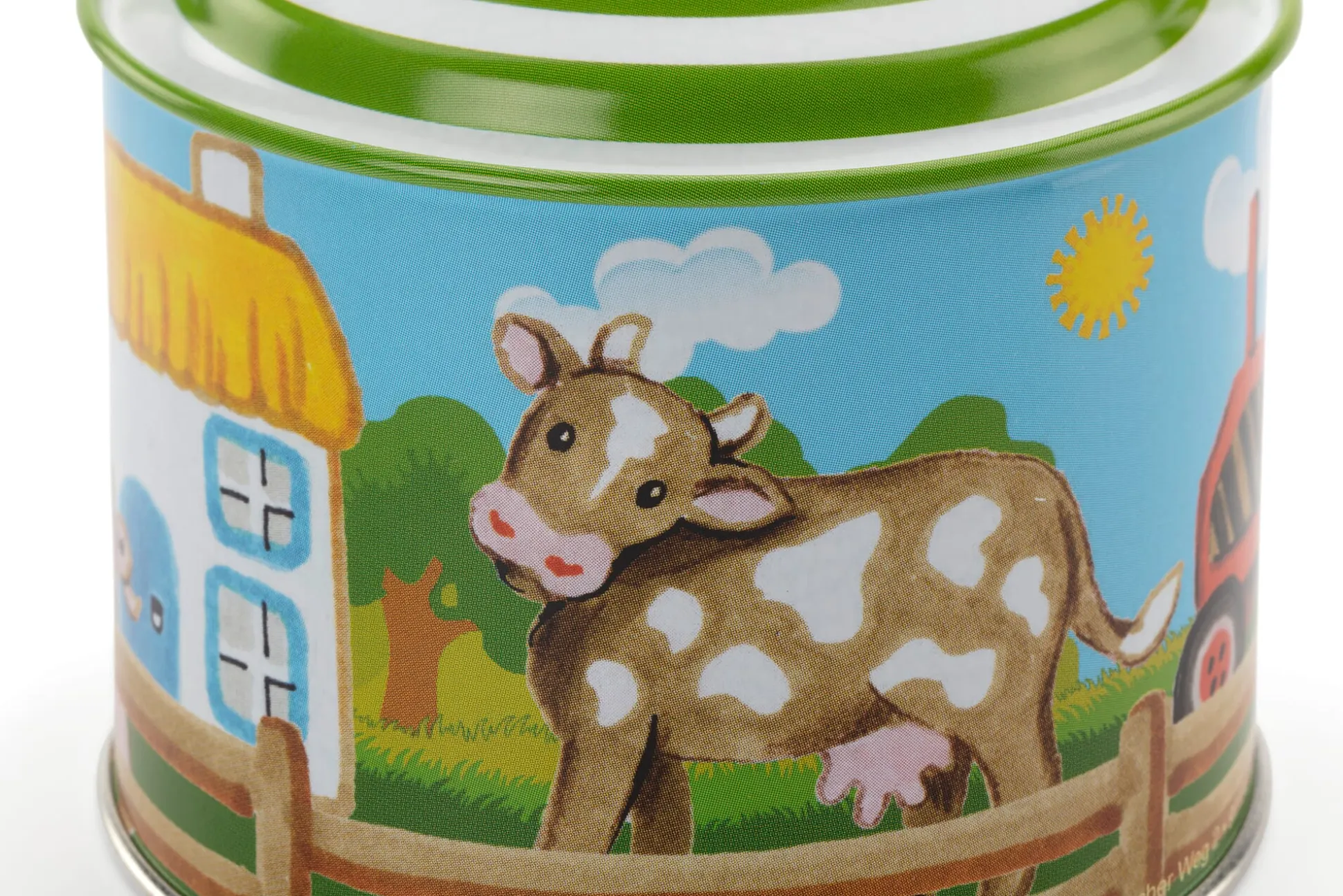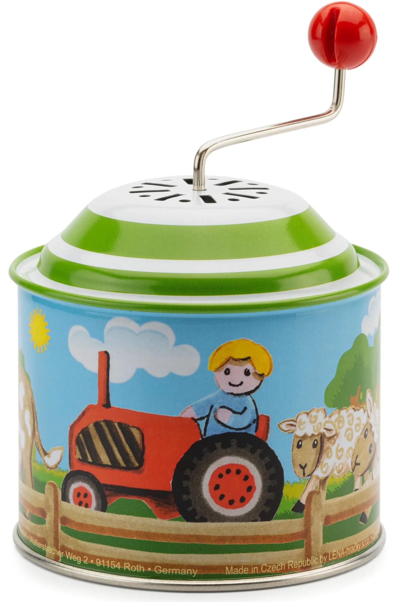 … Spieldose! Diese aus robustem Stahlblech gefertigte und mit einem Bauernhof-Motiv farbenfroh gestaltete Musikdose animiert alle Farm- und Kinderzimmer-Bewohner*innen, zur Melodie von „Old MacDonald had a farm“ ein kleines Tänzchen hinzulegen. Wie schnell sich die Tänzer*innen zu der Musik drehen, wie laut und fröhlich sie das Lied mitsingen, hängt ganz davon ab, wie flüssig Ihr Kind die Kurbel dreht. Im Umgang mit der Musikdose trainiert es also spielerisch leicht seine motorische Koordination – vermutlich mit großem Spaß und daher recht ausdauernd, deshalb machen Sie sich auf einen Ohrwurm gefasst.