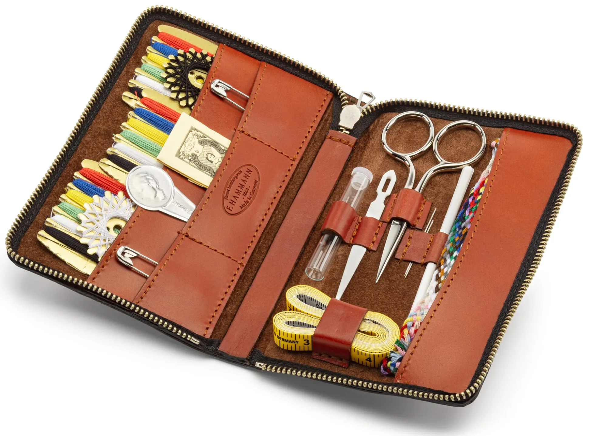 Dieses kleine, feine Lederetui enthält eine Grundausstattung an Nähutensilien für zu Hause oder unterwegs, um kleinere Näharbeiten ausführen zu können: eine Solinger Stickschere, eine Fadendurchzieher, einen Nadelköcher, ein Maßband, je vier Sicherheits- und Handnähnadeln, einen Nadelbrief, einen Einfädler, drei farblich sortierte Garnkärtchen und einen Garnzopf.