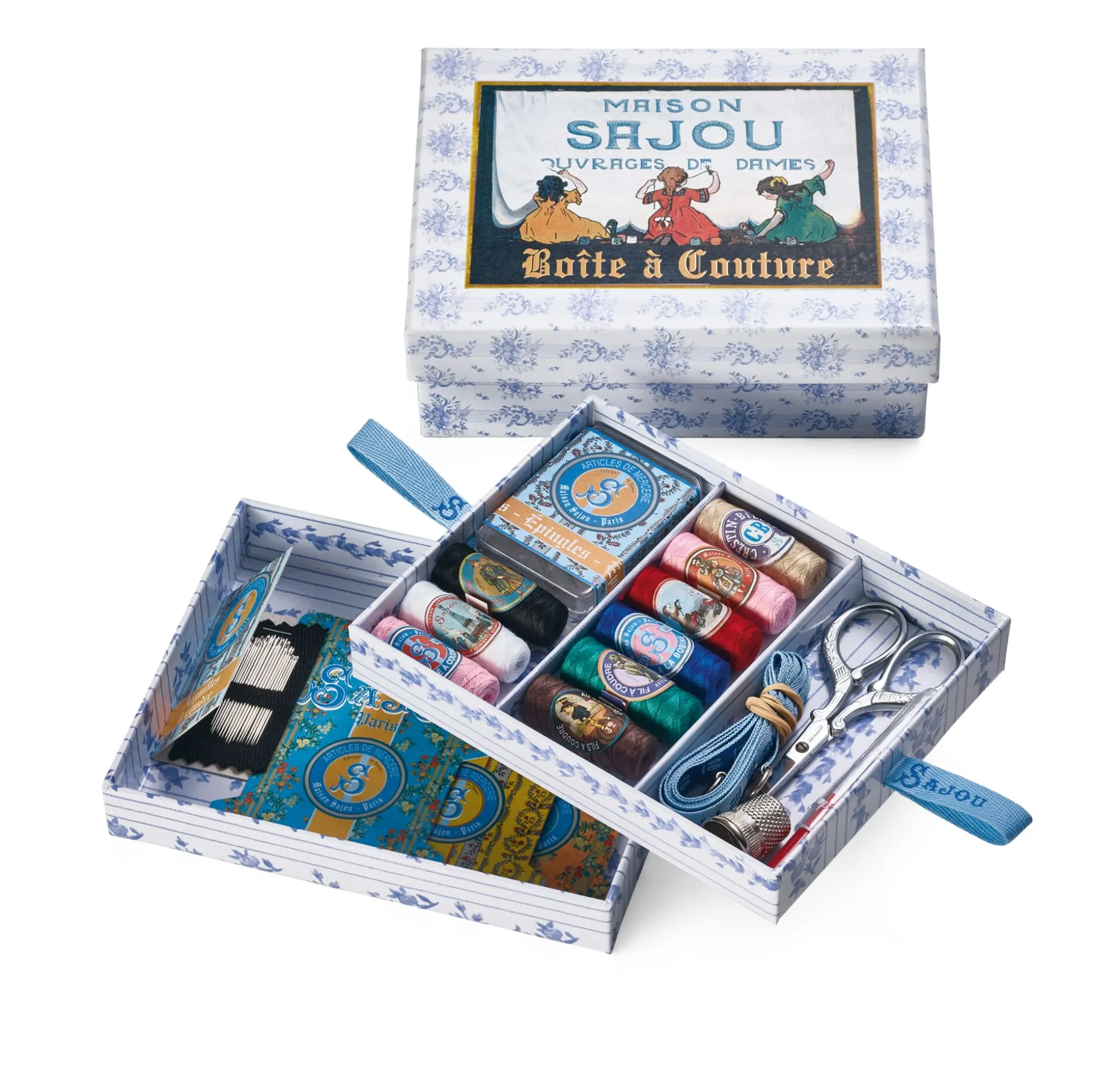 Die Nähschatulle von Sajou, gefertigt aus kaschiertem Karton und bedruckt mit hübschen Motiven aus der Zeit um 1900. Eine Schatulle mit zwei Fächern, die wir befüllt mit den wichtigsten Nähutensilien anbieten.