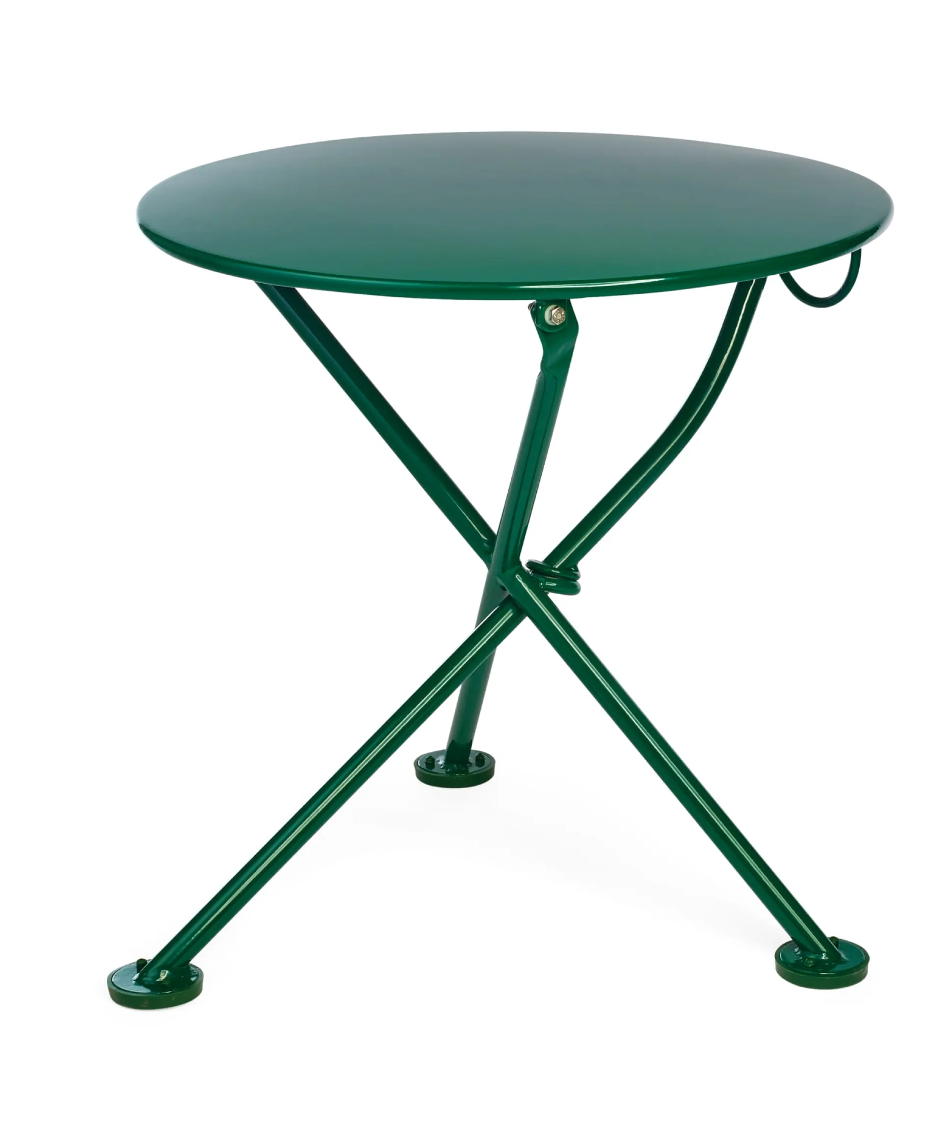 Als Kaffeehaustisch kennen Sie dieses Möbel aus unserem Sortiment. Wir lassen den Tisch aus pulverbeschichtetem und darunter feuerverzinktem Stahl jetzt in einer zweiten, verkleinerten Ausführung fertigen: als Beistelltisch für Liegestühle, auf dem Balkon und im Wohnraum als Kaffeetisch oder um darauf Blumentöpfe hübsch zu arrangieren. Der geniale, einfach zu bedienende Klappmechanismus – zwei der drei Tischbeine bilden unter der runden Platte ein festes Kreuz und das dritte läuft quer dazu in einem feststehenden Ring – ist der gleiche wie bei dem hohen Klapptisch für den Balkon und funktioniert gewohnt zuverlässig. Der weite Ring, der seitlich an der Tischplatte befestigt ist, dient dazu, diesen Mechanismus zu betätigen. Auf seinen massiven, durch vergrößerte Fußkappen zusätzlich stabilisierten Füßen steht der niedrige Balkonklapptisch fest, ohne zu wackeln.