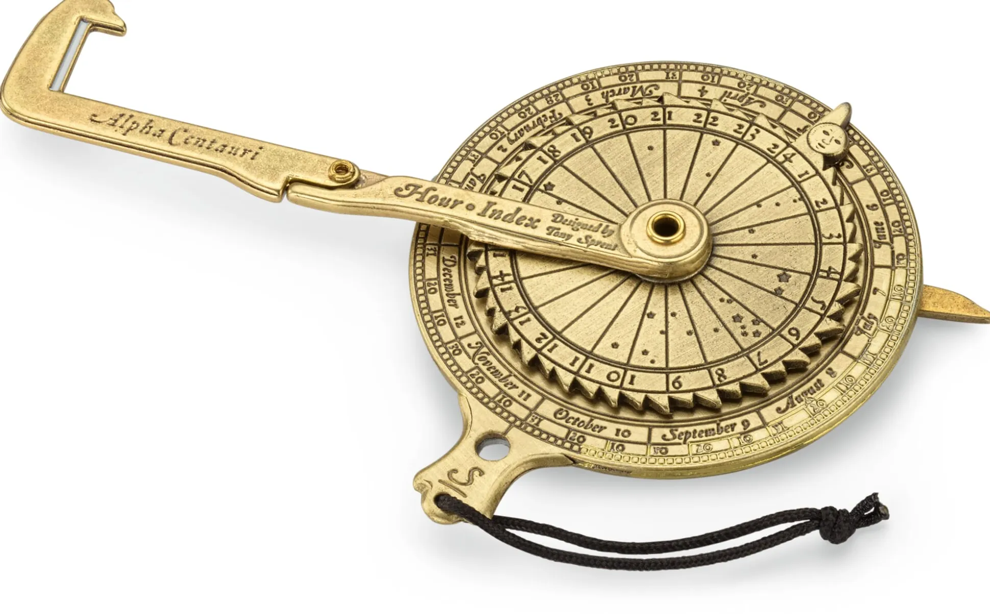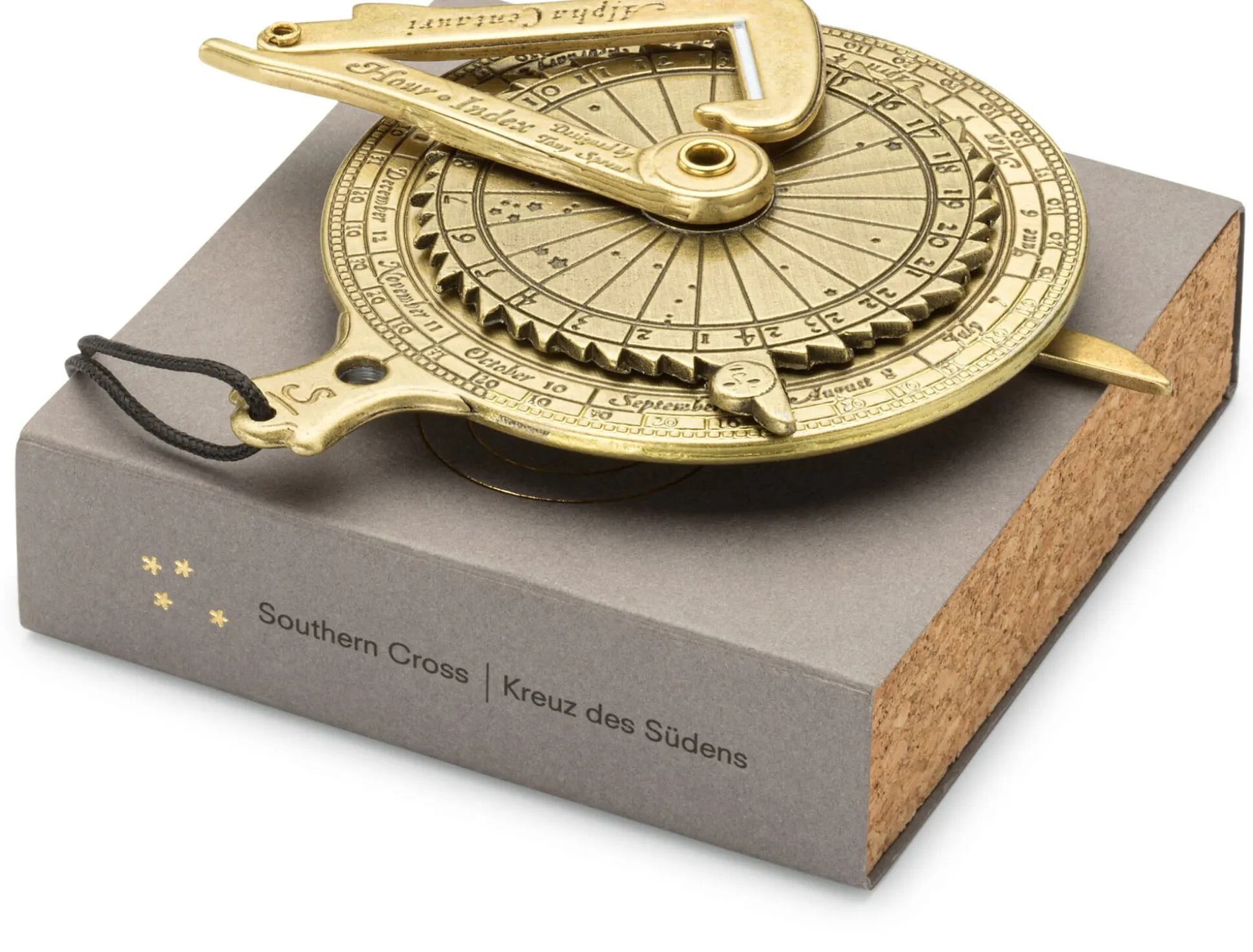 Die Besonderheit unserer aus massivem Messing und Stahl gefertigten Sternenuhr: Mithilfe ihrer Rückseite können Sie die nächtliche Uhrzeit auch dann bestimmen, wenn Sie sich auf der Südhalbkugel befinden. Bislang war die Funktion einer solchen Sternenuhr auf die Nordhalbkugel beschränkt, seit 2023 lassen sich dank dem australischen Naturwissenschaftler Tony Sprent auch die Konstellationen des nächtlichen Südhimmels für die Ortszeitbestimmung nutzen: Dazu peilen Sie das Kreuz des Südens sowie die Sterne Alpha und Beta Centauri im Sternbild Zentaur (Centaurus) an.