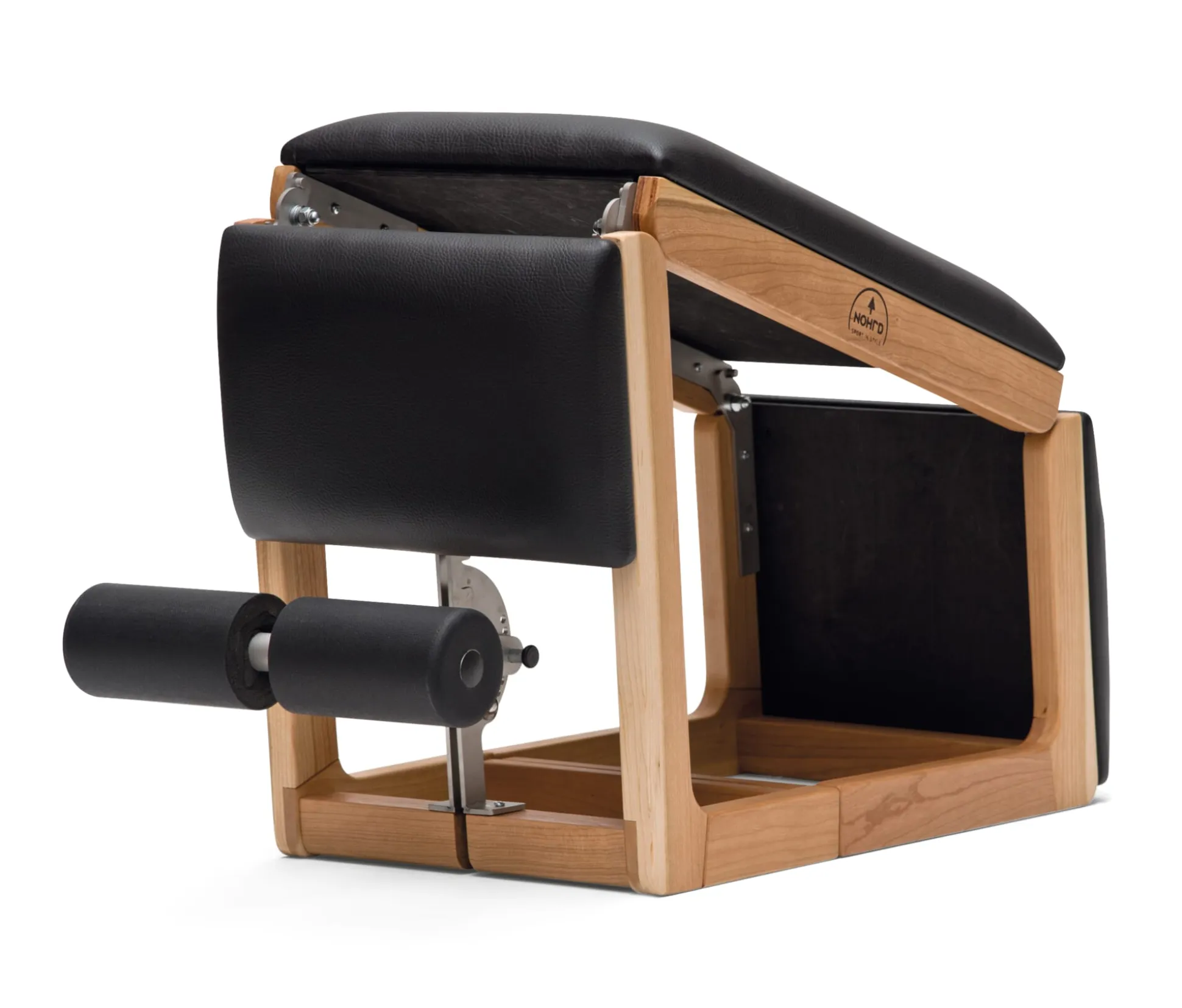 Als Fitnessgerät dient der TriaTrainer von Nohrd dem Training von Bauch-, Rücken- und Gesäßmuskeln. Viel treffender wäre es jedoch, ihn als Fitnessmöbel zu bezeichnen, denn er kommt als veritables Möbelstück daher – als solches ist er zwar nicht unbedingt zu nutzen, dennoch ist er in bester Schreinermanier verarbeitet: Der Rahmen wird aus massivem, deutschem Holz gefertigt, seine beweglichen Teile sind über stabile Metallscharniere verbunden, auch der Stellmechanismus der Fußstütze ist aus Metall. Die Polsterung aus Schaumstoff ist mit schwarzem Kunstleder bezogen. Dank Material, Design und dem geringen Platzbedarf (eingeklappt benötigt er gerade einmal 90 × 35 cm Standfläche) können Sie den TriaTrainer also getrost in Ihre Wohnung stellen, er wird allenfalls durch die asymmetrische Form auffallen. Diese ist durch seine verschiedenen Funktionen bedingt.