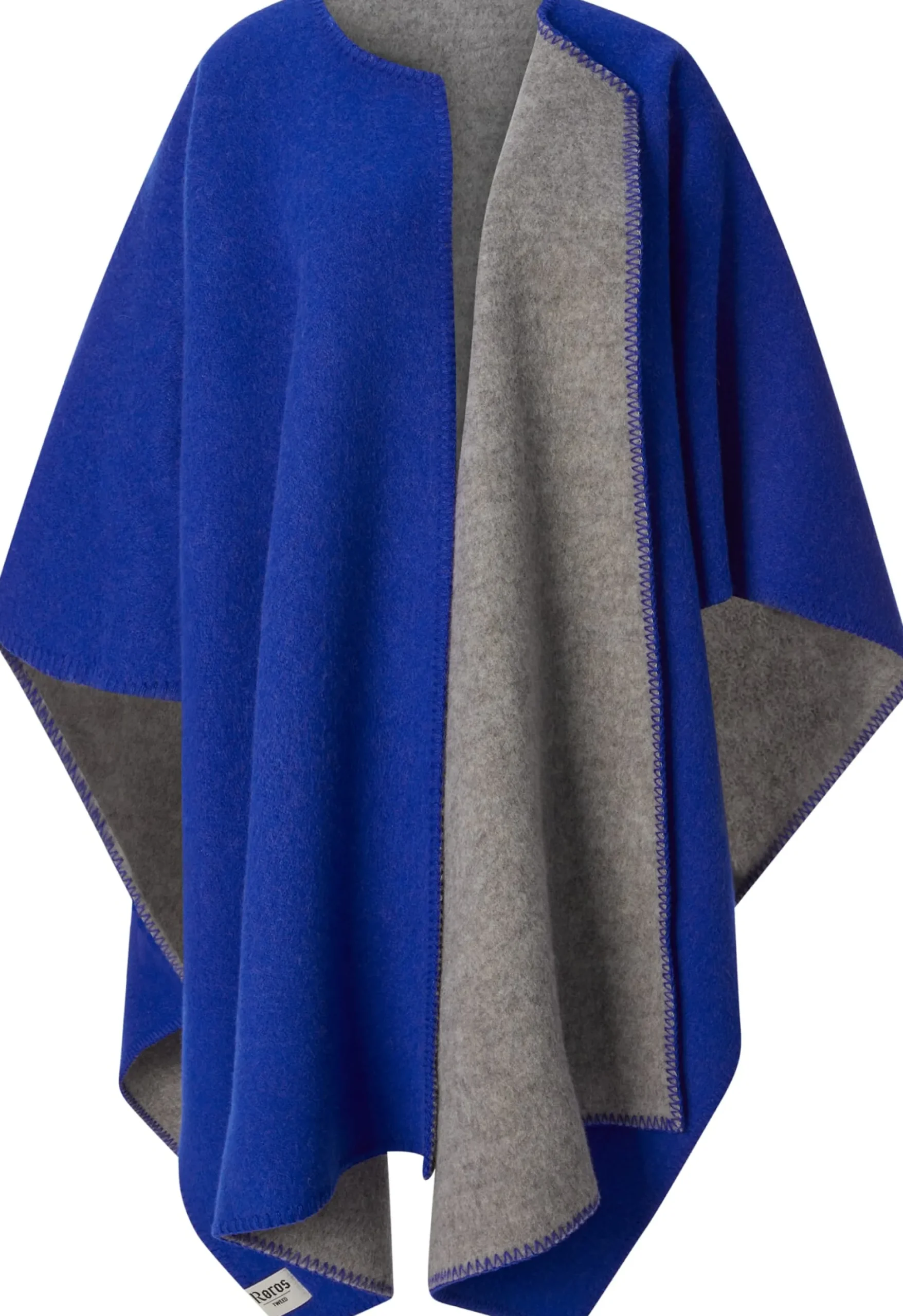 Als Doubleface mit verschiedenfarbigen Seiten gewebt und an den Kanten sauber umkettelt, lässt sich der Poncho beidseits tragen. Durch den Einschnitt im Vorderteil wird der Poncho streng genommen zu einer Ruana – zumindest im südamerikanischen Raum, wo man auch sprachlich zwischen der geschlossenen und der offenen Form unterscheidet. Der Poncho ist insgesamt sehr großzügig geschnitten: Mit zwei Metern Breite ist er groß genug, um sich darin rundum einwickeln zu können. Selbst die Schultern sind bedeckt und – Vorteil Poncho – bleiben es naturgemäß auch, weil ein Poncho nicht so leicht verrutscht. Dank seiner Rückenlänge von einem Meter reicht der Poncho auch groß gewachsenen Menschen locker über die Knie, sodass sie immer und überall warm und weich auf dem Wollgewebe sitzen. Dies freute besonders unsere knapp 1,80 Meter große Produktmanagerin, die sich solch einen Wollponcho sofort für ihr Homeoffice (im kalten Altbau) zulegte und ihn gegen keine Decke der Welt mehr eintauschen möchte.