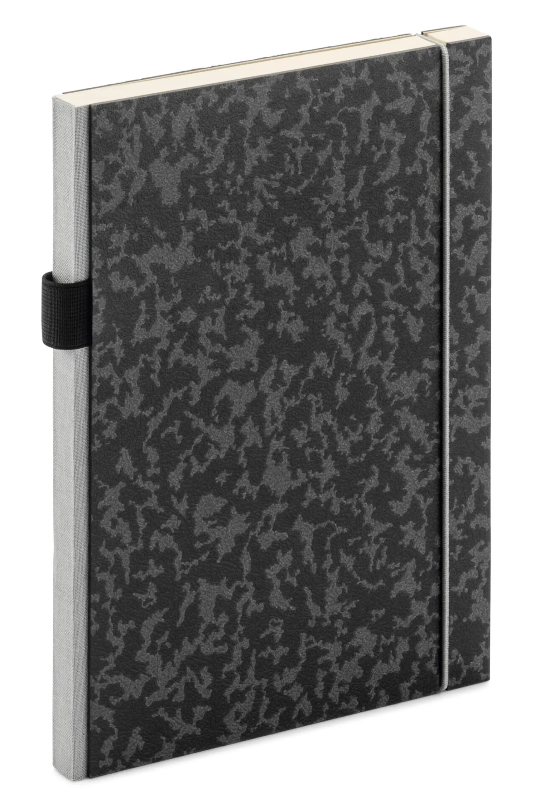 192 Seiten, chamoisfarbenes 90-g-Papier. Fadenheftung. Deckel aus strukturierter schwarz-grauer Hartpappe (Stärke 1,7 mm), Rücken aus hellgrauem Leinen. Steifbroschur. Mit Einstecktasche im hinteren Einbanddeckel, rundem Verschlussgummi und flexibler Stiftschlaufe. Lieferung ohne Stift.