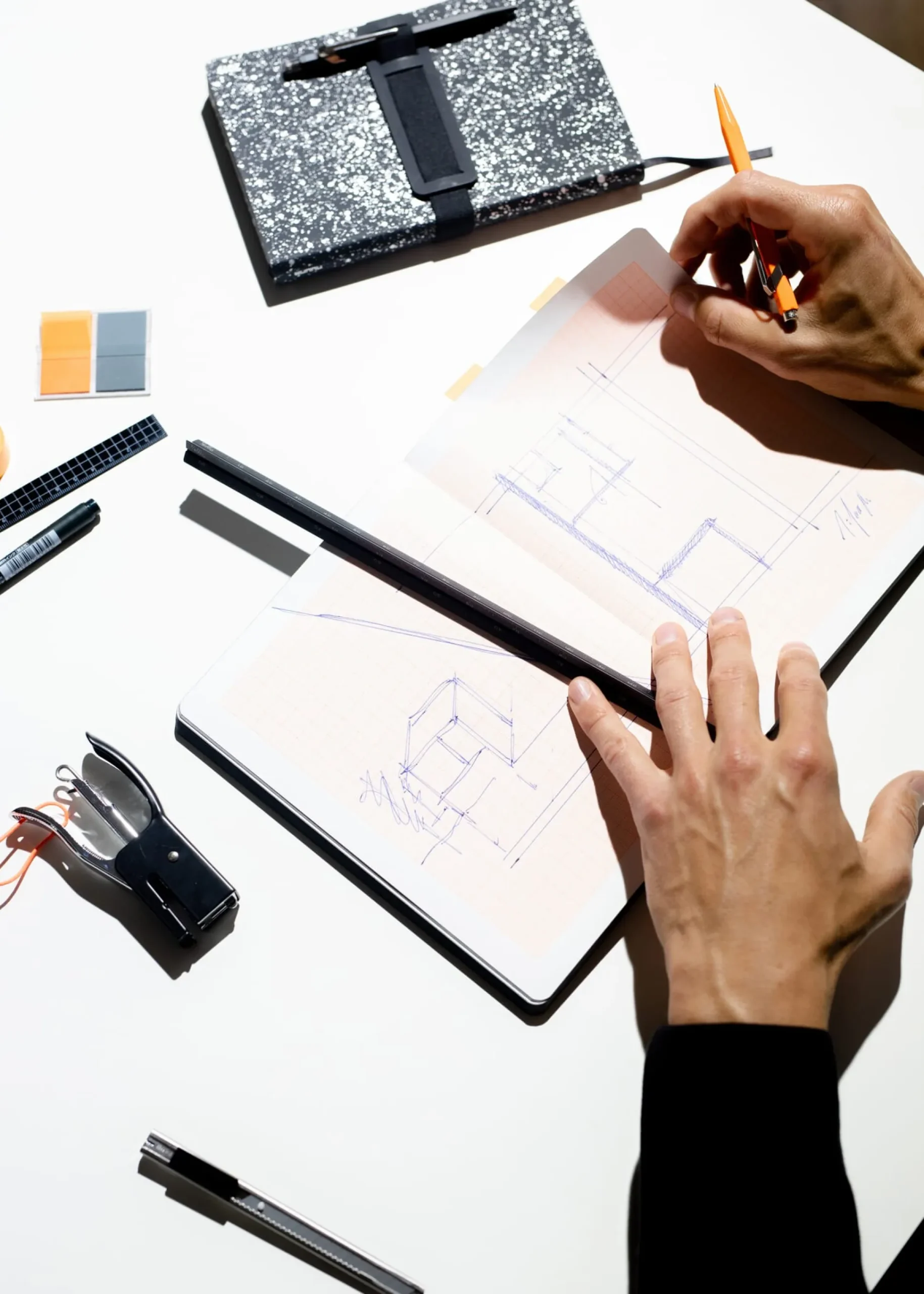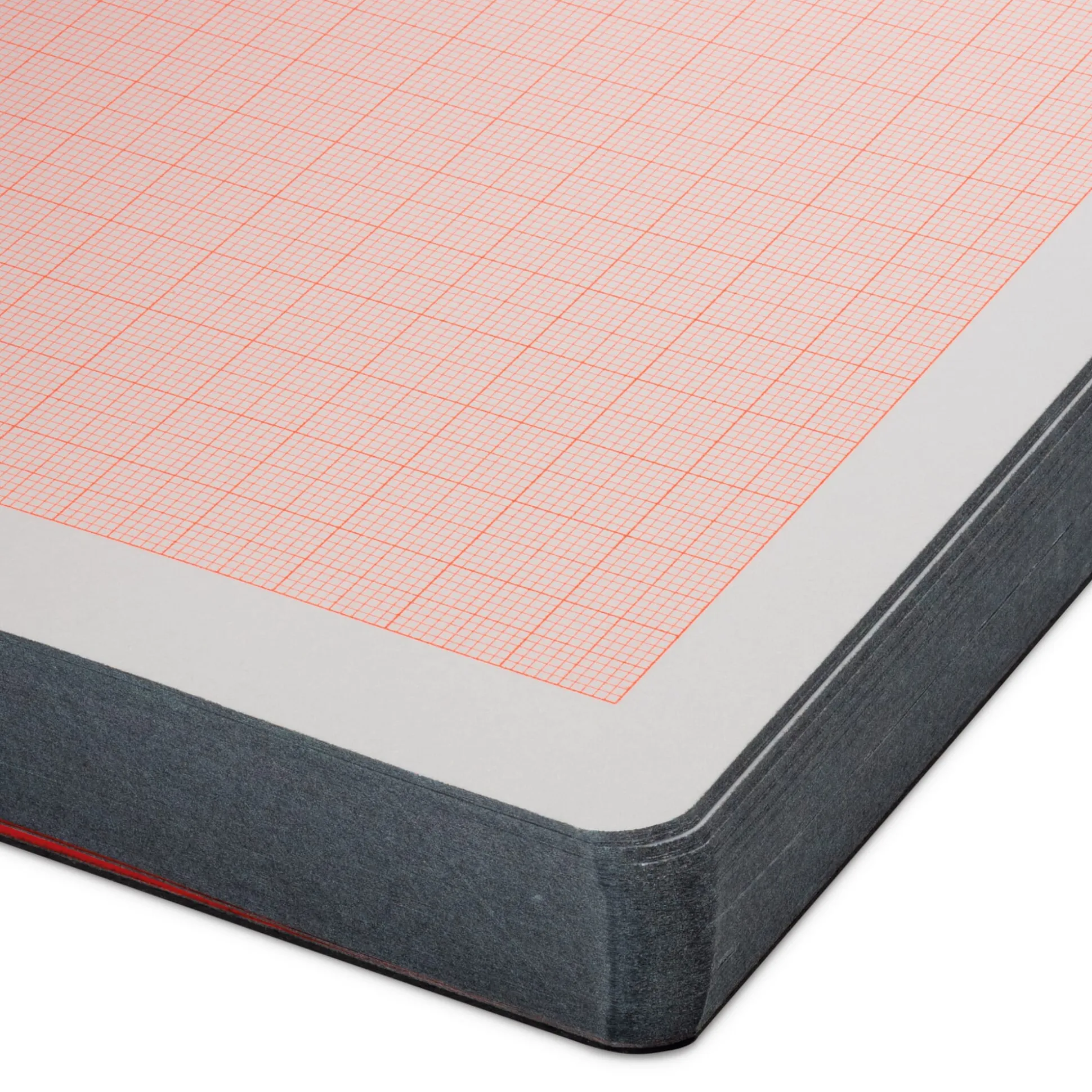 - Neonorangefarbenes Millimeterpapier im Einband aus Recyclingleder