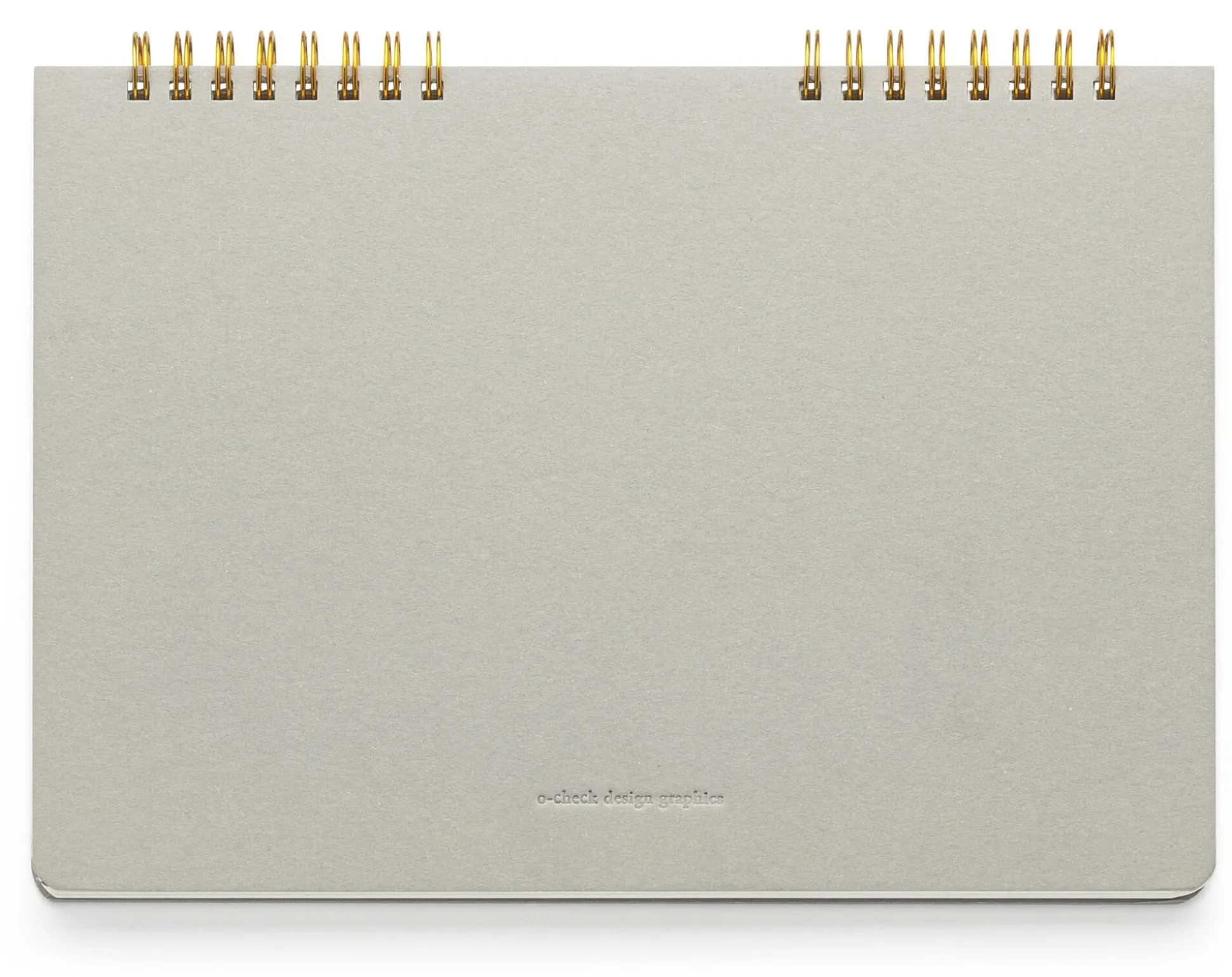 Notizbuch mit 80 Blatt (160 Seiten) aus zartweißem Naturpapier (100 g/qm) und einer Tasche aus Kraftpapier, die A5-Formate fasst. 24 × 17 cm. Spiralbindung aus vermessingtem Stahl. Deckel aus 2 mm starker, blau, schwarz oder grau bedruckter Graupappe. Hergestellt in Südkorea.