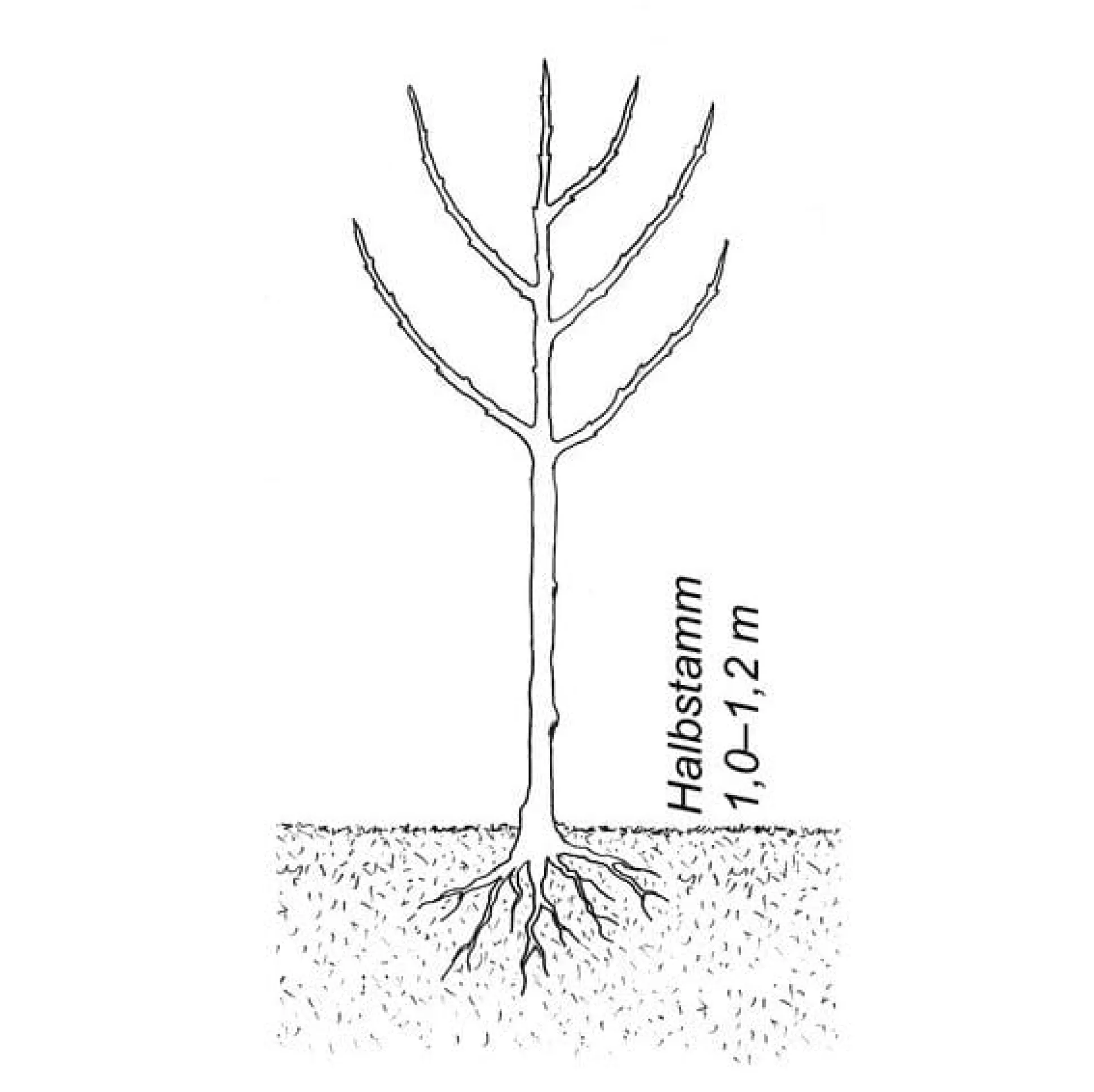 Halbstamm. Höhe bei Lieferung etwa 1,5 m. Die Stammlänge beträgt 1,1–1,3 m, die Gesamtlänge etwa 1,7 m (mit Wurzelwerk).
