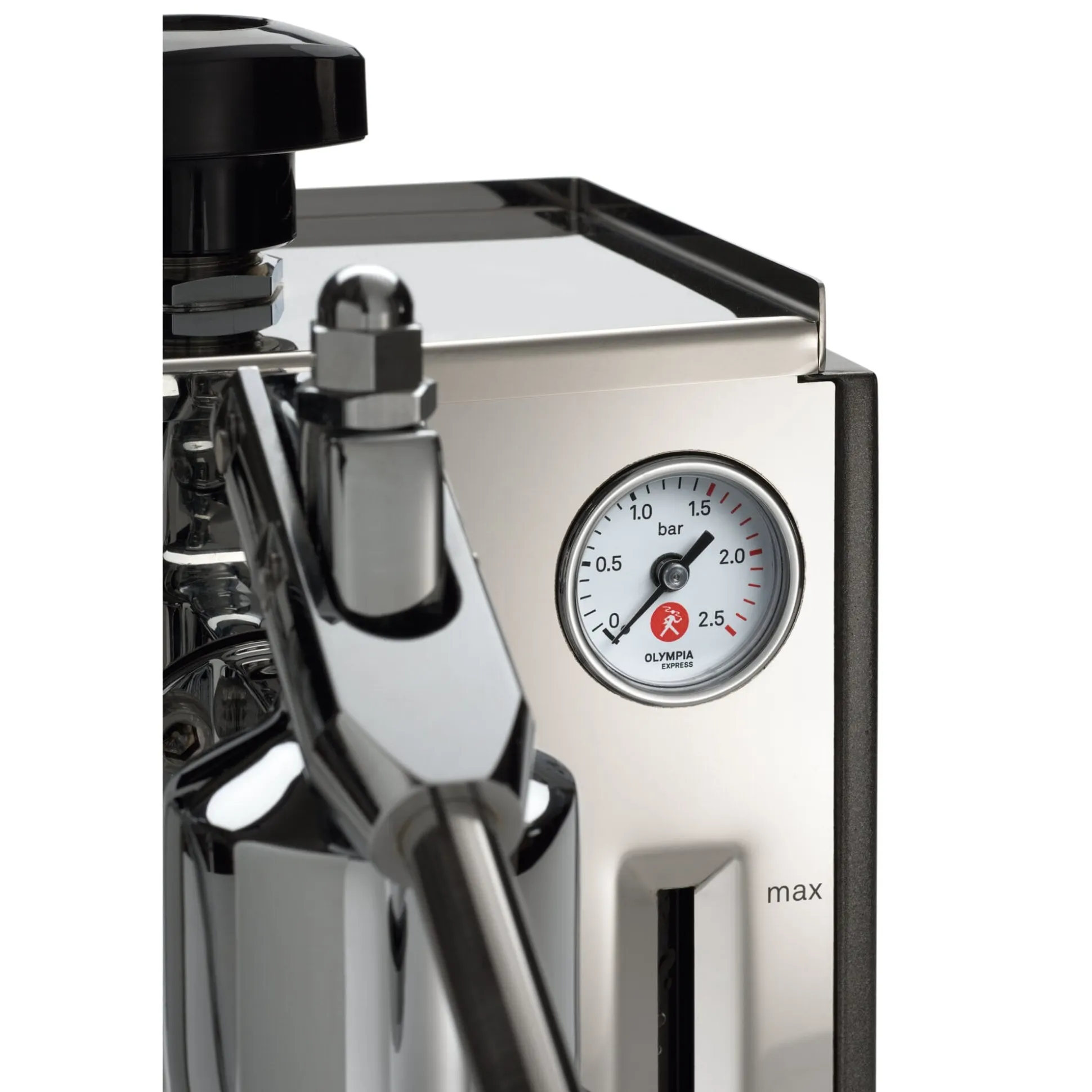 Elektrische Handhebel-Espressomaschine mit Pre-Infusions-Kolbensystem. Messing, verchromt und hochglanzpoliert; Edelstahl hochglanzpoliert; Stahl. Rahmen und Verkleidung des Gehäuses pulverlackiert. Ein/Aus-Schalter, beleuchtete Betriebsanzeige, Wasserstandsanzeiger. Kesseldruckmanometer von Wika aus Deutschland. 1,8-l-Boiler aus Chromstahl (für 20 Tassen), 1 Filterhalter, 2 Filtersiebe, Edelstahltrichter und -tamper (49 mm). Leistungsaufnahme 1.000 W. Brühtemperatur 92 °C. Heizkessel Fassungsvermögen 1,8 l, mit Überhitzungsschutz.