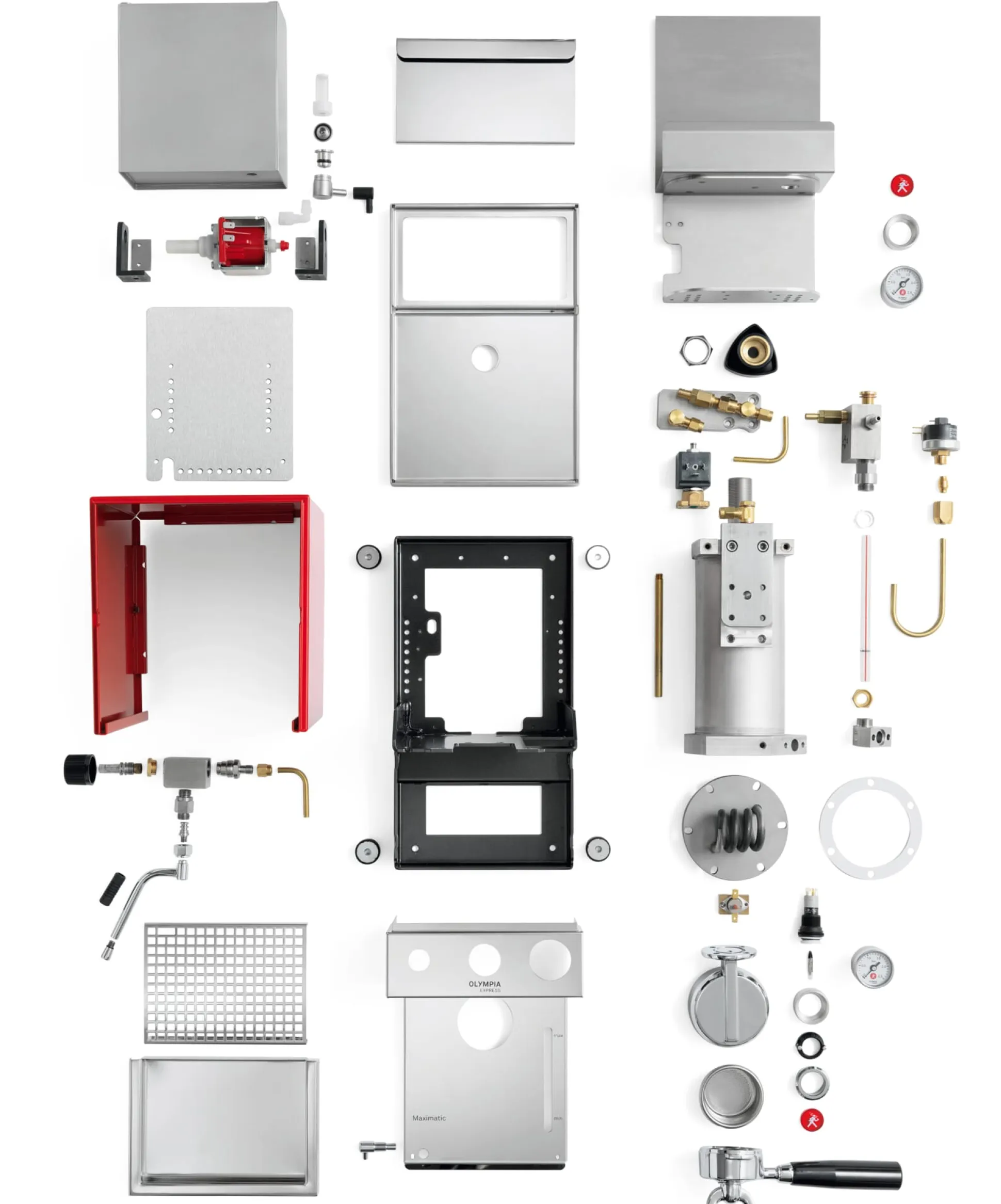 Ein Blick auf die Maschinen zeigt die Haltung, mit der die Ingenieure von Olympia Express in der Schweiz zu Werke gehen: Perfektion und Materialversessenheit bis ins letzte Detail, zugunsten der Espressoqualität und zugunsten von Zuverlässigkeit, Langlebigkeit und Reparierbarkeit der Geräte. Es begegnet einem eine geradezu atemberaubende Opulenz wirklich solider Materialien: rostfreier Edelstahl, Chrom und Messing, das Ganze kompakt verbaut und verpackt in ein massives Gehäuse, in eine dickwandige Ummantelung und bestückt mit Armaturen, wie sie einer professionellen Barmaschine zur Ehre gereichen.