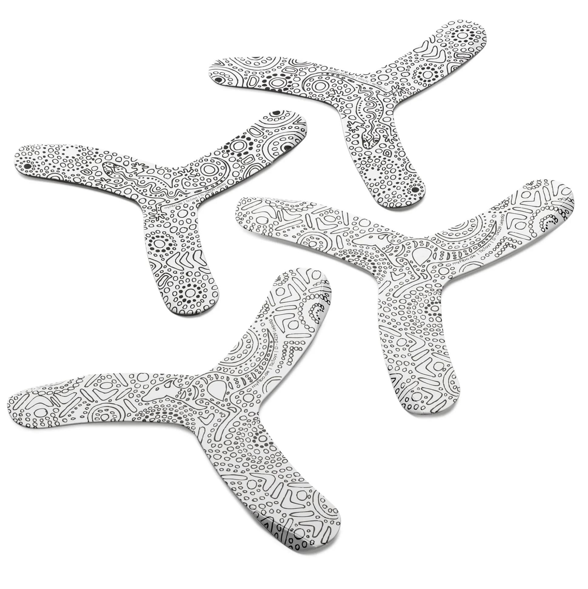 Ab 4 Jahre. 4 Bumerangs aus Pappe, dreiflügelig. 2 Bumerangs für Einsteiger, Ø 18 cm, mit Känguru-Aufdruck, Flugkreis 2–3 m. 2 Bumerangs für Fortgeschrittene, Ø 15 cm, mit Gecko-Aufdruck, Flugkreis 4–5 m. Mit einer ausführlichen Anleitung.