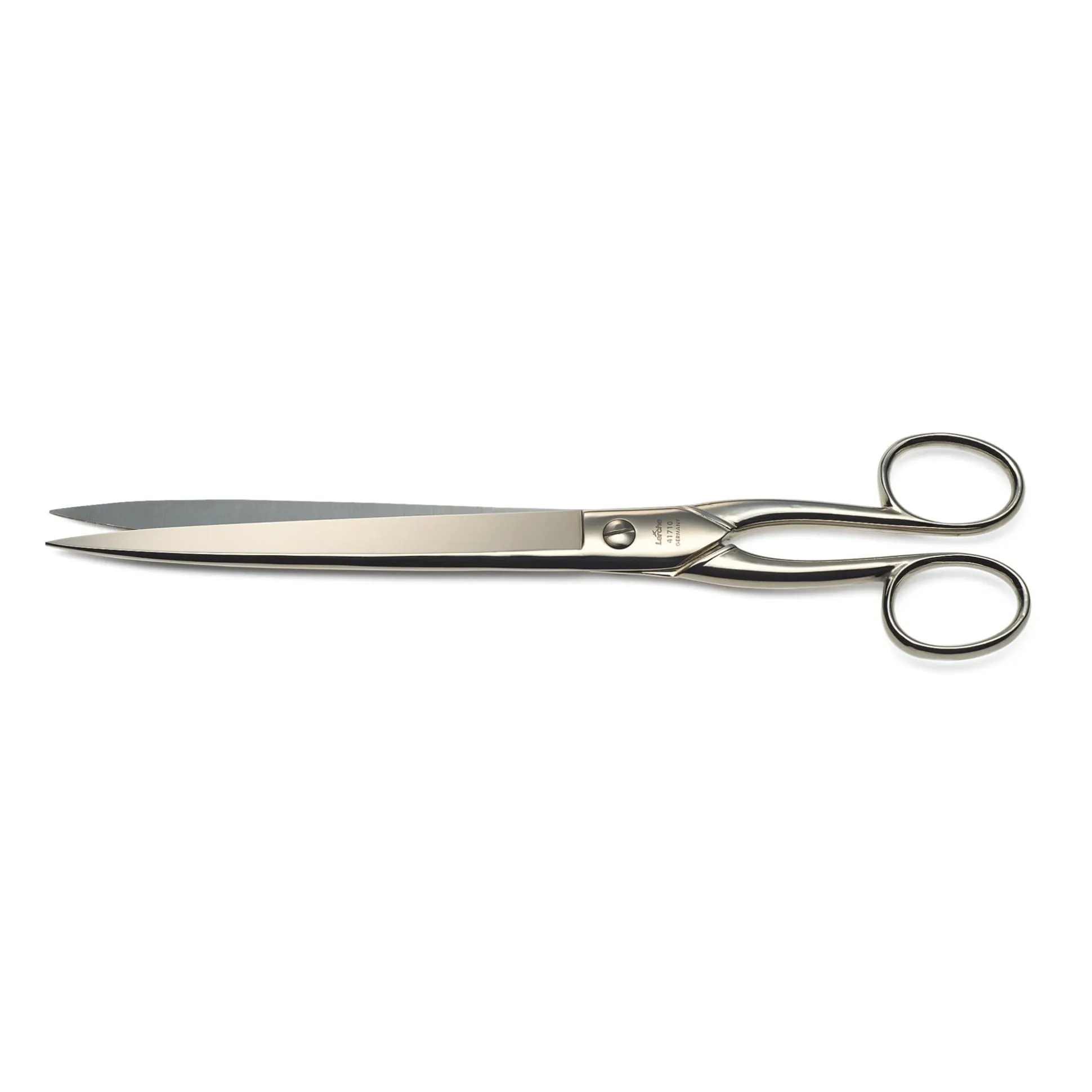 Kohlenstoffstahl hochglanzvernickelt. Gepließtete (feingeschliffene) Scherenaugen. L 10 Zoll (25,4 cm). Schnittlänge 14 cm. Gewicht 160 g.