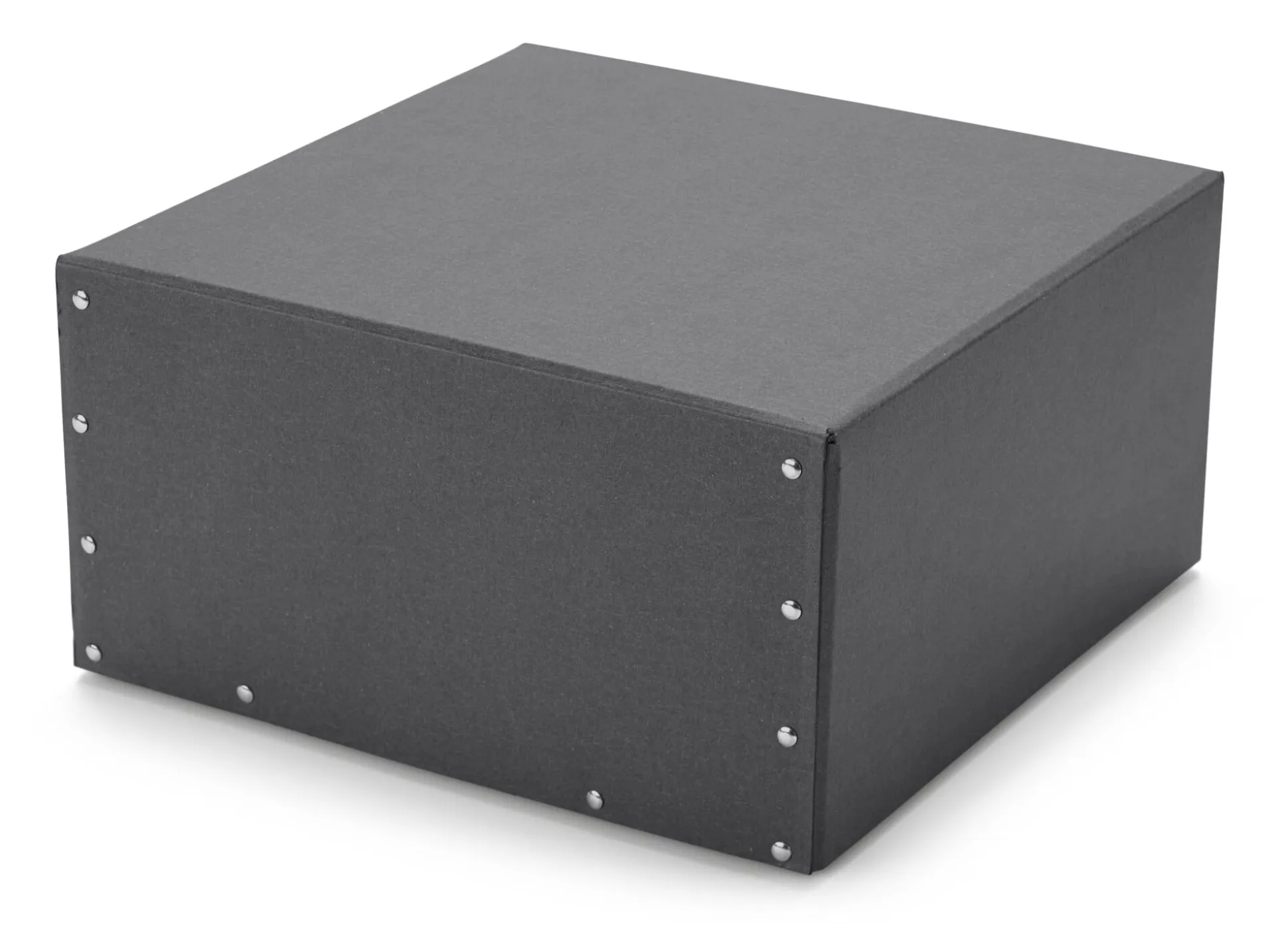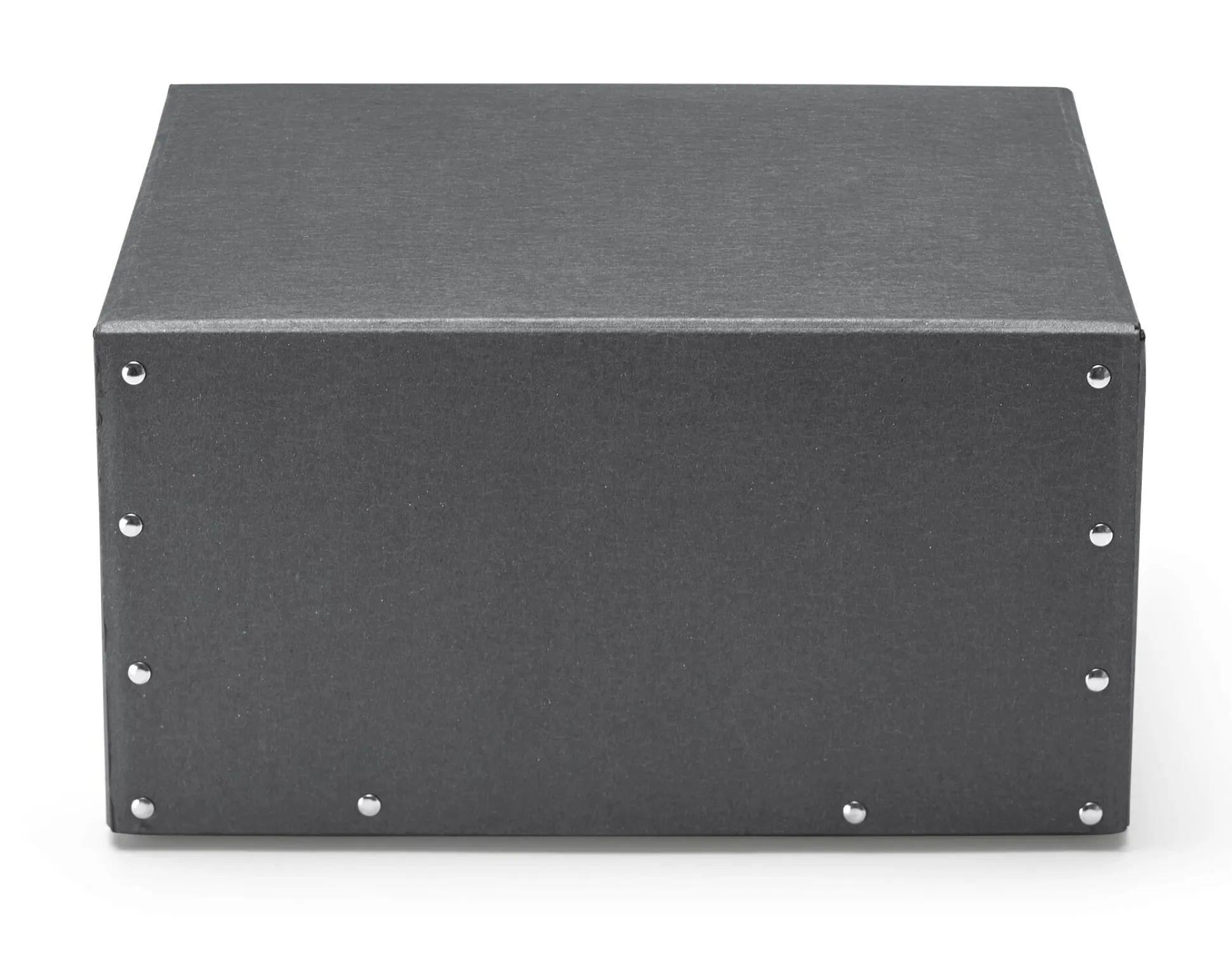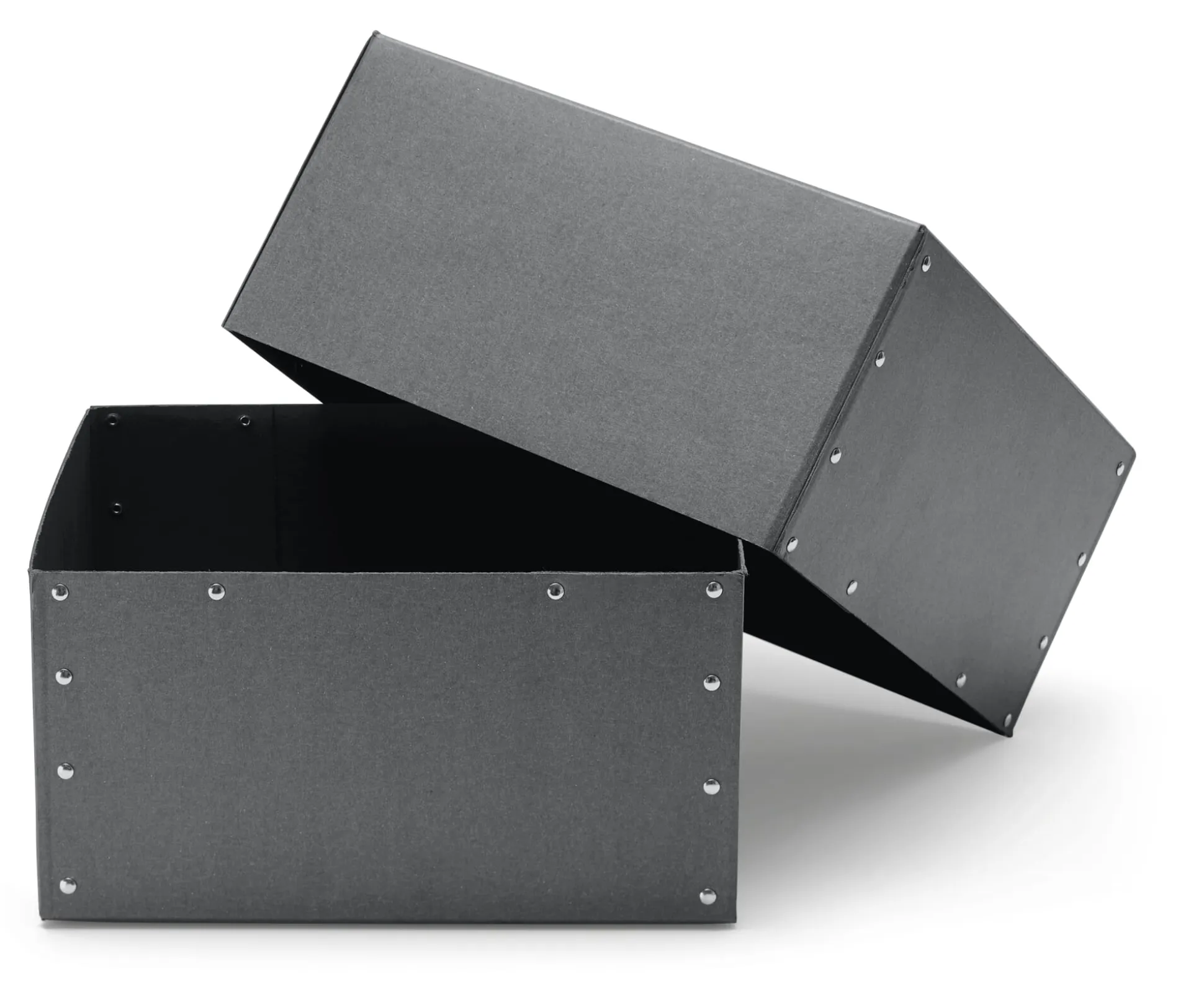 Die passende Archivbox für unser Regal 1HOCH3. Zwei Kisten passen in ein kubisches Fach. Auch wenn in seiner Größe speziell ausgelegt auf den Einsatz im Regalsystem 1HOCH3 – diese Pappbox lässt sich natürlich bestens in anderen Regalsystemen oder autonom als Ablagekiste für vielerlei Zwecke einsetzen. Der Farbton entspricht ungefähr Pantone Black 430 U.