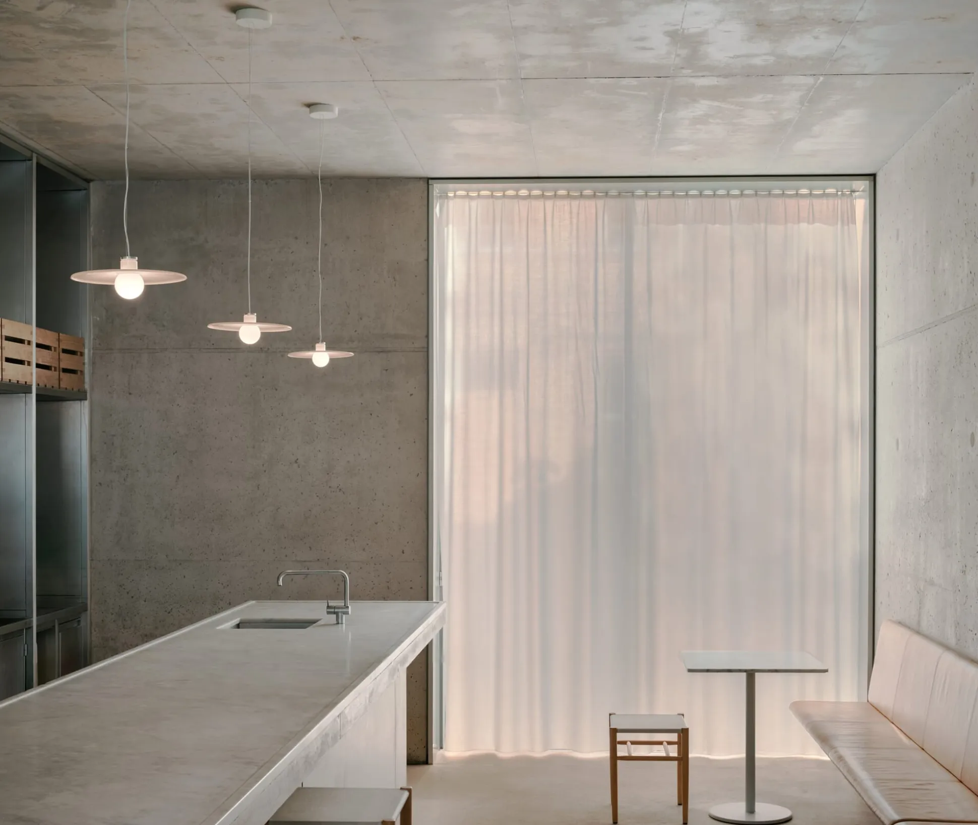 Serie von Pendelleuchten W202, hier in der Version S3, mit einem flachen Glasschirm, der einen Großteil des Lichts nach unten richtet. Der kugelförmige Leuchtkörper besteht wie der Leuchtenschirm aus Opalglas und beherbergt ein dimmbares LED-Leuchtmittel, das effizientes und warmweißes Licht als Raum- oder Tischbeleuchtung liefert. Lange galt die Glühbirne als Inbegriff des Lichts. W202 lässt ihre archetypische Form wiederauferstehen und erfüllt sie mit neuem, modernem und leistungsfähigerem Licht und Leben. Der Entwurf stammt vom Büro David Chipperfields, einem der namhaftesten zeitgenössischen Architekten.