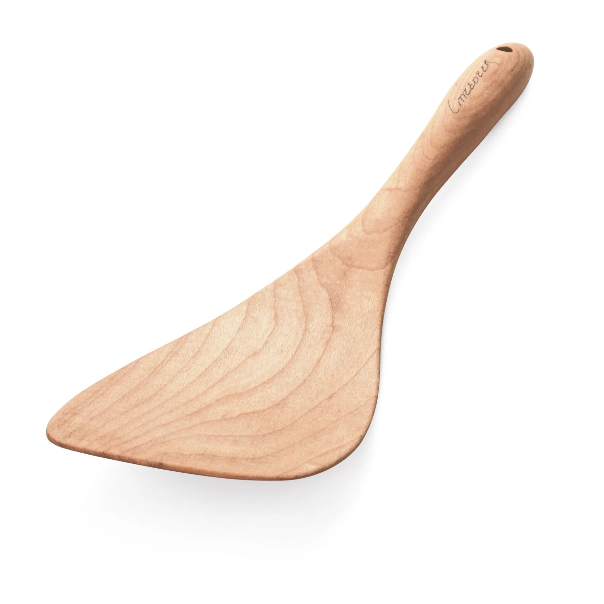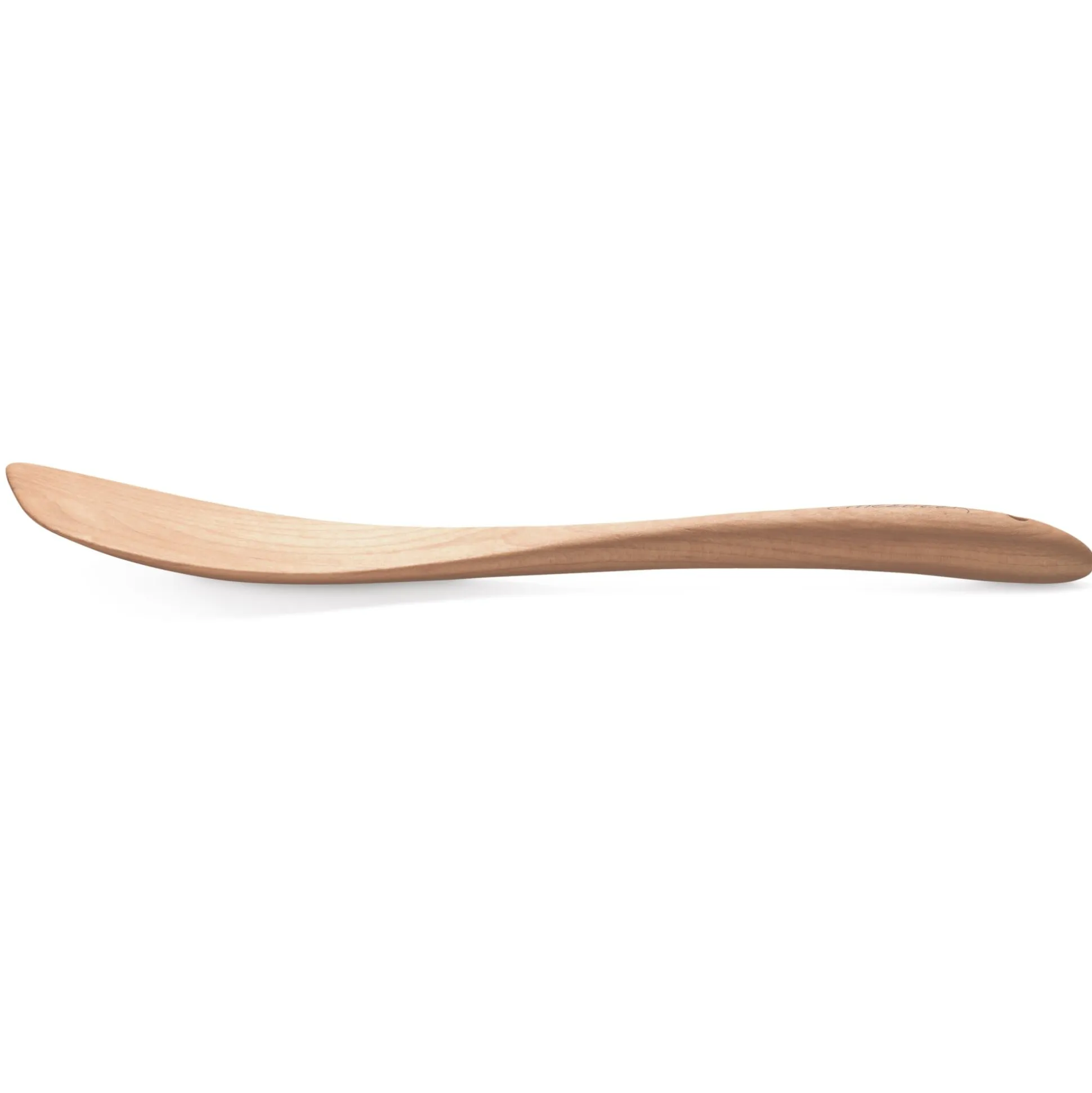 Bei dem Kochwerkzeug nun ist der Holzquerschnitt so ausgelegt, dass nicht nur die im Einsatz besonders belasteten Partien ausreichend dimensioniert sind. Die Gerätschaft unterstützt auch beim Rühren im Topf oder Wenden von Bratgut in der Pfanne eine dynamische Handbewegung. Das Ausformen aus dem vollen Holz geschieht mit der Hilfe von Bandsäge und Schleifmaschine noch in Handarbeit. Zur Verwendung kommt kanadisches Ahornholz aus der Umgebung des Betriebes, das nach dem Schleifen noch eine oberflächenschützende Behandlung mit Weißöl erfährt.