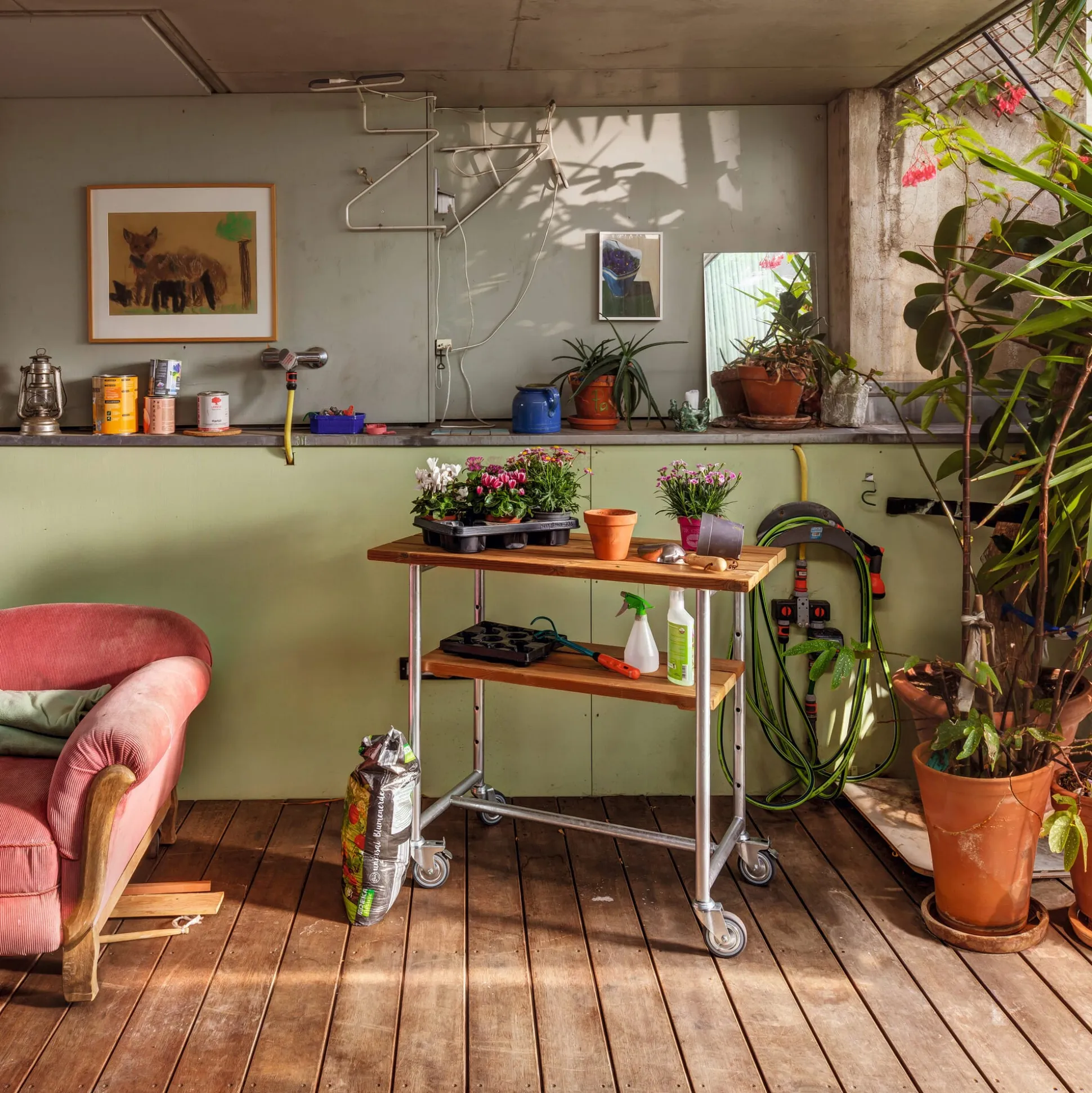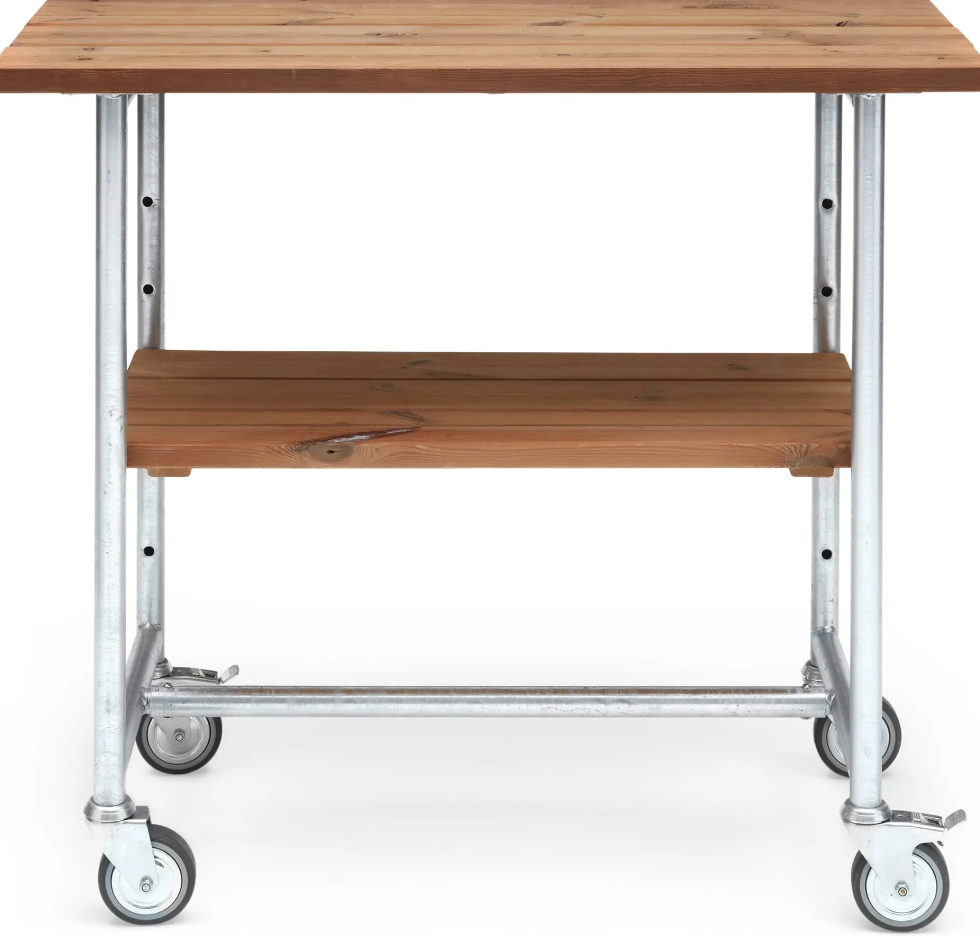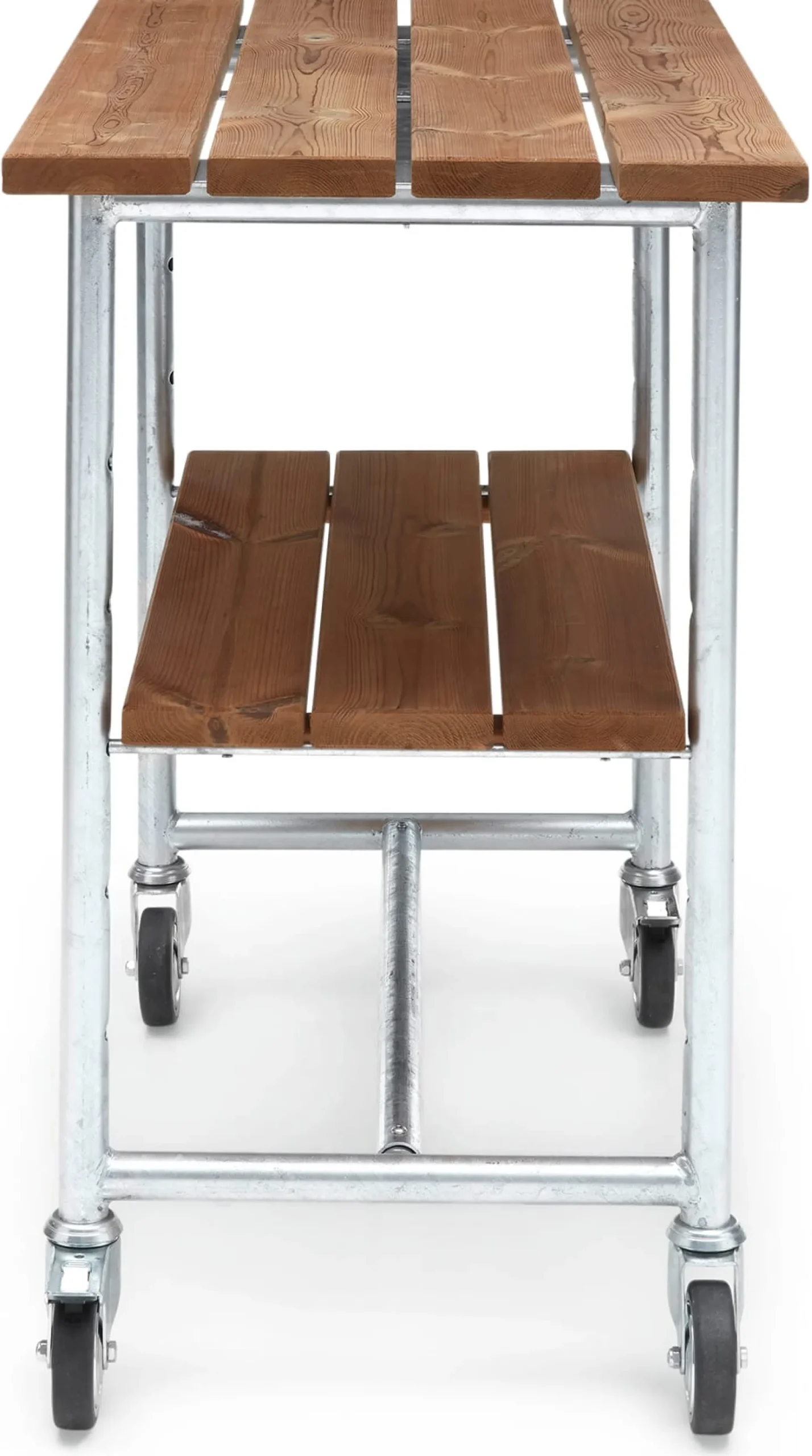 Robuster Wagen mit Arbeitsplatte und Ablagefläche aus der Serie JÜTLAND. Mit seinen Schwerlastrollen ist das flexible Möbel ohne große Anstrengung rollbar und kommt einfach überallhin mit, wo es gebraucht wird: auf den Balkon, die Terrasse, in den Wintergarten, Hof und Garten. Die ideale Ergänzung zu Tisch und Bank der Serie aus unserem Sortiment – natürlich beide auch auf Rollen.