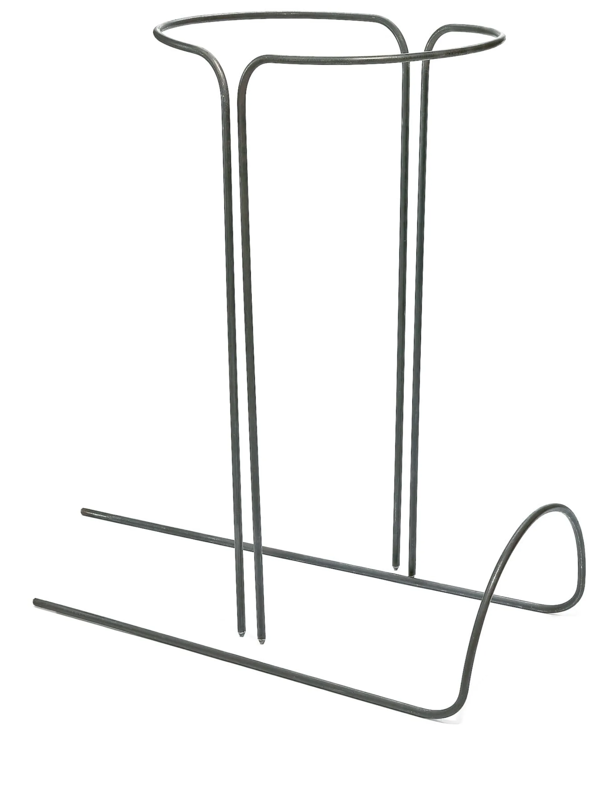 Diese stabilen, aus dickem Stahldraht (Ø 1 cm) gebogenen Pflanzenstützen geben Dahlien, großen Stauden oder unter ihrer Last zusammenzubrechen drohenden Beerensträuchern sicheren Halt. Einzeln gestellt sind sie an Häuserwänden oder am Wegesrand nützlich, zwei zusammen umschließen eine Pflanze als Stützring. Das Material ist unbehandelt, der drohenden Korrosion können Sie mit einem Leinöl- oder Owatrolanstrich vorbeugen.