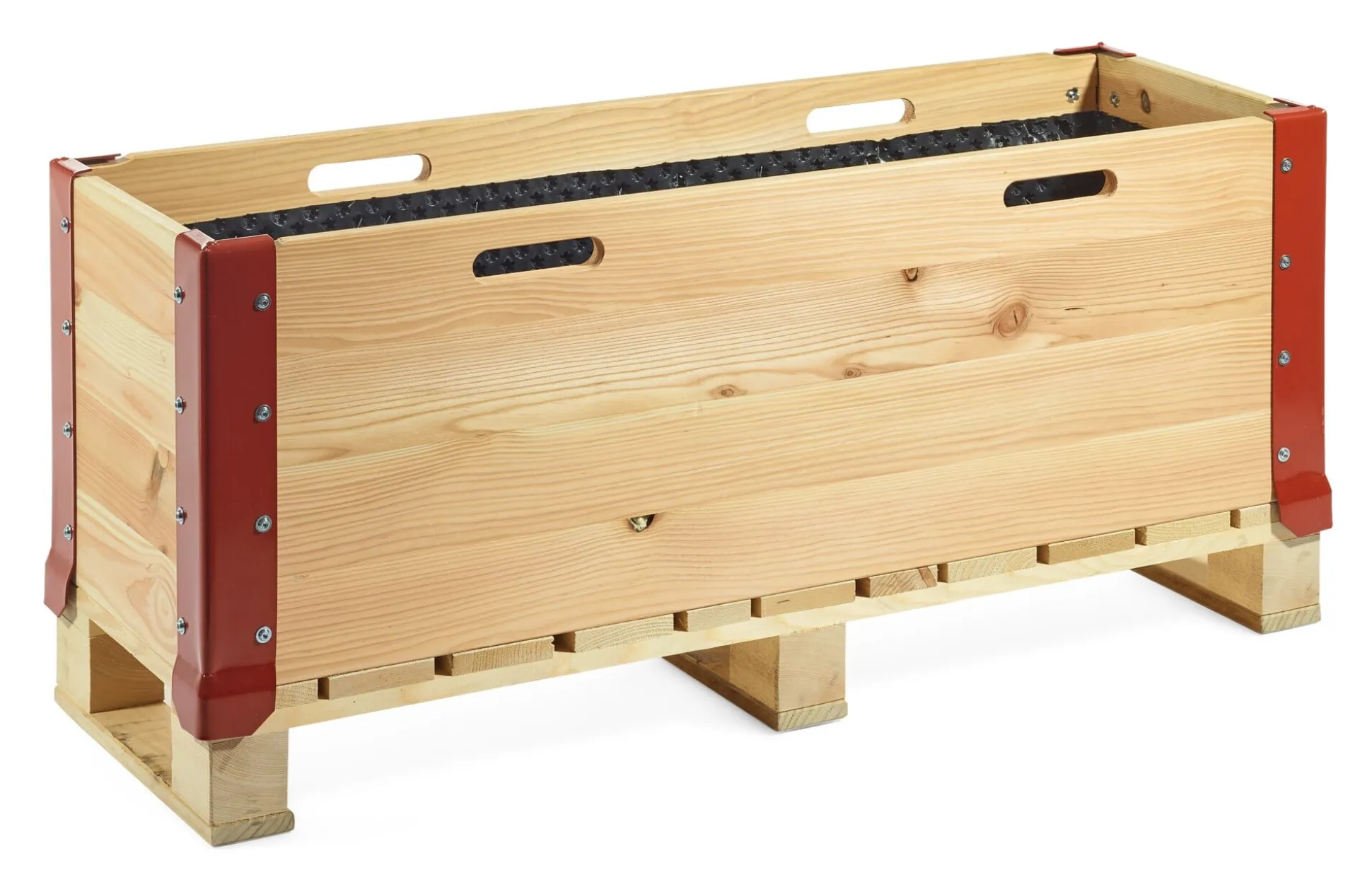 Pflanzgefäß aus Douglasienholz (Herkunft Schweiz); Noppenfolie aus Polyethylen HD; Eckwinkel aus kaltgepresstem Stahl und Epoxidharz, rotbraun pulverbeschichtet. Palette aus Fichte und Accoya® (Herkunft Schweiz). Gefertigt in der Schweiz.