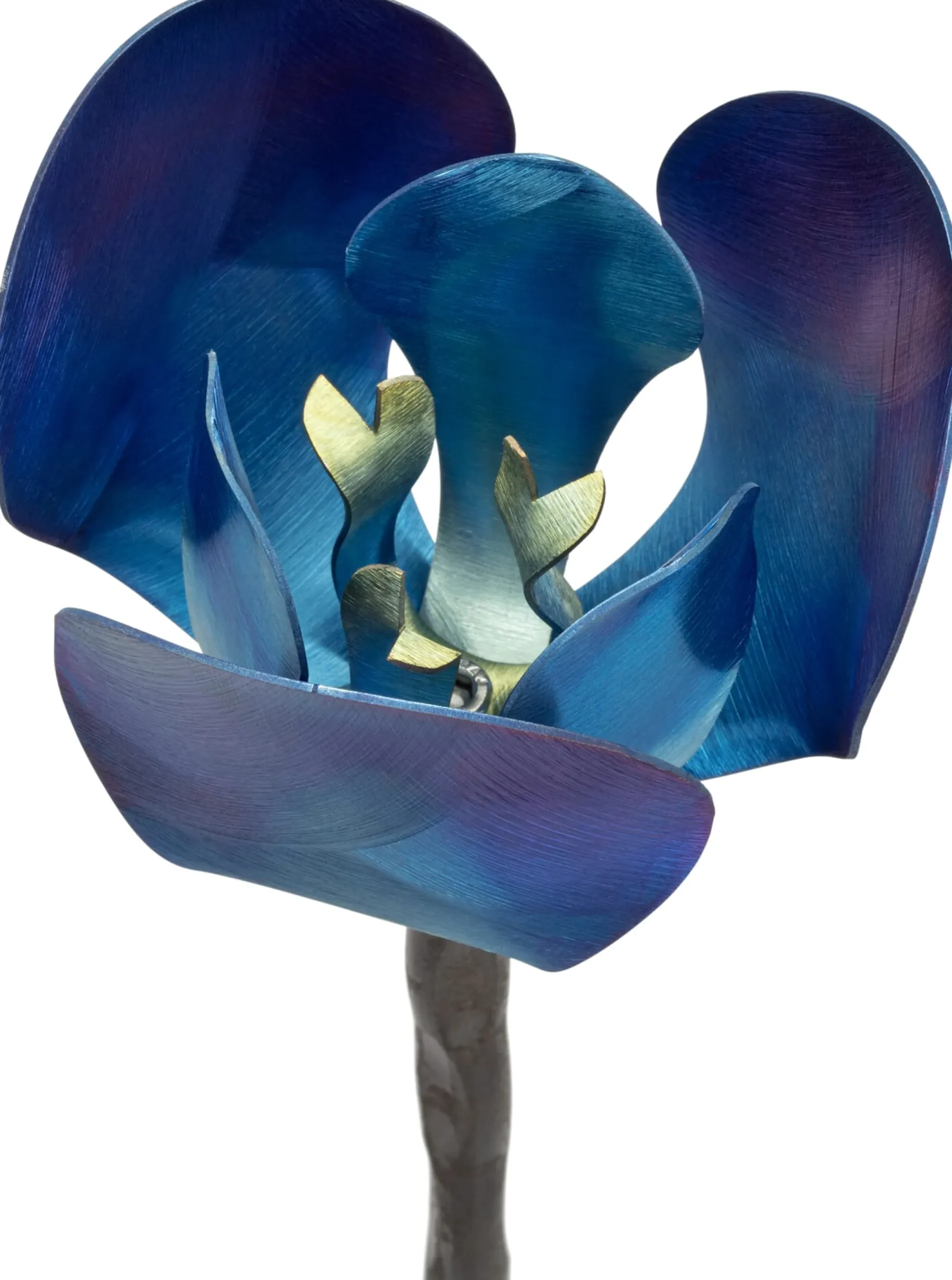 Titanblüte auf einem Stab aus unbehandeltem Stahl (Stab nicht rostfrei). Handgeschmiedet in Deutschland. Blüte Ø 9 cm. Stab Höhe 80 cm, Ø 1 cm. Gesamtgewicht 500 g.