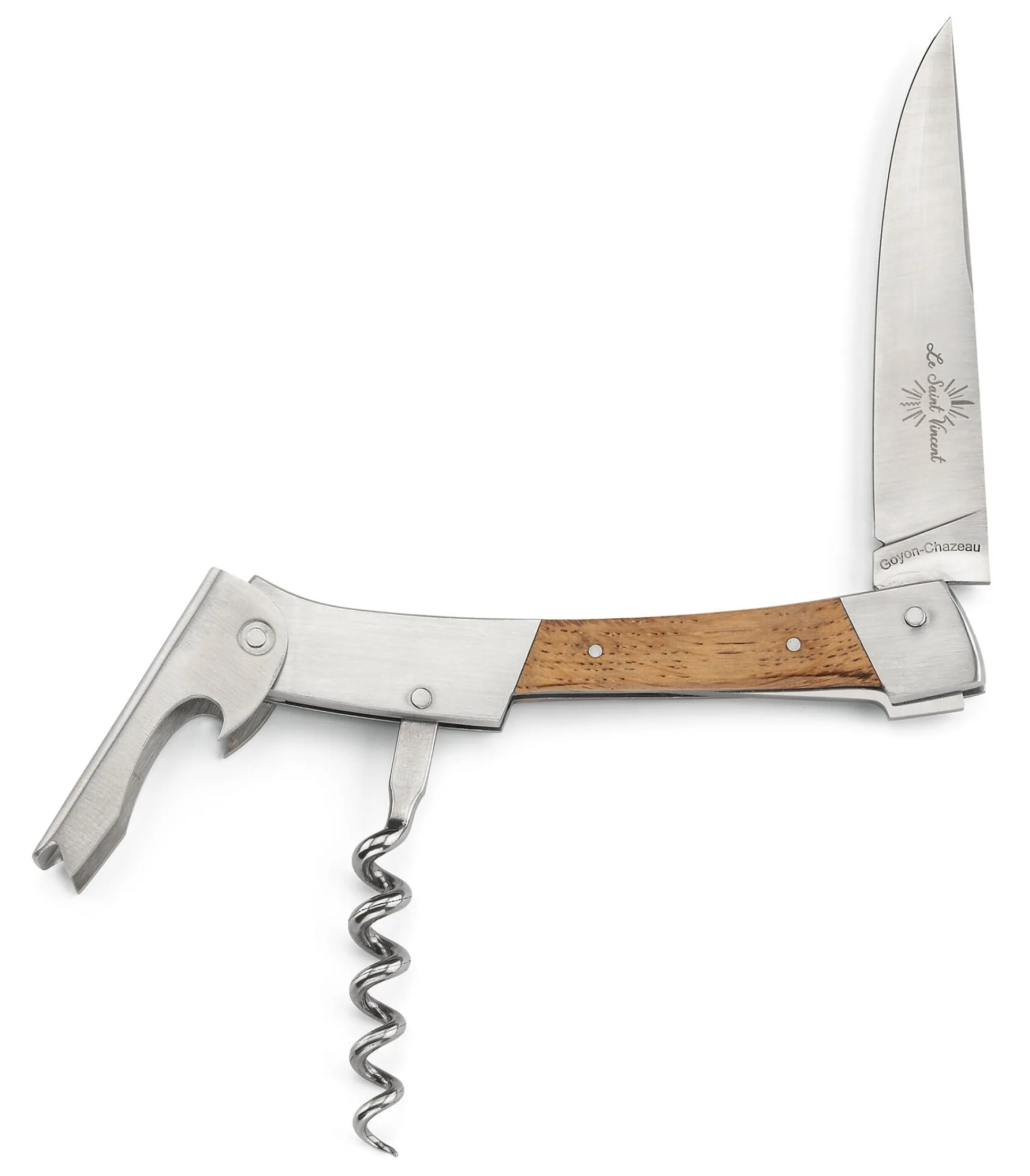 Der Heilige Vinzenz gilt den Franzosen als Schutzpatron ihrer Winzer, sein Namenstag im Januar wird im Burgund tradtionell sogar groß gefeiert. Was liegt da näher, als ein Sommeliermesser nach ihm zu benennen? Es kommt von den Besteckspezialisten bei Goyon Chazeau im Messerstädtchen Thiers in der Auvergne und bietet selbstverständlich alle Anwendungen eines klassischen Sommeliermessers. Und doch ist eine Sache an diesem Messer besonders hervorhebenswert – von der absolut aufwendigen Verarbeitung abgesehen. Denn dort, wo bei anderen Kellnerbestecken die kleine Klinge zum Einschneiden der Kapsel sitzt, ist bei diesem eine vollwertige, geschmiedete und geschärfte Taschenmesserklinge aus Sandvik®-Stahl angebracht. Weil zum Picknick eine gute Flasche Wein gehört – und zum guten Wein eine gute Saucisson, ein ordentliches Stück Käse, knuspriges, frisch gebackenes Baguette und etwas Obst. Goyon-Chazeau hat dieses Messer in Zusammenarbeit mit dem Messerschmied Robert Beillonnet entwickelt, in Fachkreisen berühmter und mehrfach ausgezeichneter „Meilleur Ouvrier de France“ (Bester Handwerker Frankreichs).