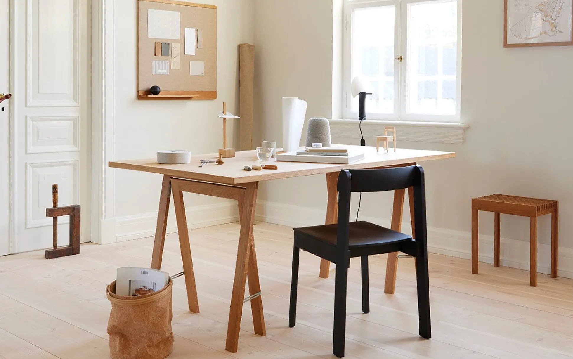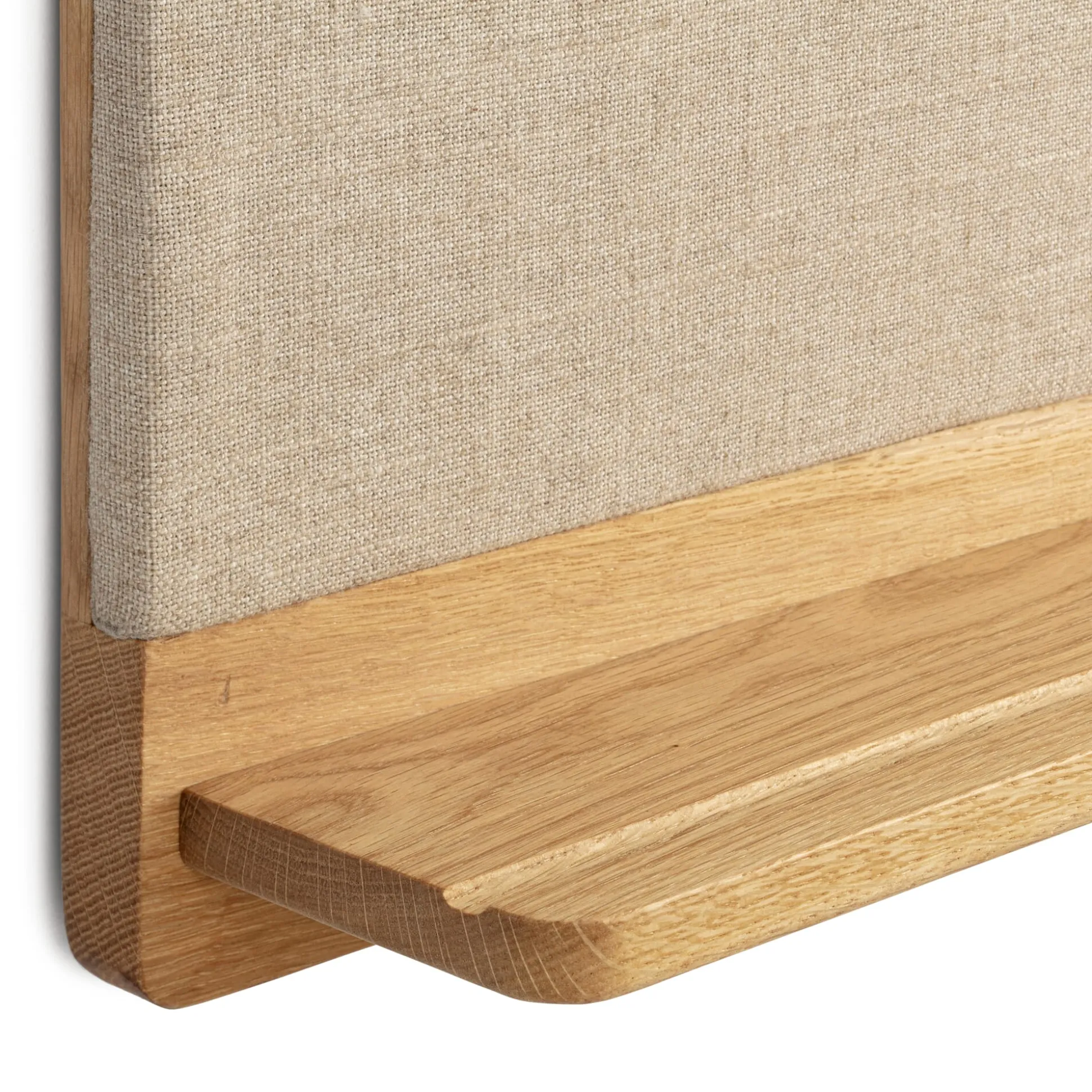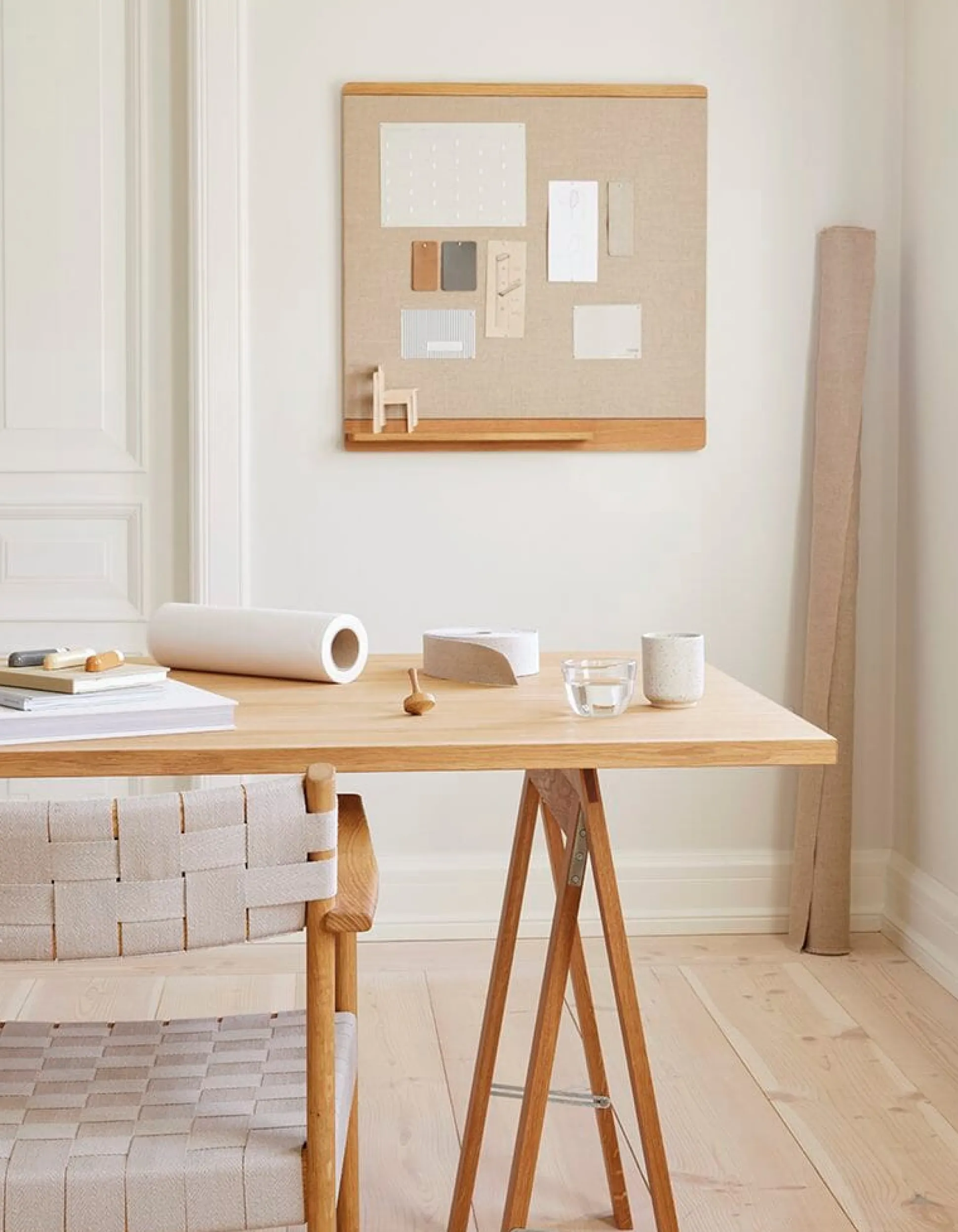 Handwerklich souverän aus massivem, geöltem Eichenholz gebaut, hält der Rahmen eine solide Holzfaserdämmplatte vor, auf die ein etwas gröberes Gewebe aus recyceltem Leinen aufgezogen ist. Heftzwecken, Pins und Stecknadeln haften bestens in dieser Kombination von Faserplatte und Leinwand, die beide materialtypisch sehr robust und langlebig sind. Mit einer Fläche von 75 × 75 Zentimetern verfügt die Pinnwand zudem über die optimale Größe, um über Schreibtisch, Flurkonsole oder Küchentisch alles Erinnerungswürdige aufzunehmen, ohne den Rahmen von Raum (und Zeit) zu sprengen. Dazu trägt auch ihre angenehm reduzierte Gestaltung bei, die in der Tradition von Shaker, Bauhaus & Co. ganz der Funktion folgt und daher die Ablage nicht vergisst, auf der unter anderem Notizzettel und Stifte deponiert werden können.