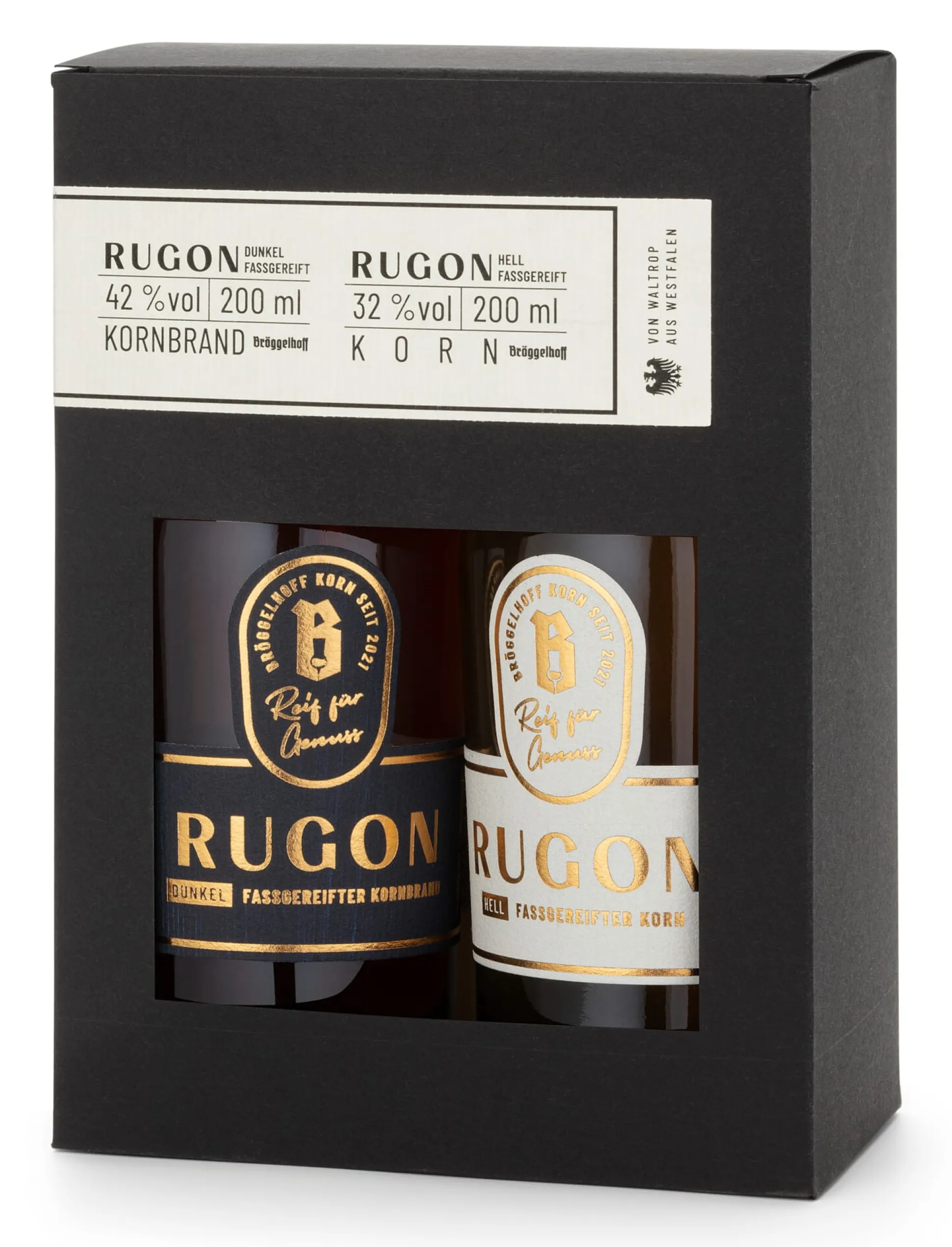 „Rugon“ ist das altgermanische Wort für Roggen. Und Roggen ist es auch, der für den kräftigen Grundcharakter dieser beiden Kornspezialitäten von Bröggelhoff verantwortlich ist. Die Box enthält je eine kleine Flasche der beiden Rugon-Varianten: