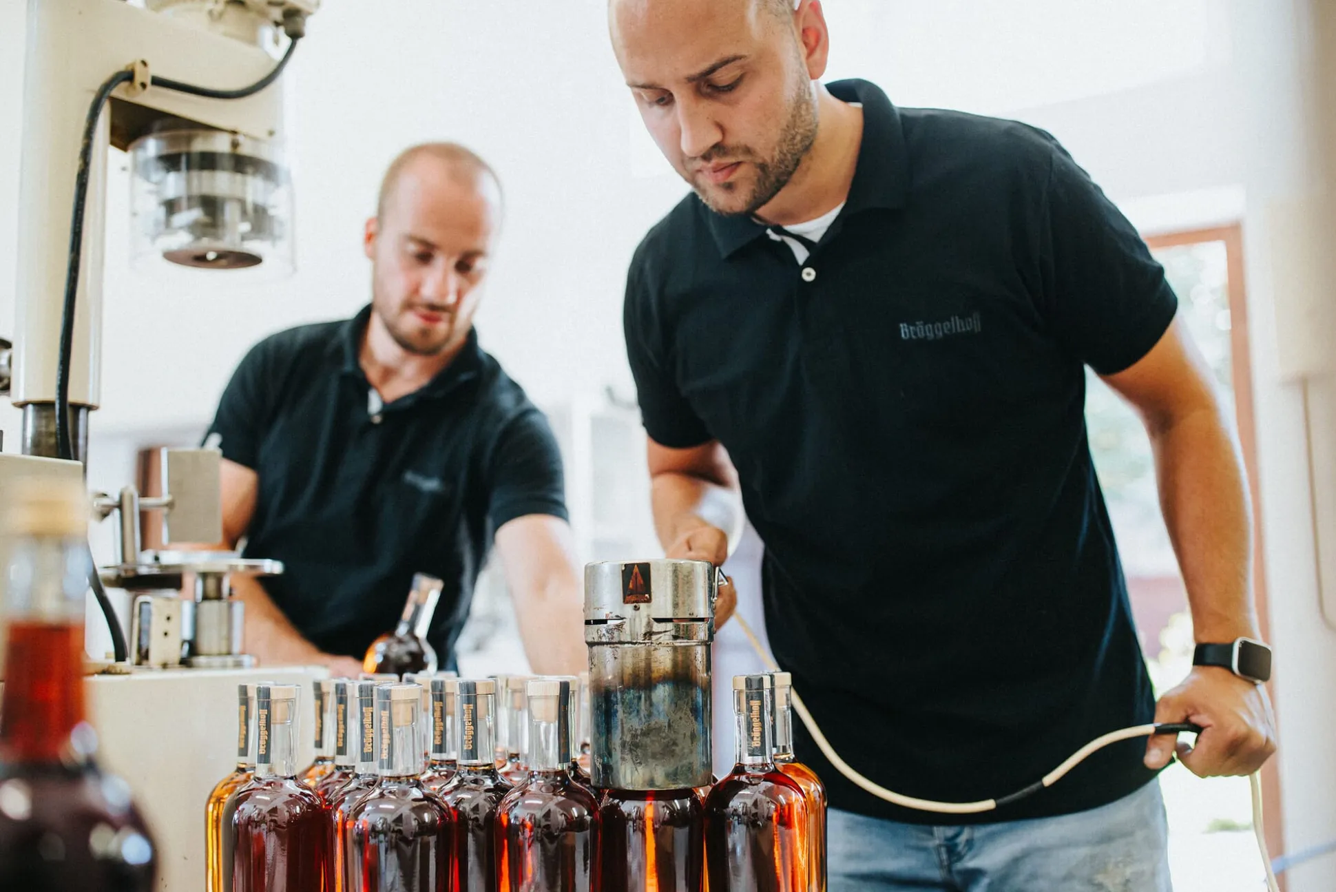 Warum in die Ferne schweifen? Sieh, das Gute liegt so nah. So kann man in diesem Fall mit Recht argumentieren, denn Bröggelhoff ist tatsächlich fast nur einen Steinwurf entfernt vom Manufactum Stammsitz in Waltrop zu Hause. Doch es ist weniger die räumliche Nähe, als vielmehr die herausragende Qualität der Destillate, die uns bewogen hat, diese in unser Sortiment aufzunehmen. Hinter der Marke Bröggelhoff steht das 2021 gegründete Start-up von Fabian Bröggelhoff und Jens Benthaus. Beide verband schon länger der Wunsch, gemeinsam ein Produkt zu kreieren – und beide waren fasziniert von den Möglichkeiten der Fassreifung, wie man sie etwa auch vom (dem Korn durchaus verwandten) Whisky kennt. Mit Expertise – der Name Bröggelhoff steht in Waltrop seit Jahrzehnten für Qualitätskorn –, dem Anspruch, den bestmöglichen Korn zu produzieren und viel Leidenschaft für diese Arbeit machten sich die beiden ans Werk. Destilliert wird in einer westfälischen Partnerbrennerei, die eine eigene Biogasanlage betreibt.