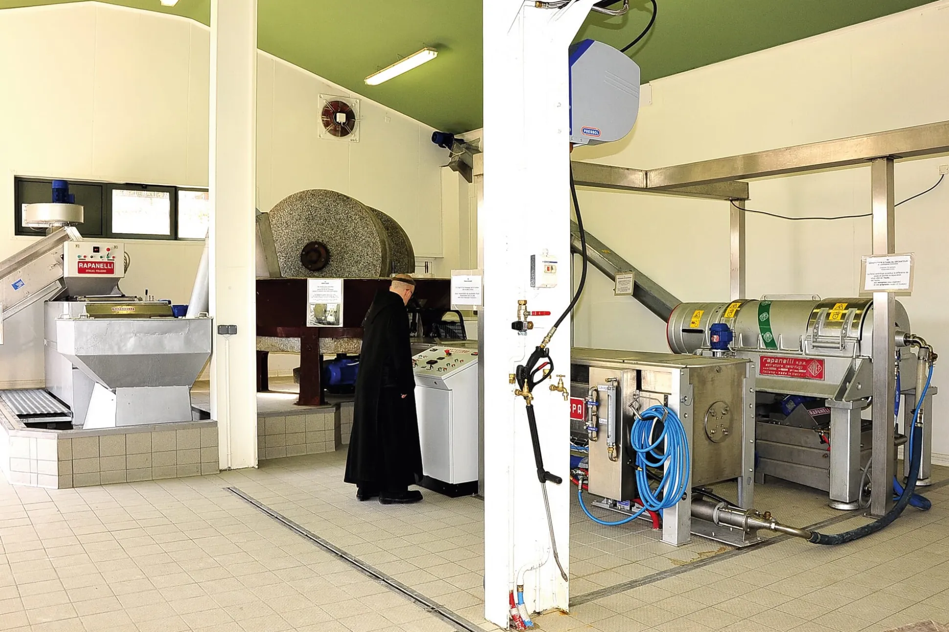 Die Mühle mit ihren technischen Einrichtungen ist auf dem neuesten Stand der Ölmüllerei; auf dem kleinen Bild unten sieht man die praktische Organisation der Geräte. Gleichsam geerdet wird diese Anlage durch ihr Herzstück, die schwere toskanische Steinmühle aus Granit, welche in der Zwillingsanordnung der beiden oberen Steine der jahrhundertealten Konstruktionsweise entspricht. Bevor das Öl aus den Oliven herausgepresst wird, müssen die Früchte unter den Steinen zerkleinert werden. Dieser Olivenbrei darf keinesfalls erwärmt werden, was passieren könnte, würden die Steine zu schnell laufen. Aus diesem Grund ist der Mahlvorgang eine gemächliche Angelegenheit und benötigt je Charge etwa 30 Minuten. Die Qualität des Öls, das auf diese traditionelle Weise gewonnen wird, kann nun durch moderne Technologien noch verbessert werden, nämlich durch Zentrifugieren des Öls, wodurch vor allem Beimengungen von Wasser aus den Früchten abgetrennt werden. Je nach Bedarf wird das Öl filtriert.