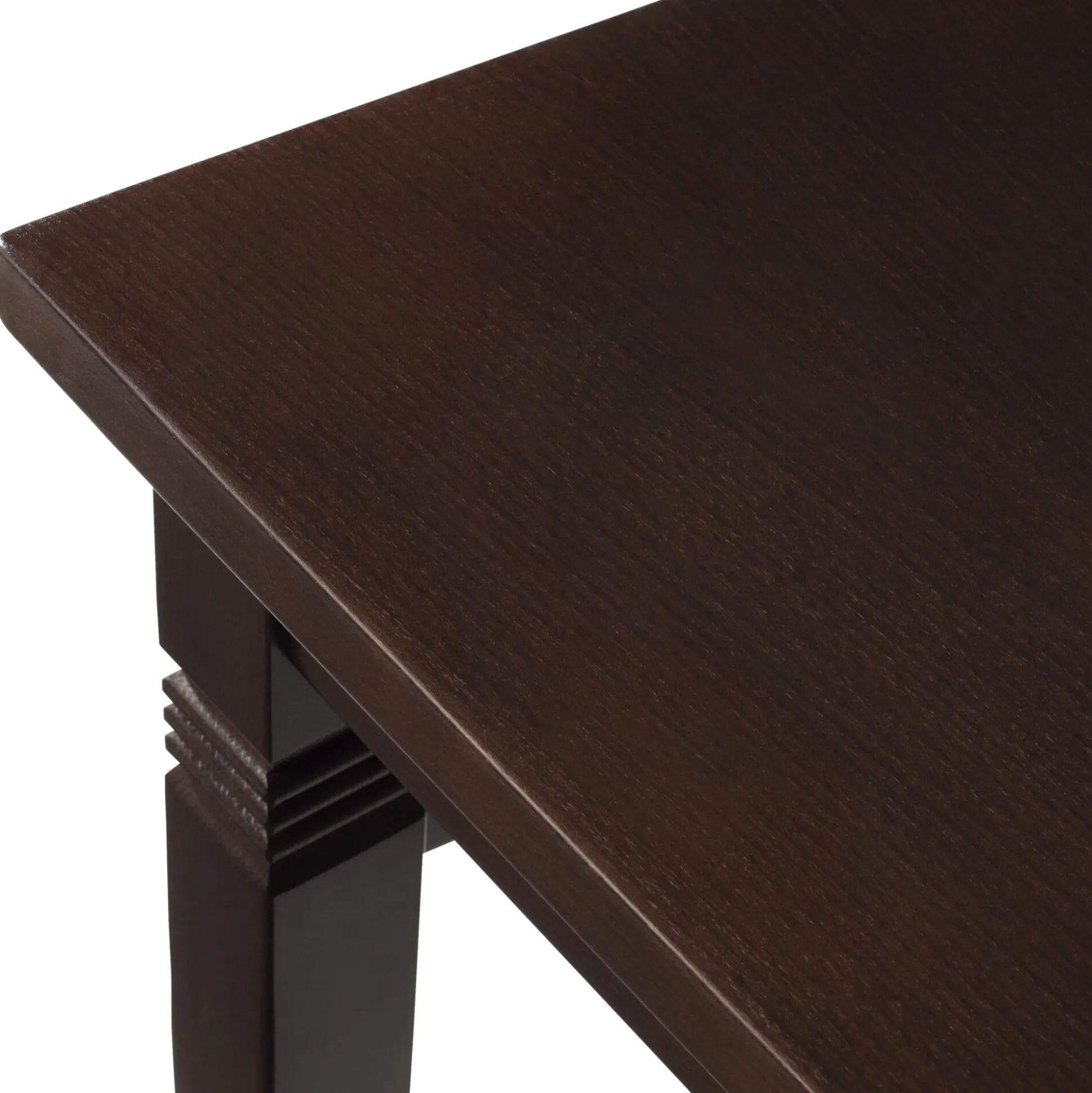 Tisch- und Stuhlgestelle sind aus massivem Buchenholz gefertigt, das dunkelbraun gebeizt und klarlackiert wird. Die Holzverbindungen sind gezapft und kaltverleimt, die Sitzrahmen auf Gehrung geschnitten und deren Kanten mit einem Stabprofil versehen.