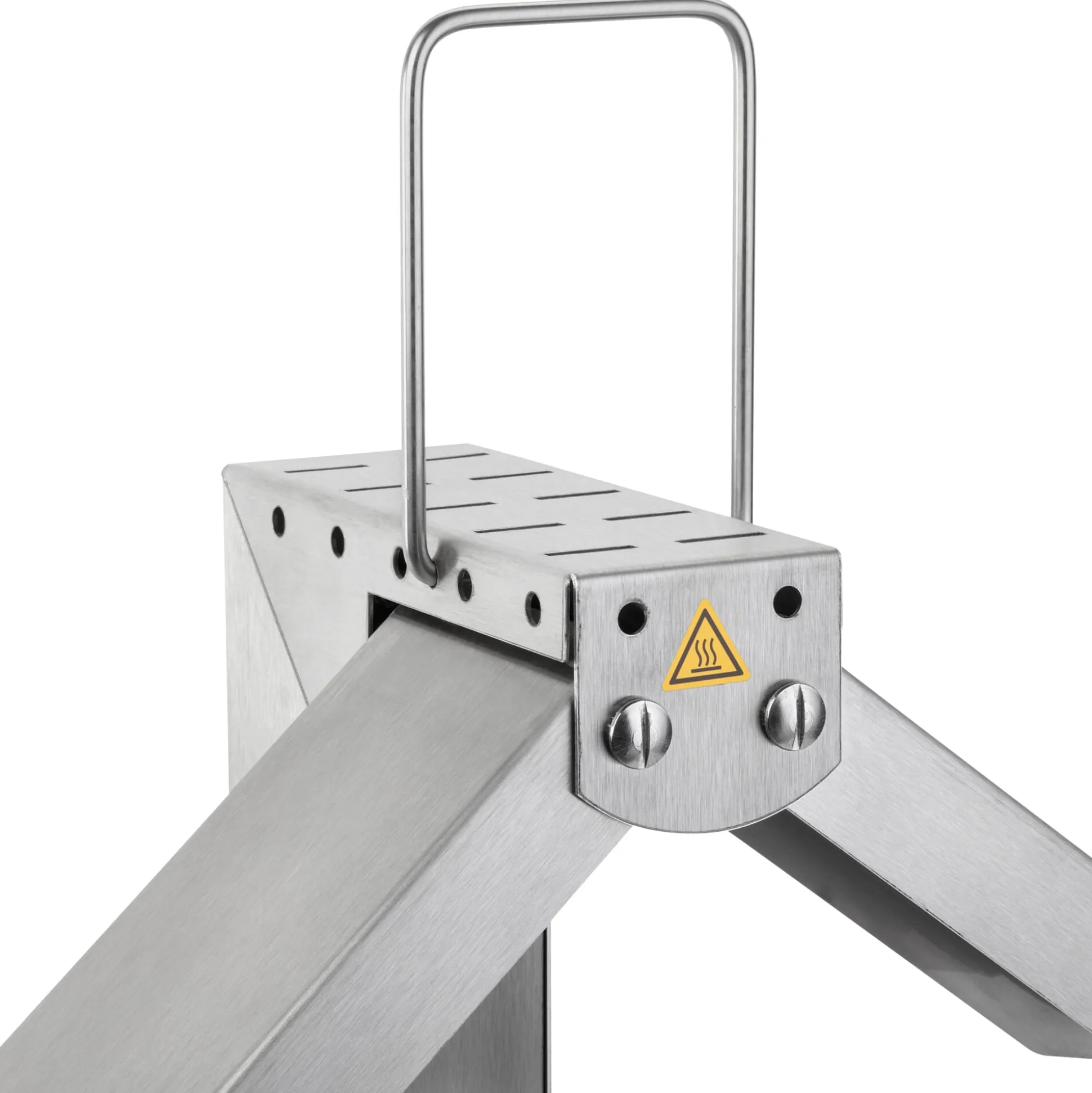 Edelstahlkorpus mit Knöpfen aus Kunststoff und Buchenholz. Käsesitz 19,5 × 17 cm. Aufgestellt H 30 × B 45 × T 19,5 cm, zusammengeklappt H 49,5 × B 20 × T 7 cm. Leistungsaufnahme 900 W. Schutzkontaktstecker. Gesamtgewicht 3,4 kg. Aufheizzeit ca. 10 Minuten.