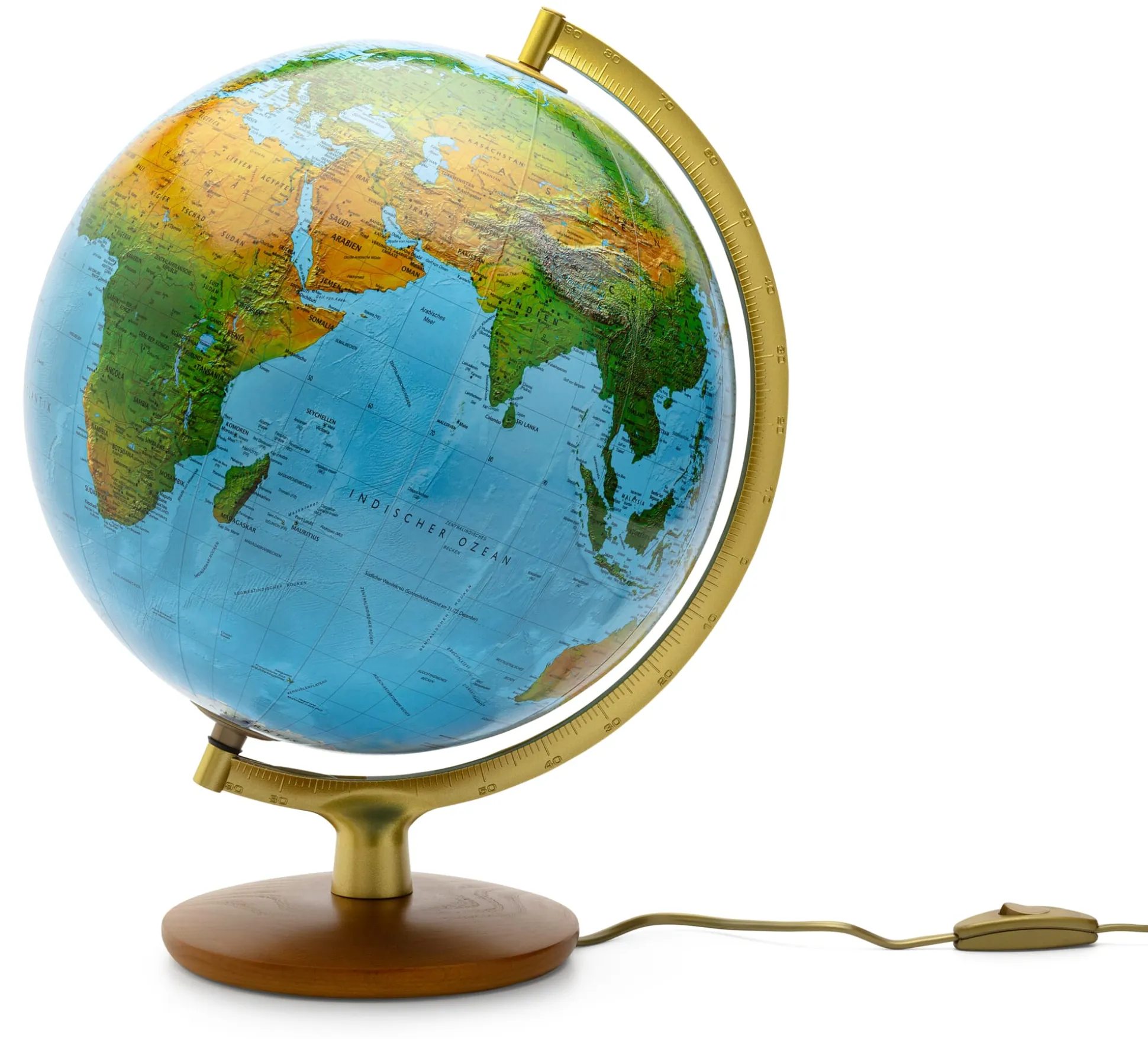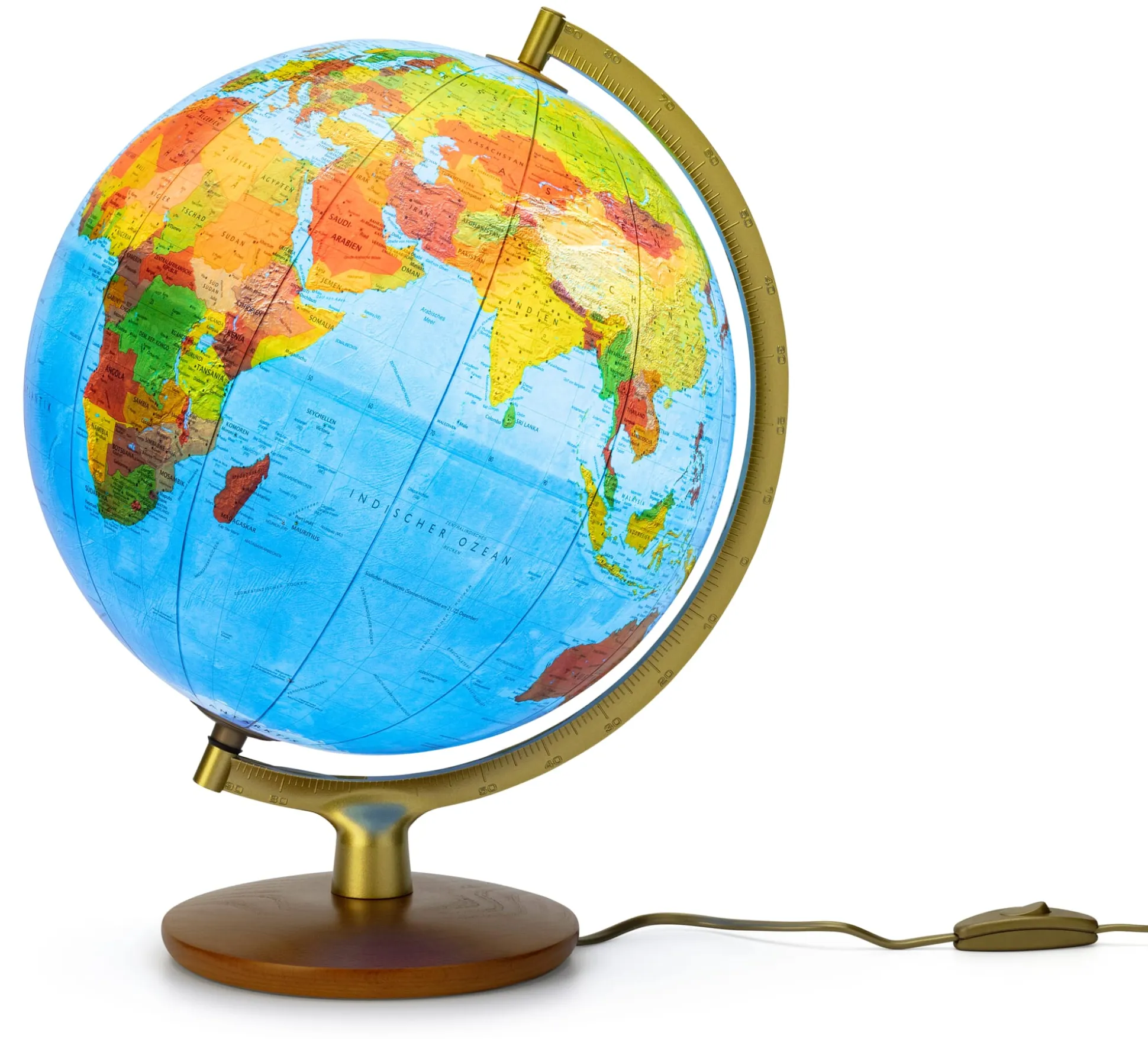 Dieser Kunststoffglobus aus dem Räth Globenverlag zu Leipzig zeigt unbeleuchtet ein physisches Kartenbild mit Angaben zur Vegetation und beleuchtet ein politisches Kartenbild – handkaschiert auf eine Kunststoffkugel von 30 cm Durchmesser.