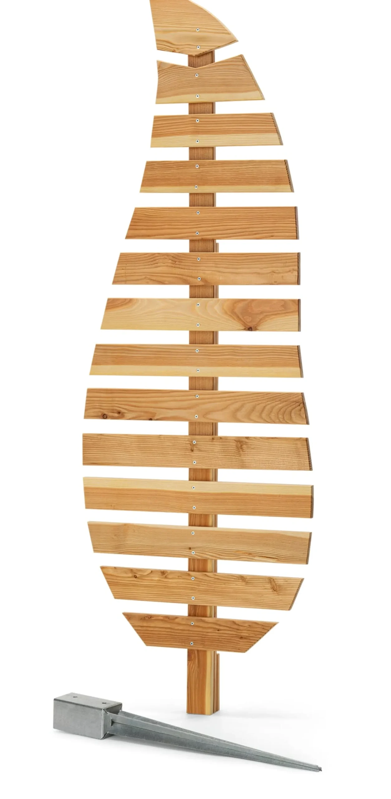 Zurückhaltend und harmonisch fügt sich dieses Gebilde in die gewachsene Gartennatur ein. Rankhilfe und Dekorationsobjekt in einem, findet seine natürliche Blattform gleichermaßen in penibel aufgeräumten wie in naturnah gestalteten, in großen wie in kleineren Gärten ihren angestammten Platz. Schmückend wirkt das Rankobjekt aus dauerhaft witterungsbeständigem Lärchenholz das ganze Jahr über – im Herbst und Winter, wenn die Beete kahl erscheinen, ebenso wie im Frühling und Sommer, wenn Kapuzinerkresse, Prunkwinde, Kletterndes Löwenmäulchen oder Duftwicke daran emporwachsen und ihren bunten Blütenzauber entfalten.