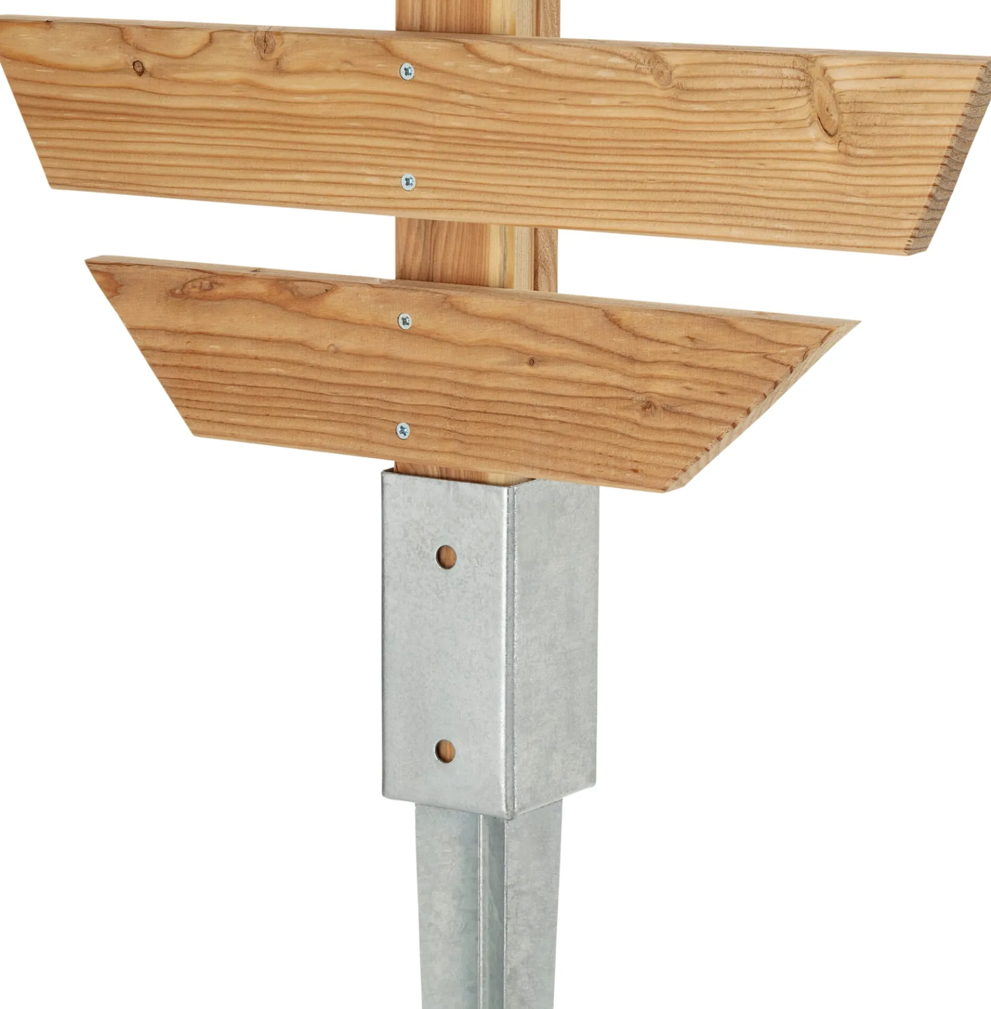 14 Querstreben der Stärke 1,8 cm, ein aus mehreren Teilen bestehender Pfosten. Aufgebaut Höhe 177 cm, Breite 59 cm, Tiefe 6 cm. Inklusive Bodeneinschlaghülse (7 × 7 × 75 cm) aus verzinktem Stahl. Gesamtgewicht 9,5 kg.