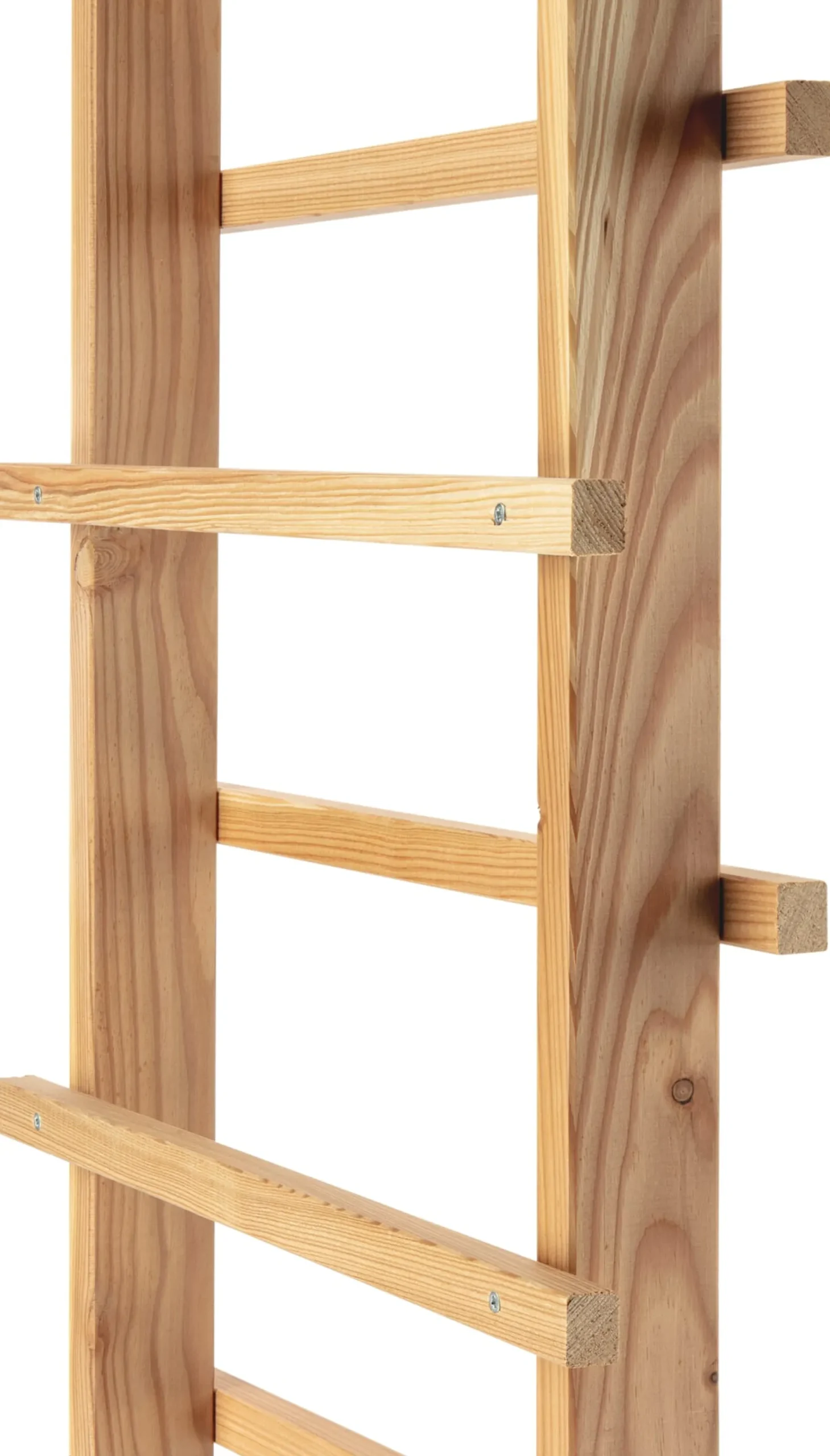 Aus unbehandeltem Lärchenholz (Herkunft Polen, Deutschland). 10 Sprossenleisten à 52 × 2,5 × 2 cm. 2 Basisleisten à 56 × 8 × 2 cm, eine davon mit einer blauen Glasraute als Verzierung. Gesamtmaße aufgebaut: Höhe 177 cm, Breite 56 cm, Tiefe 10 cm. Gesamtgewicht 6 kg.