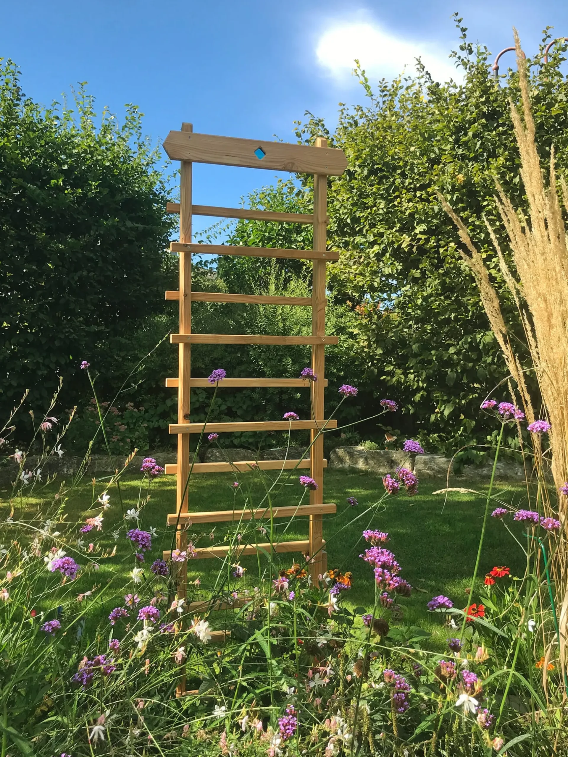 Zurückhaltend und harmonisch fügt sich dieses Gerüst in die gewachsene Gartennatur ein. Rankhilfe und Dekorationsobjekt in einem, findet die schlichte Leiterform gleichermaßen in penibel aufgeräumten wie in naturnah gestalteten, in großen wie in kleinen Gärten ihren festen Platz. Schmückend wirkt das Rankobjekt aus witterungsbeständigem Lärchenholz das ganze Jahr über – vom Frühling und Sommer, wenn Kapuzinerkresse, Prunkwinde, Kletterndes Löwenmäulchen oder Duftwicke ihren bunten Blütenzauber entfalten, bis in die kalte Jahreszeit hinein, wenn die Beete kahl erscheinen und sich die zarten Strahlen der Wintersonne in der zierenden Raute, dem Sonnenfänger, aus Glas im oberen Querholm bricht. Das Besondere: Der Entwurf dieses Leiterobjekts folgt dem Harmonieprinzip des Goldenen Schnitts. Wir wissen: Der Goldene Schnitt steht für das festgelegte Verhältnis von zwei Teilstrecken einer Gesamtstrecke zueinander; in diesem Fall das Verhältnis vom Abstand zwischen den Sprossen zum Abstand der Pfosten voneinander. Die Sprossen werden versetzt montiert: eine vorn, eine an der Rückseite und so weiter.