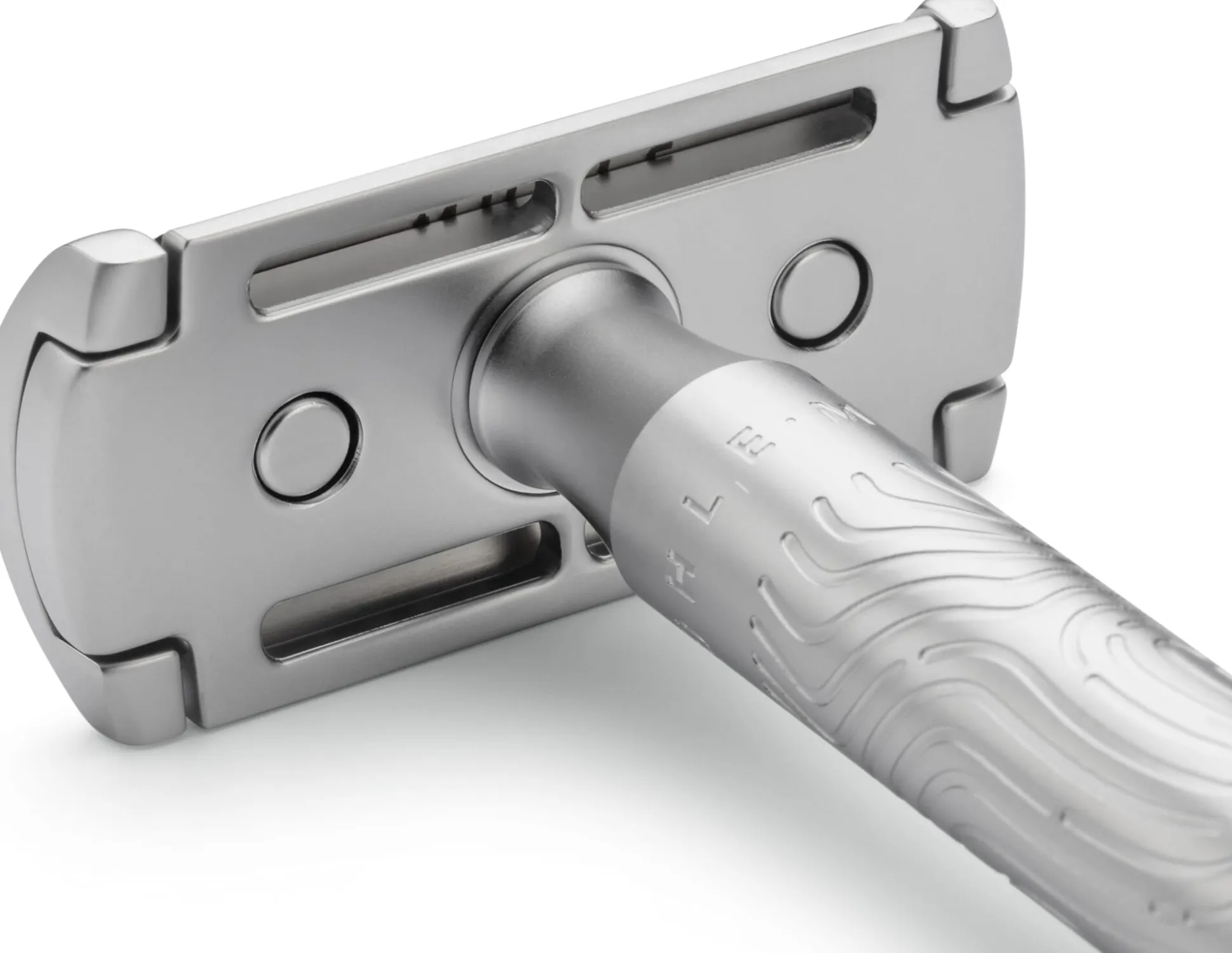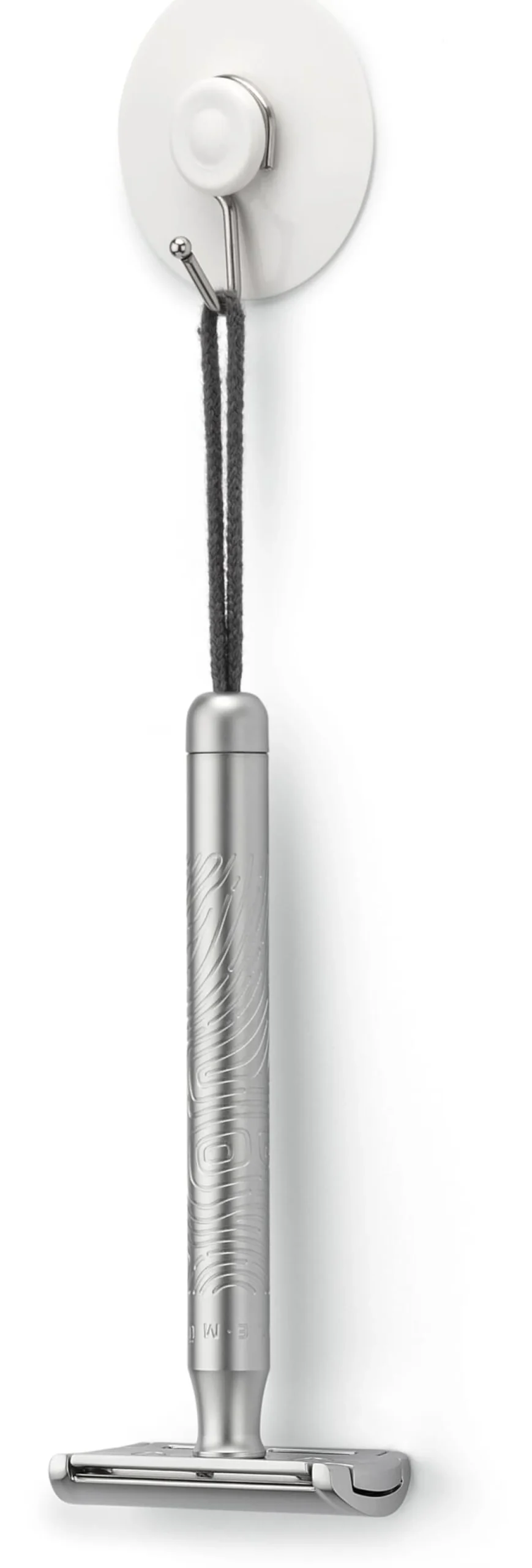 Dreiteiliger Rasierhobel. Griff aus Edelstahl, Hobelkopf aus Zinkdruckguss, beides matt verchromt. Austauschbare Aufhängeschlaufe aus Baumwollkordel. Lieferung mit einer Rasierklinge.