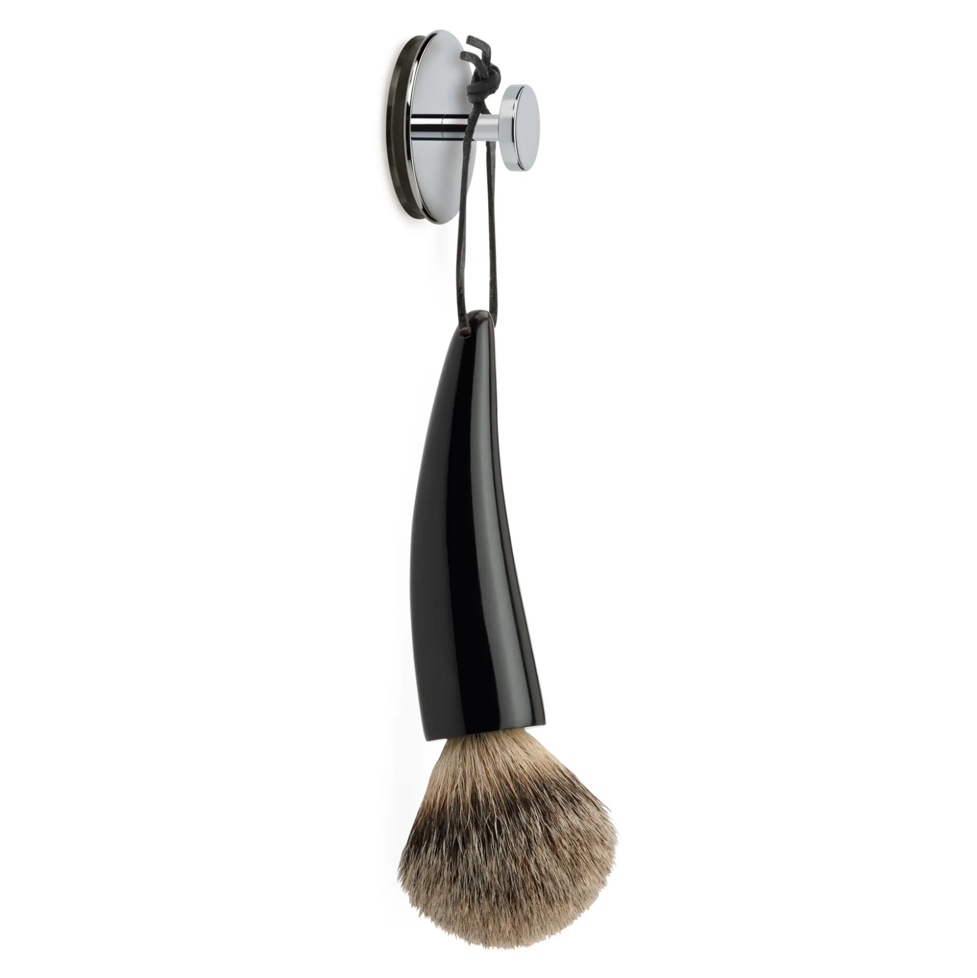 Für den Griff dieses Rasierpinsels wird die Hornspitze südafrikanischer Büffel verwendet. Er ist von Hand fein geschliffen und sauber poliert. Damit der Rasierpinsel zum Trocknen aufgehängt werden kann, ist er mit einer Lederschlaufe versehen. Der Besatz besteht aus feiner Dachshaar-Silberspitze.