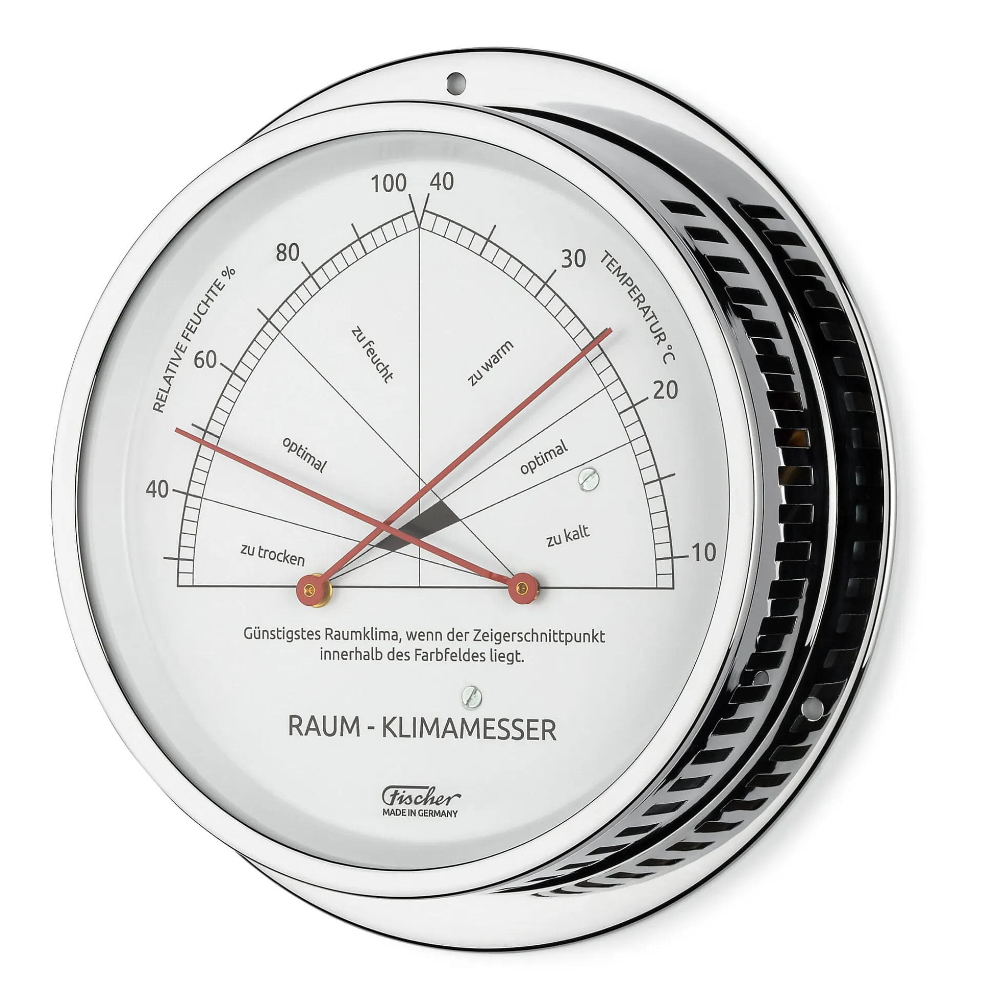 Das Raumklima beeinflusst maßgeblich das Wohlbefinden beim Wohnen und Arbeiten. Entscheidend sind dabei die richtige Temperatur und eine optimale Luftfeuchte. Zimmertemperaturen von 18 bis 22 °C sowie eine Luftfeuchte im Bereich von 40 bis 70% werden – abhängig von der Raumnutzung – als optimal für ein behagliches und gesundes Raumklima angesehen. Dieser mechanische Raum-Klimamesser gibt über beide Messgrößen Auskunft. Er enthält ein hochwertiges Synthetik-Haarhygrometer und ein Bimetall-Thermometer, mit denen er gleichzeitig die relative Luftfeuchte und die Temperatur misst; der Schnittpunkt beider Zeiger gibt Auskunft über die Qualität des Raumklimas. So sehen Sie mit einem Blick, ob die Bedingungen bei Ihnen optimal sind, oder ob es zu warm, zu kalt, zu trocken oder zu feucht ist. Der Raum-Klimamesser ist für Innenräume aller Art geeignet.