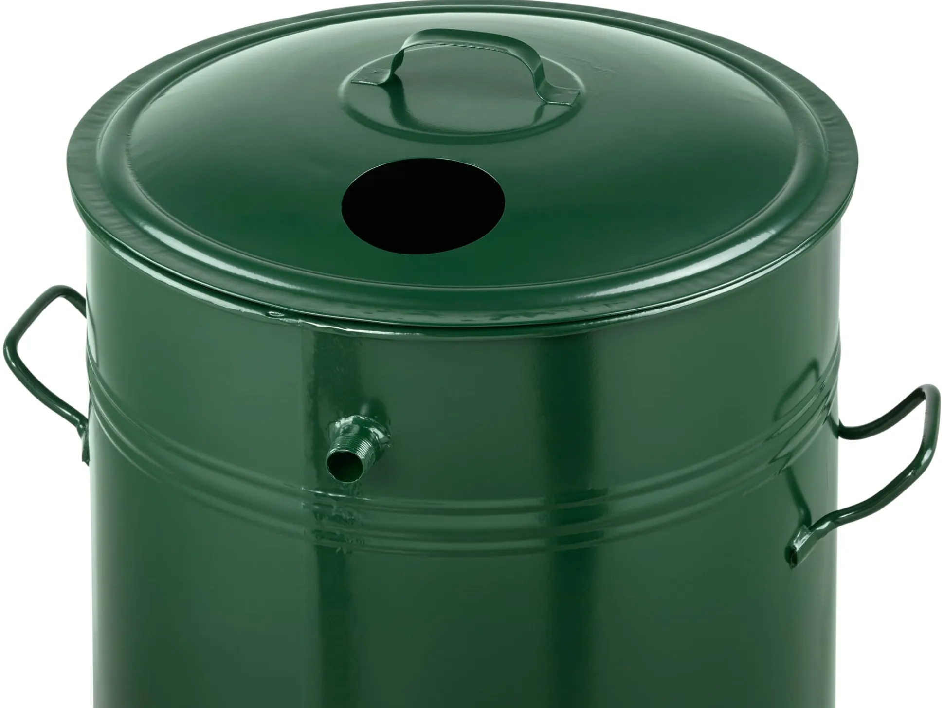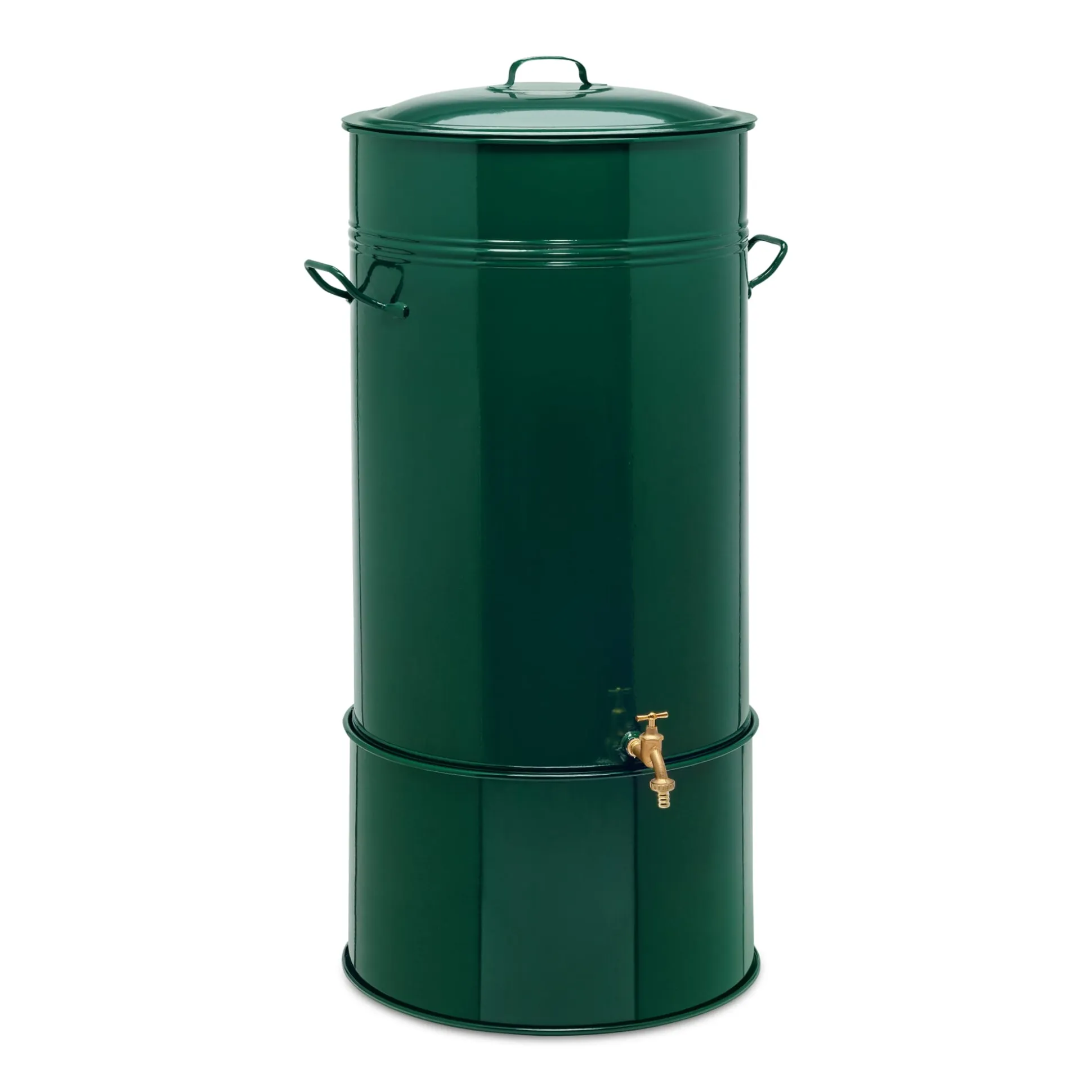 Tonne mit Deckel, Hahnanschluss und Überlauf. Stahlblech feuerverzinkt und tannengrün pulverbeschichtet (RAL 6009). Aussparung im Deckel (Ø 10 cm) für den Anschluss ans Fallrohr. Tonne innen Ø 50 cm, außen Ø 52 cm. Breite (mit Griffen) 65 cm. Höhe ohne Deckel gemessen 84 cm, mit Deckel gemessen 93 cm. Gewicht 15 kg. Fassungsvemögen 150 Liter. Lieferung inklusive Messinghahn (½“) mit Schlauchtülle. Hergestellt in Deutschland.