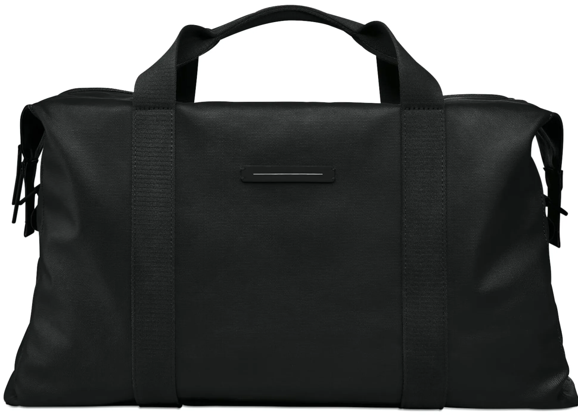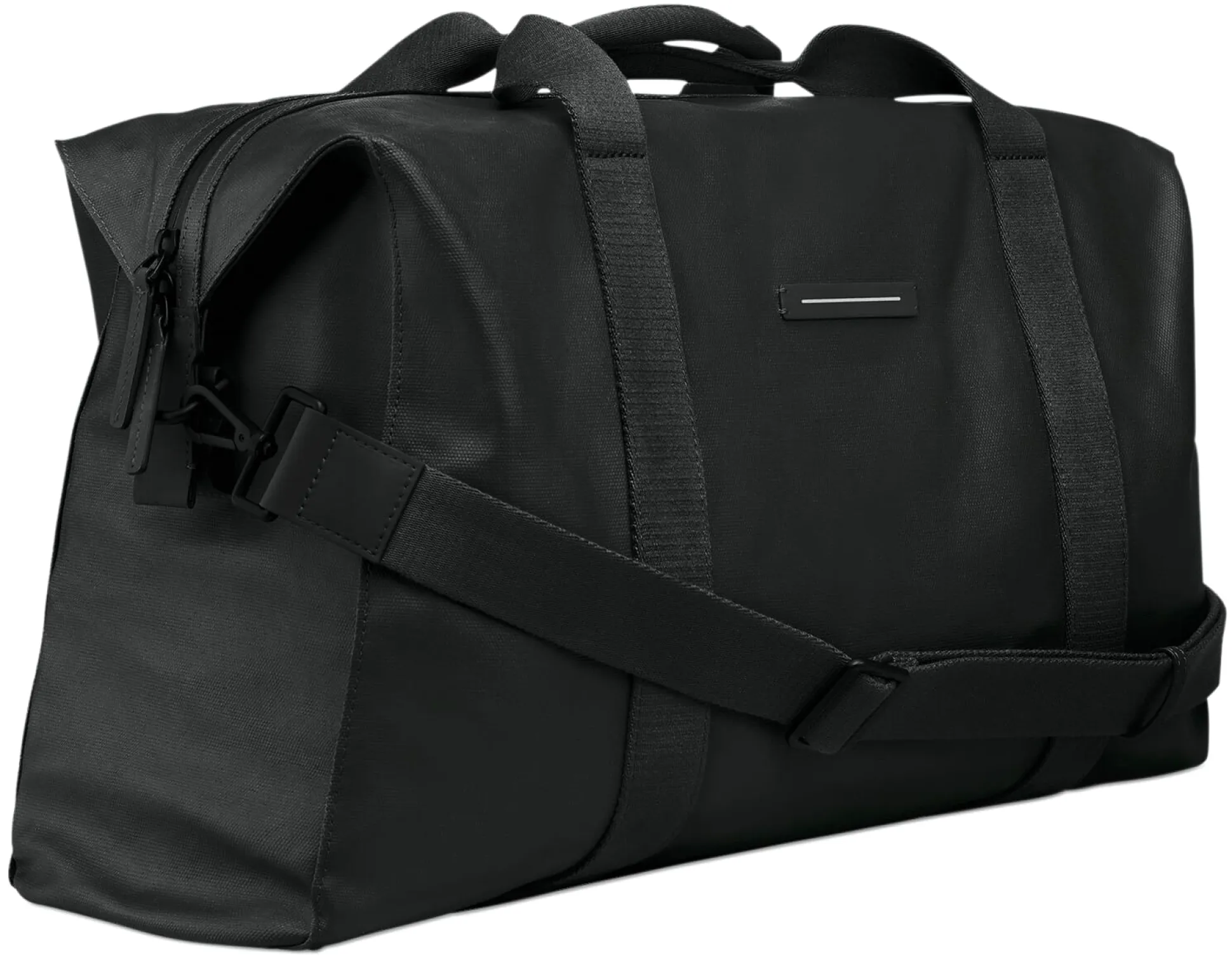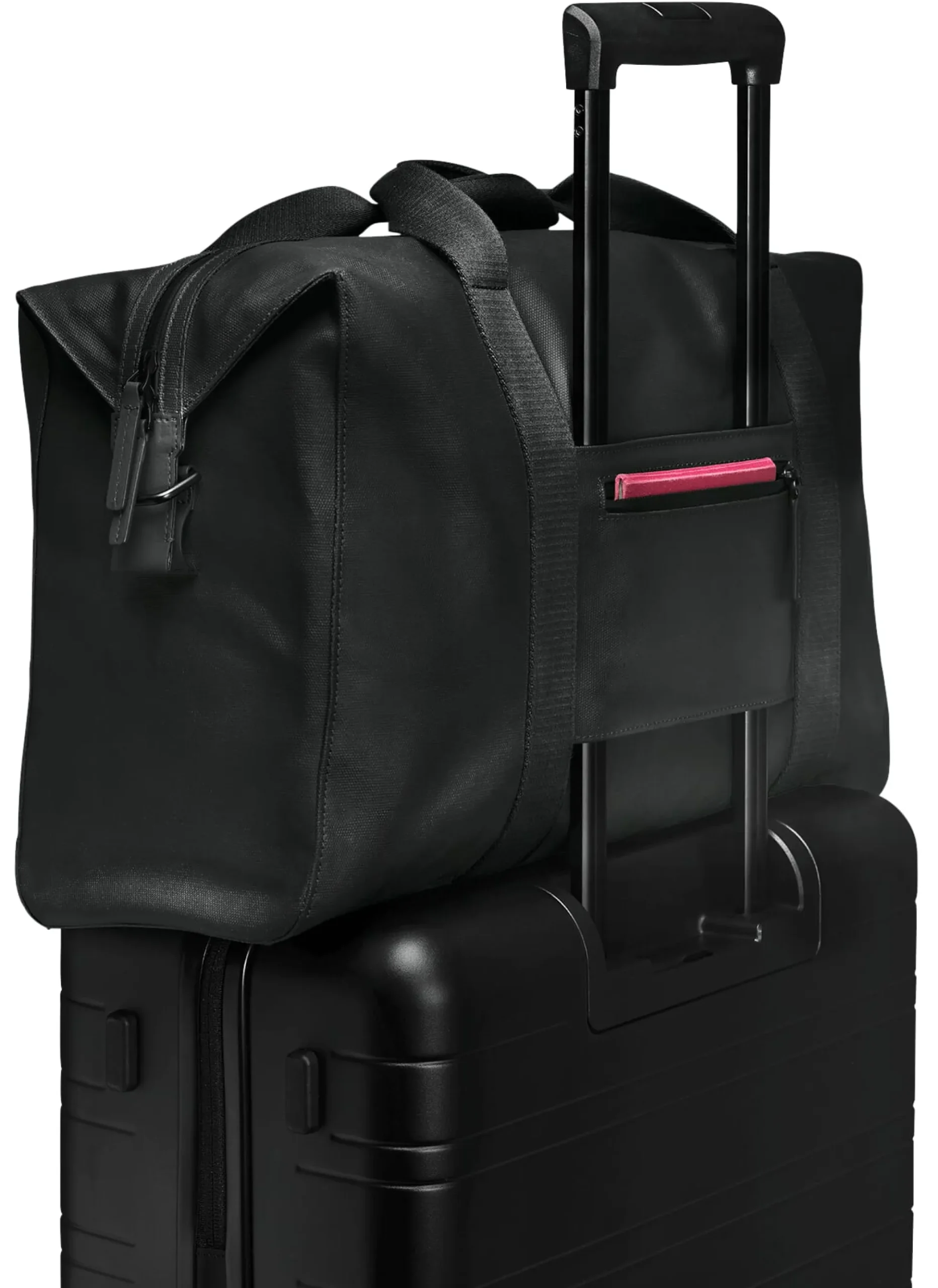 Leichte und große Reisetasche aus wasserabweisendem Baumwollcanvas. Separate Fächer innen und außen zur Unterbringung von Reiseunterlagen und Wertsachen. Gepolsterte Tragegriffe und abnehmbarer, verstellbarer Schultergurt aus beschichteter Baumwolle. Mit kleinen Metallfüßen zum Schutz der Unterseite.