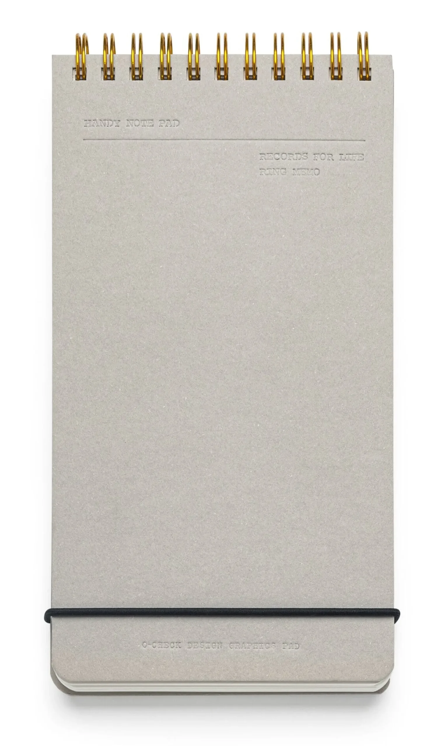 Hochformatiger Reporterblock mit Spiralbindung aus vermessingtem Stahl und Gummiband. 100 Blatt (200 Seiten) zartweißes Naturpapier (80 g/qm). Mit verschiedenen Lineaturen: blanko, randabfallend liniert (Linienabstand 8 mm) und Punktraster (Punktabstand 5 mm). Hergestellt in Südkorea.
