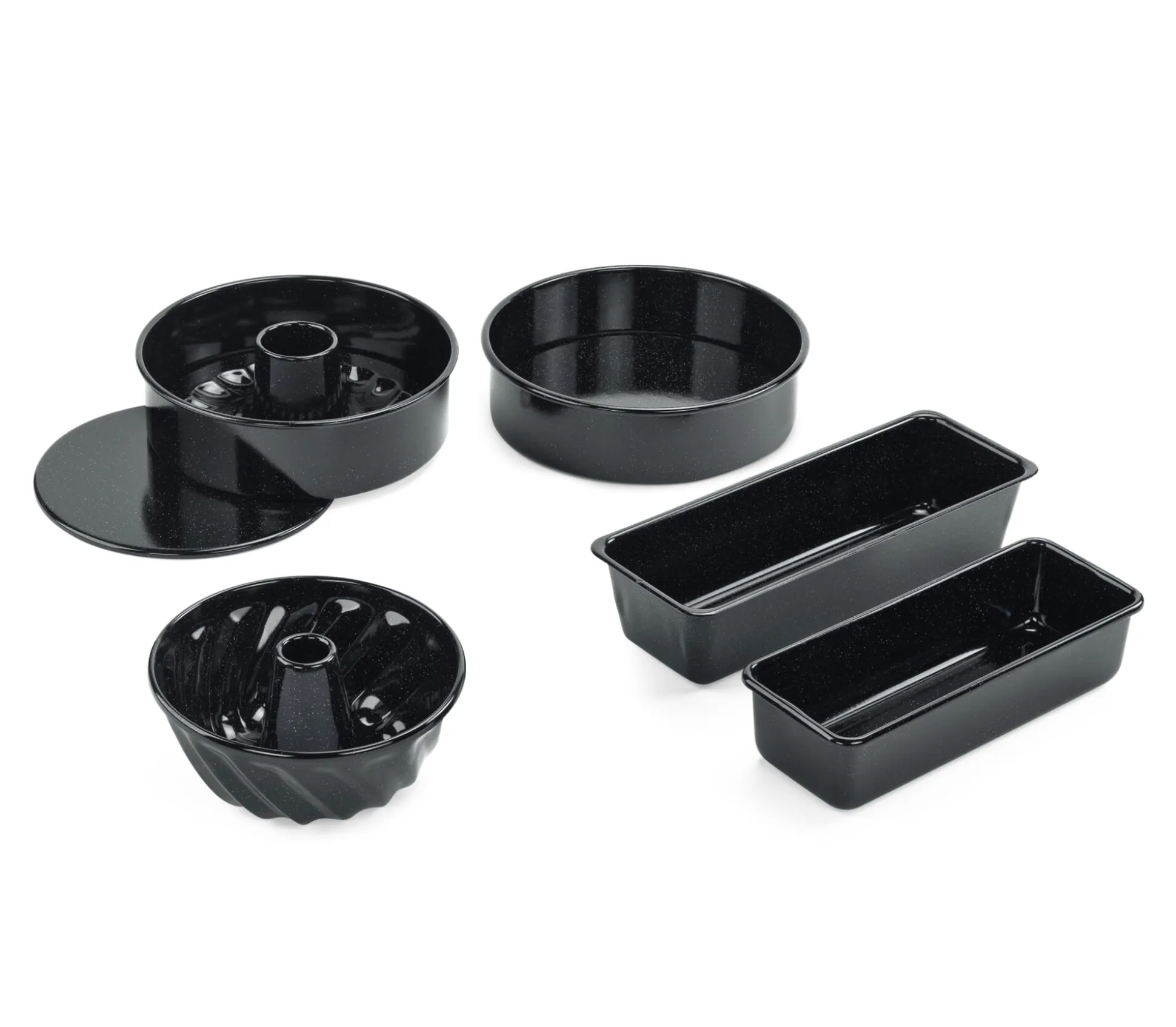 Diese Formen sind aus Eisen (Materialstärke 0,7 mm) mit einer sorgfältigen Emaillierung innen wie außen (0,3 mm stark). Sie sind nahtlos gezogen, was sowohl der Haltbarkeit als auch dem Backergebnis dient, und außerdem schnitt- sowie kratzfest. Aus Österreich.
