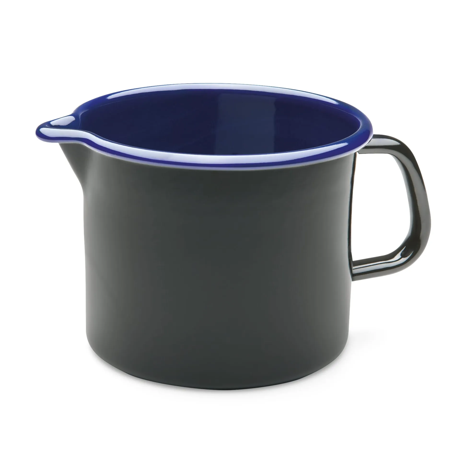 Historisches Profi-Kochgeschirr. Der in Form und Farbe traditionelle Milchtopf: innen kobaltblau, außen schwarz.